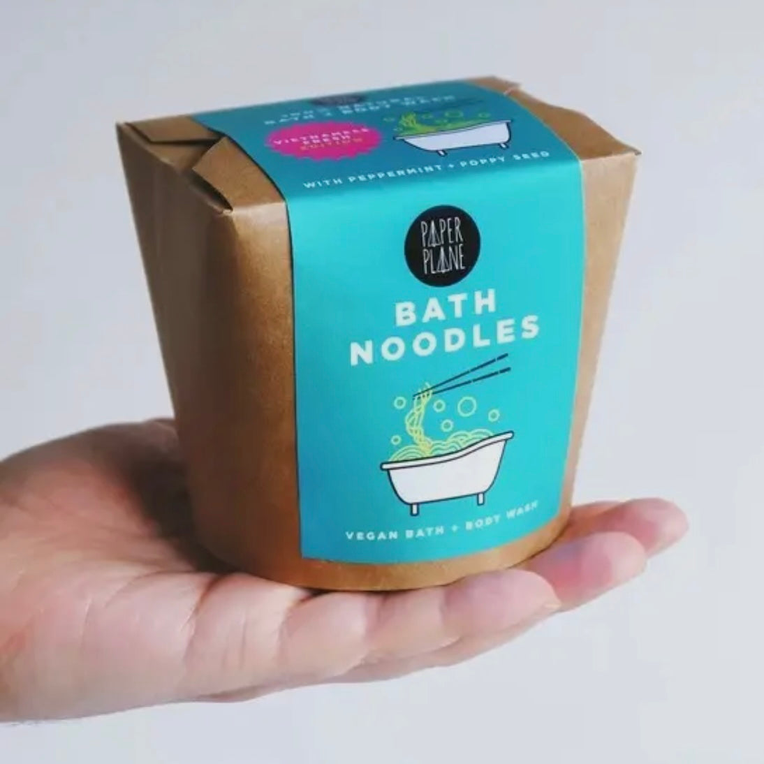 100% natural, vegan bath noodles in plastic-free biodegradable packaging. A unique edition to spice up bath time. Turn your bath into a giant bowl of ramen with our bath noodles! TWO aromatic blends: Tangy Thai and Vietnamese Fresh. . All contain a natural exfoliant to smooth your skin, and are packed with natural oils to moisturise and cleanse. Simply take a pinch of bath noodles and rub into wet skin for a bath or shower time treat. A perfect plastic-free, natural, vegan, sustainable eco-friendly gift. Each box contains approx 95g of bath noodles They make great gifts for teenagers as well as general bath gifts.