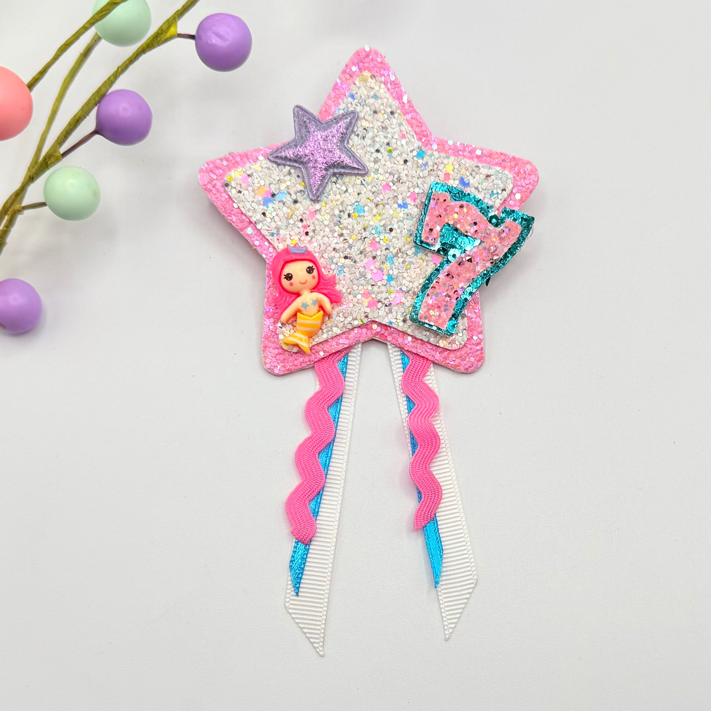 The fluffiest of bows with a cute Mermaid embellishment, all teamed with great fabrics and ribbons. Please leave your age in the section available.