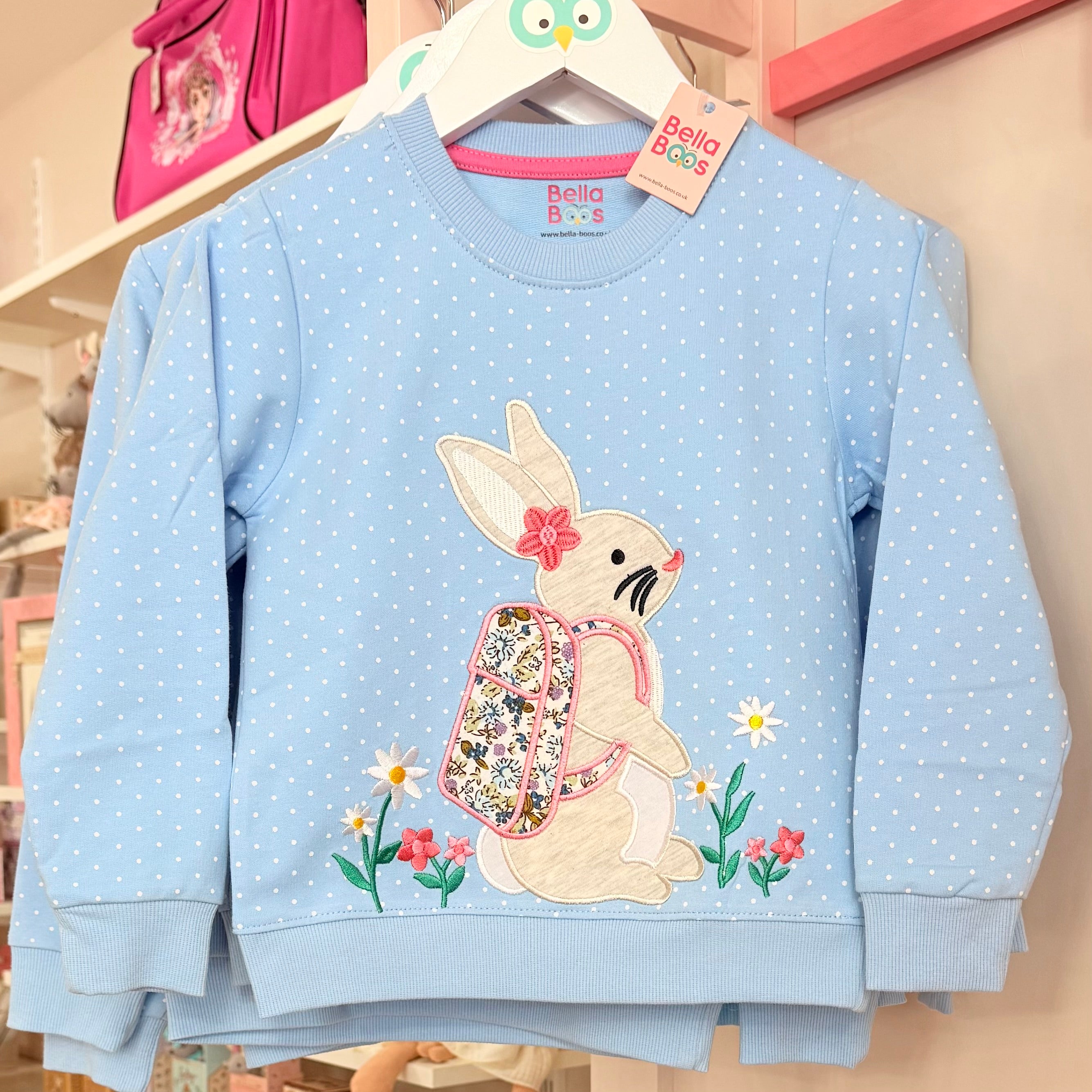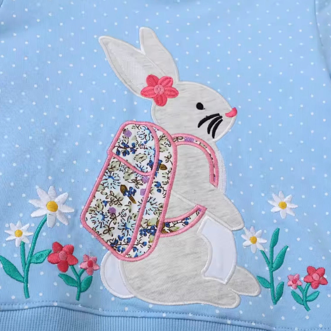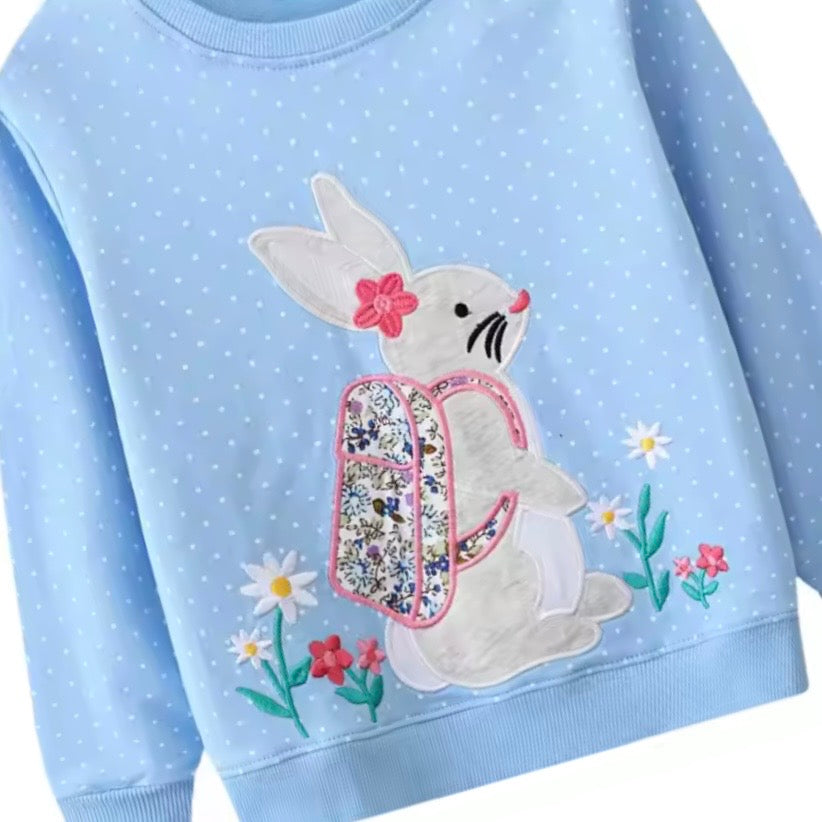 A beautiful, long sleeved jumper in a pretty baby blue colour with a cute embroidered Bunny design to the front.