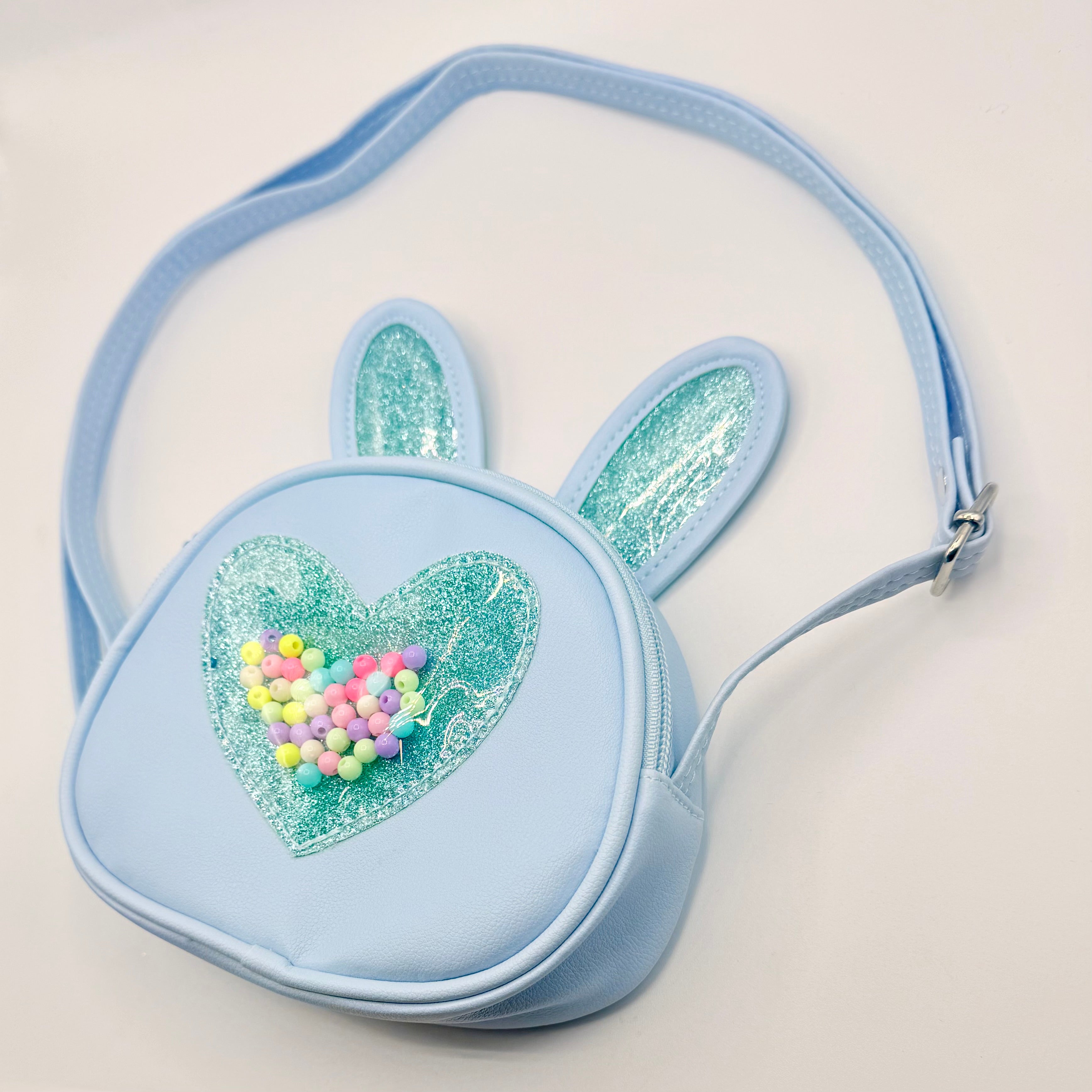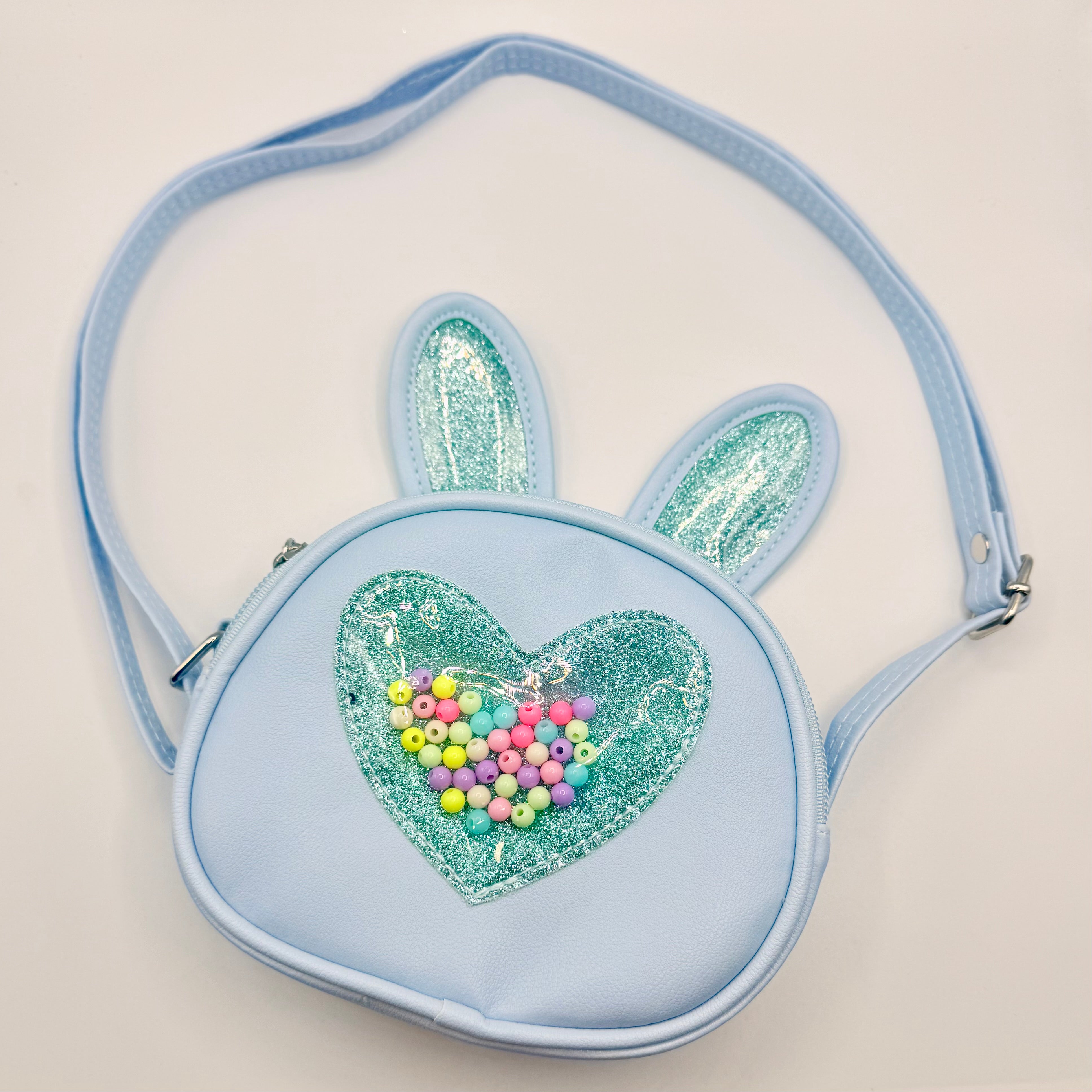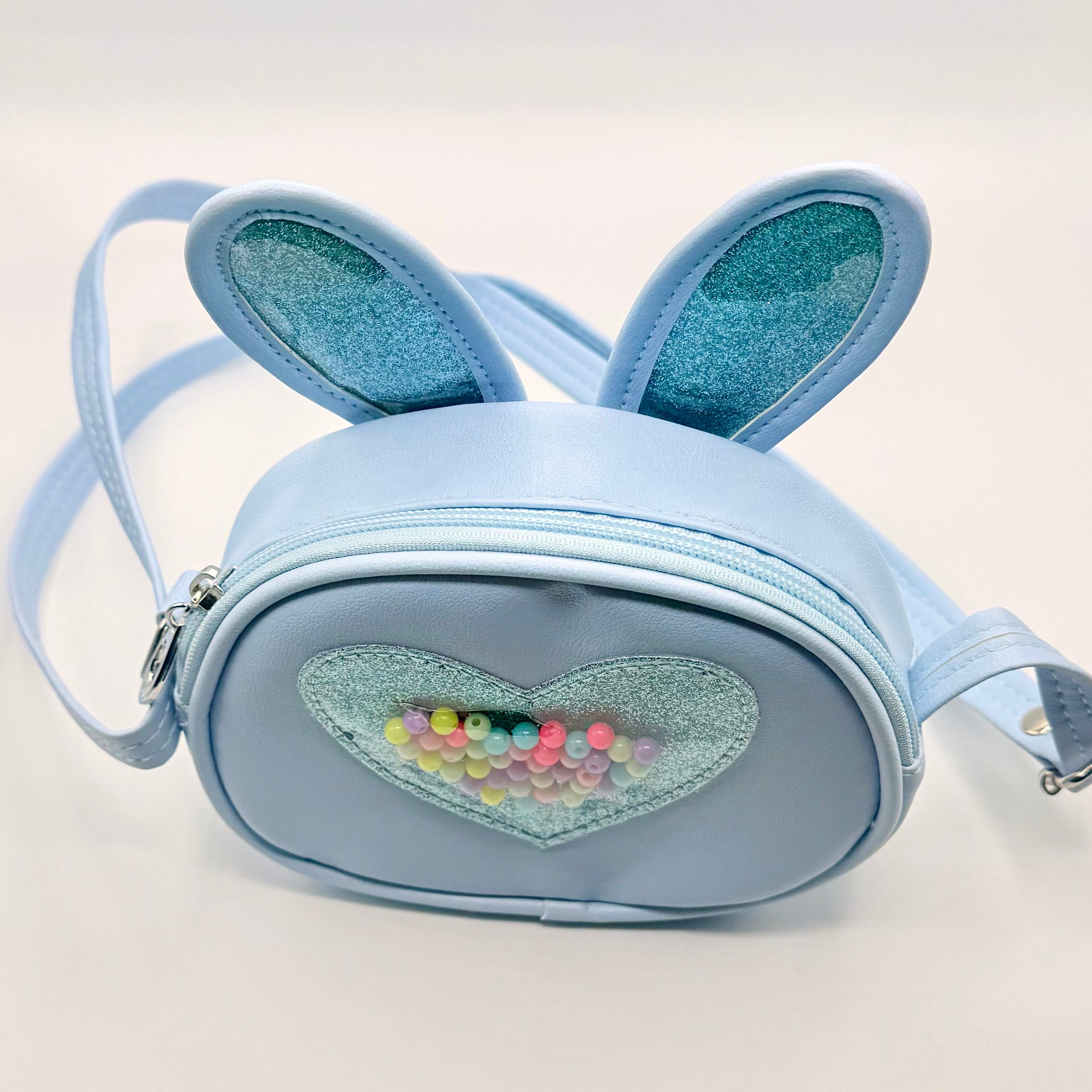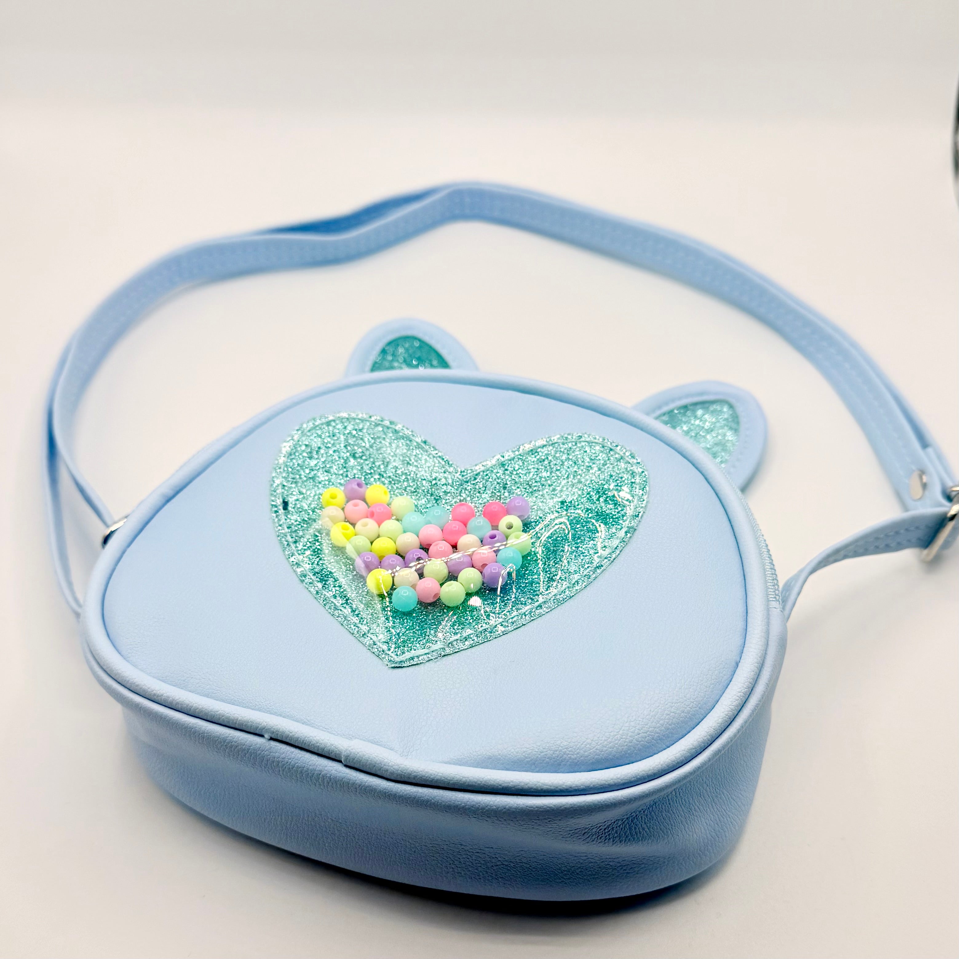 With an adjustable strap and zip opening/closing. In a lovely soft baby blue colour with added glitter ears and a glitter heart to the front that is filled with multi coloured beads for a sprinkle of fun.