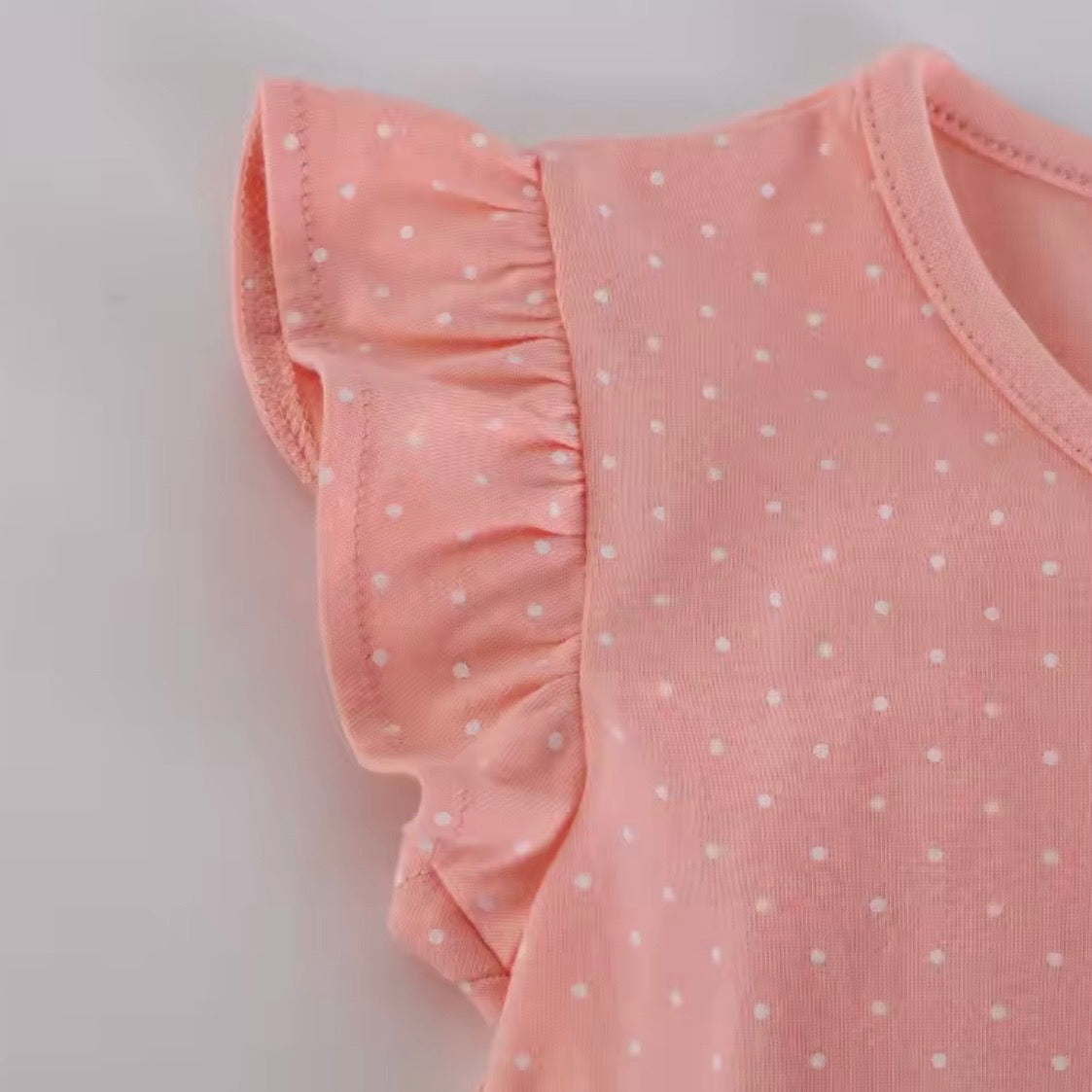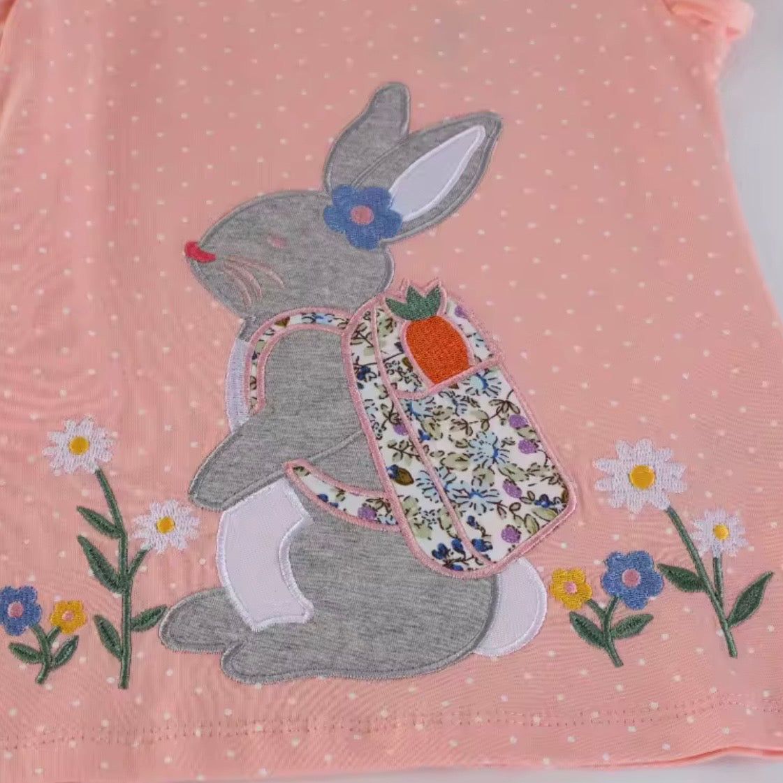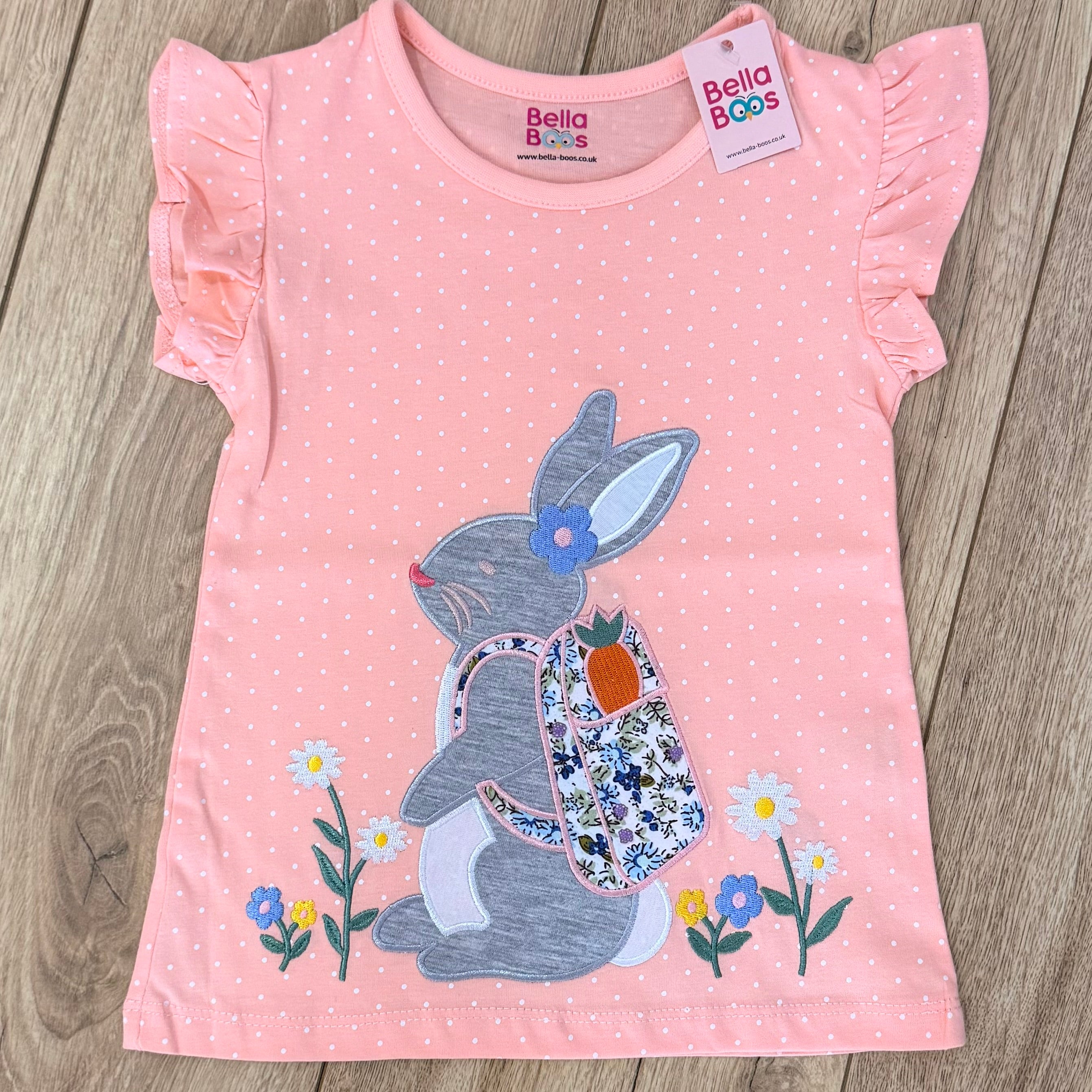 The perfect addition to any wardrobe. In a pretty soft peach colour with a polka dot pattern throughout and finished with the sweetest, embroidered Bunny to the front.