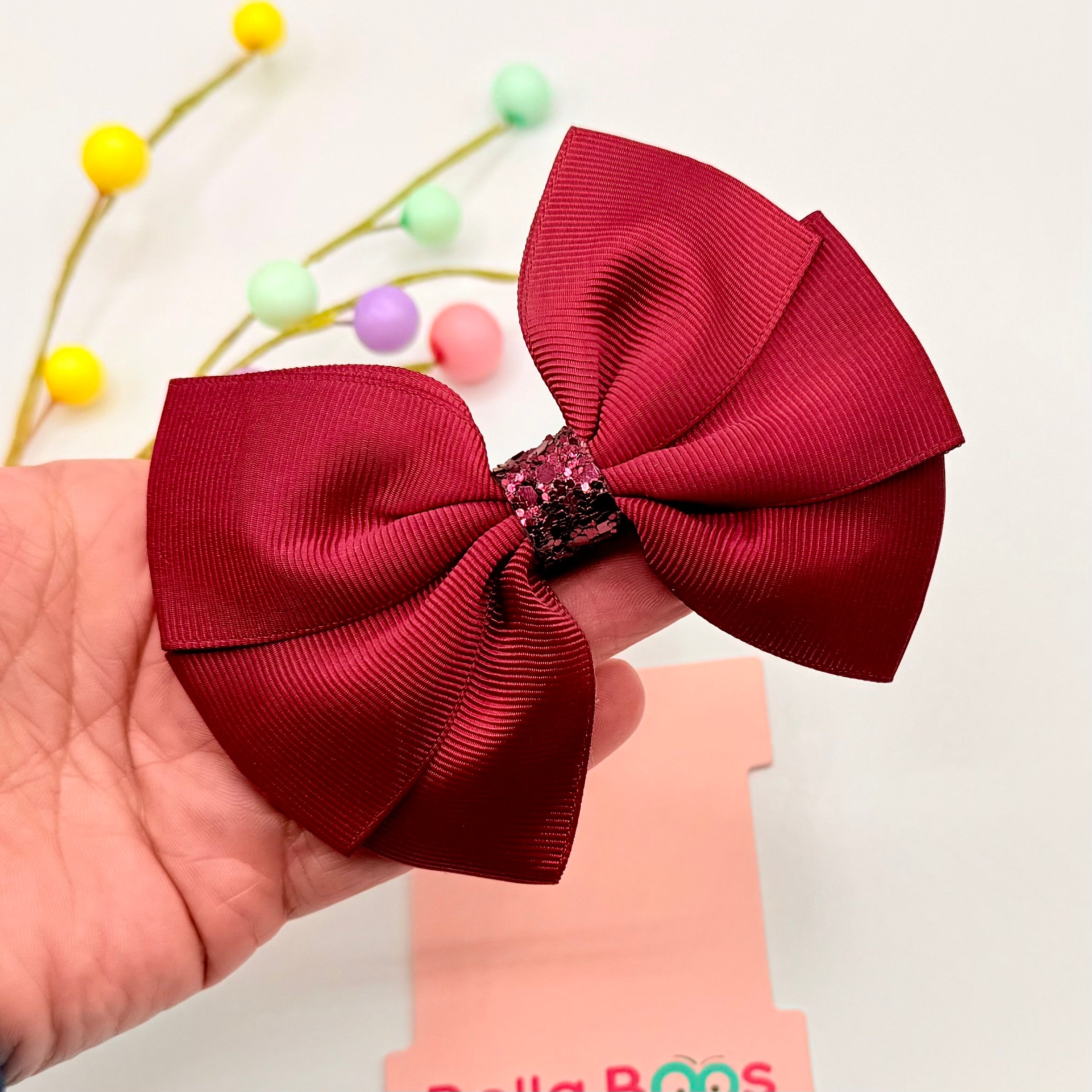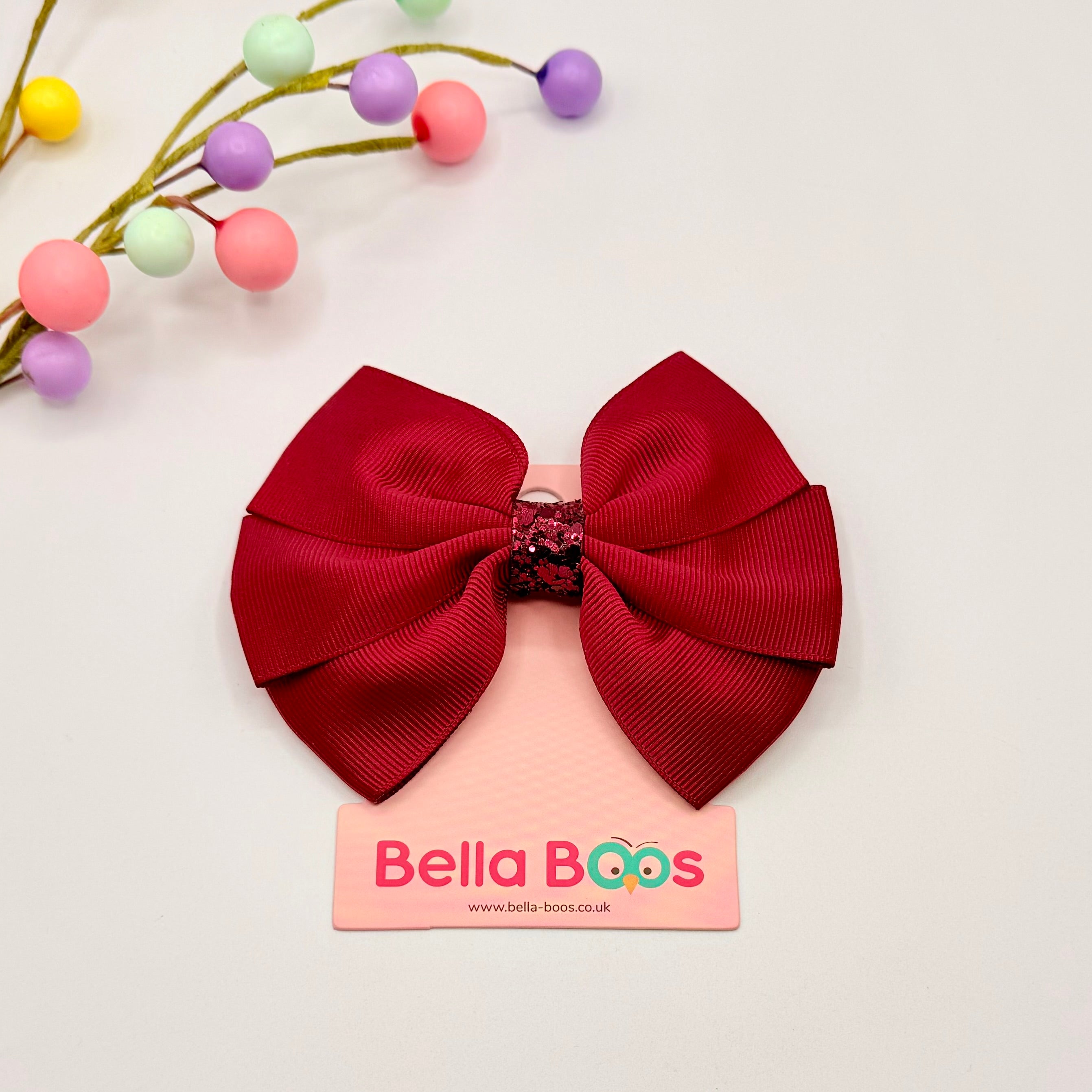 A lovely ribbon hair bow with a sparkly glitter center. Fitted with a crocodile clip to the underside for a firm hold. Size is approx 11cm across.