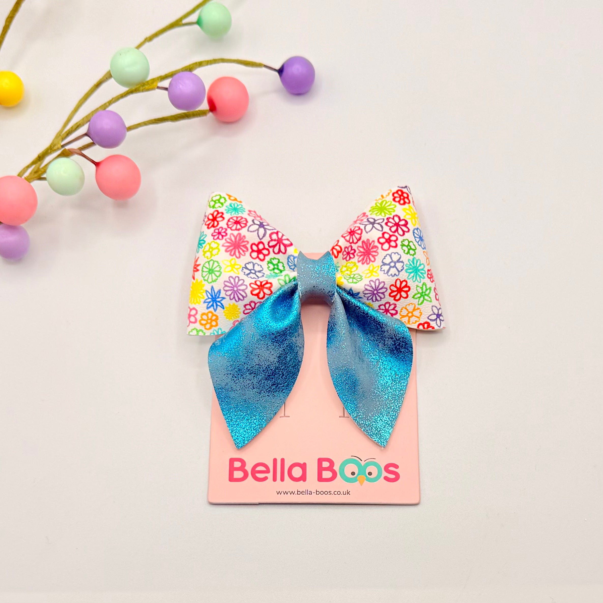 A lovely shaped hair bow, made in a mix of great fabrics and fitted with a crocodile clip to the underside for a secure hold.