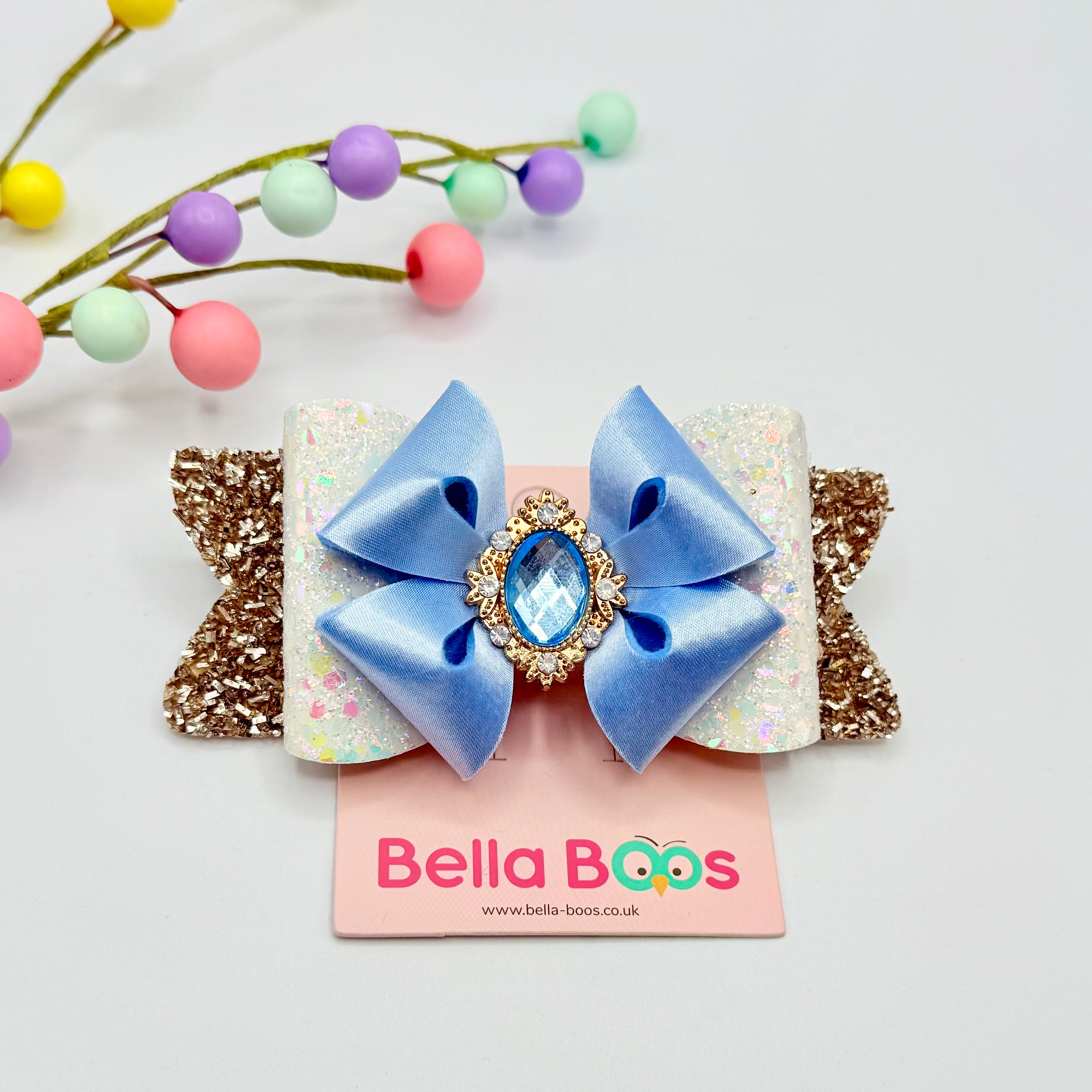 From our Deluxe range, a larger sized hair bow made in a mix of beautiful fabrics and finished with a stunning gem embellishment. Size approx 12 by 7cm.
