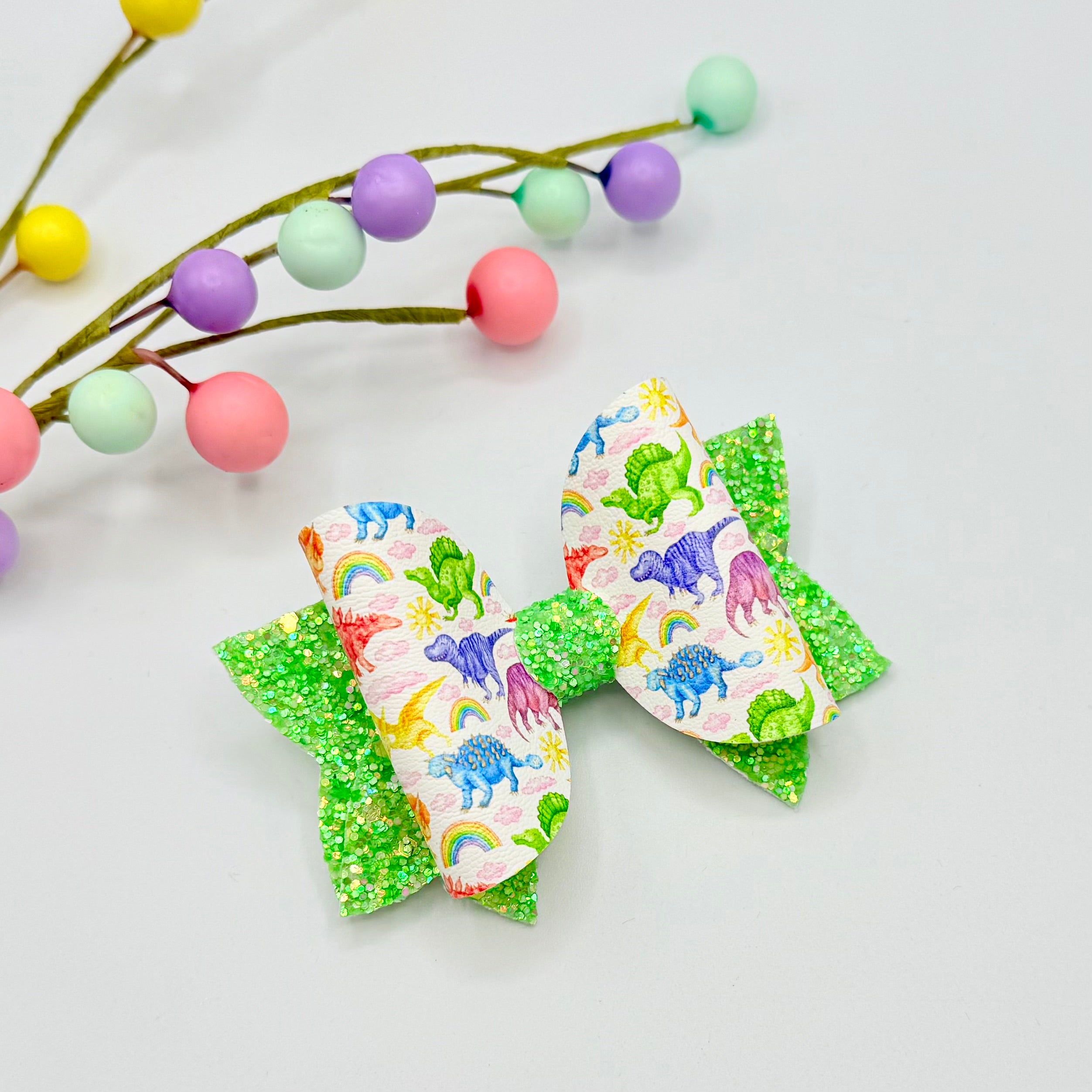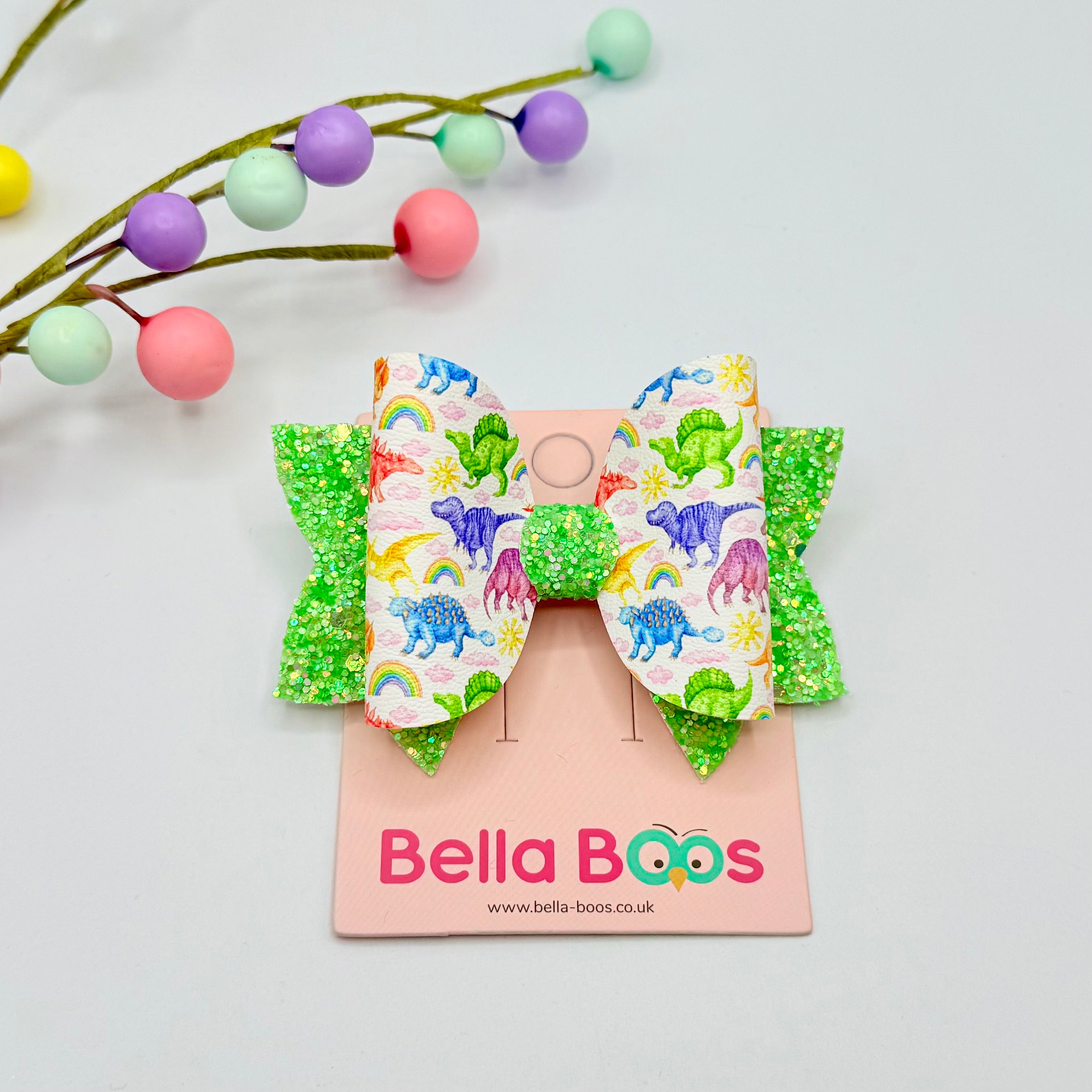 Full of colour and sparkles, this cute hair bow is sure to be a hit with all who love Dinos. Size approx 9 by 7cm