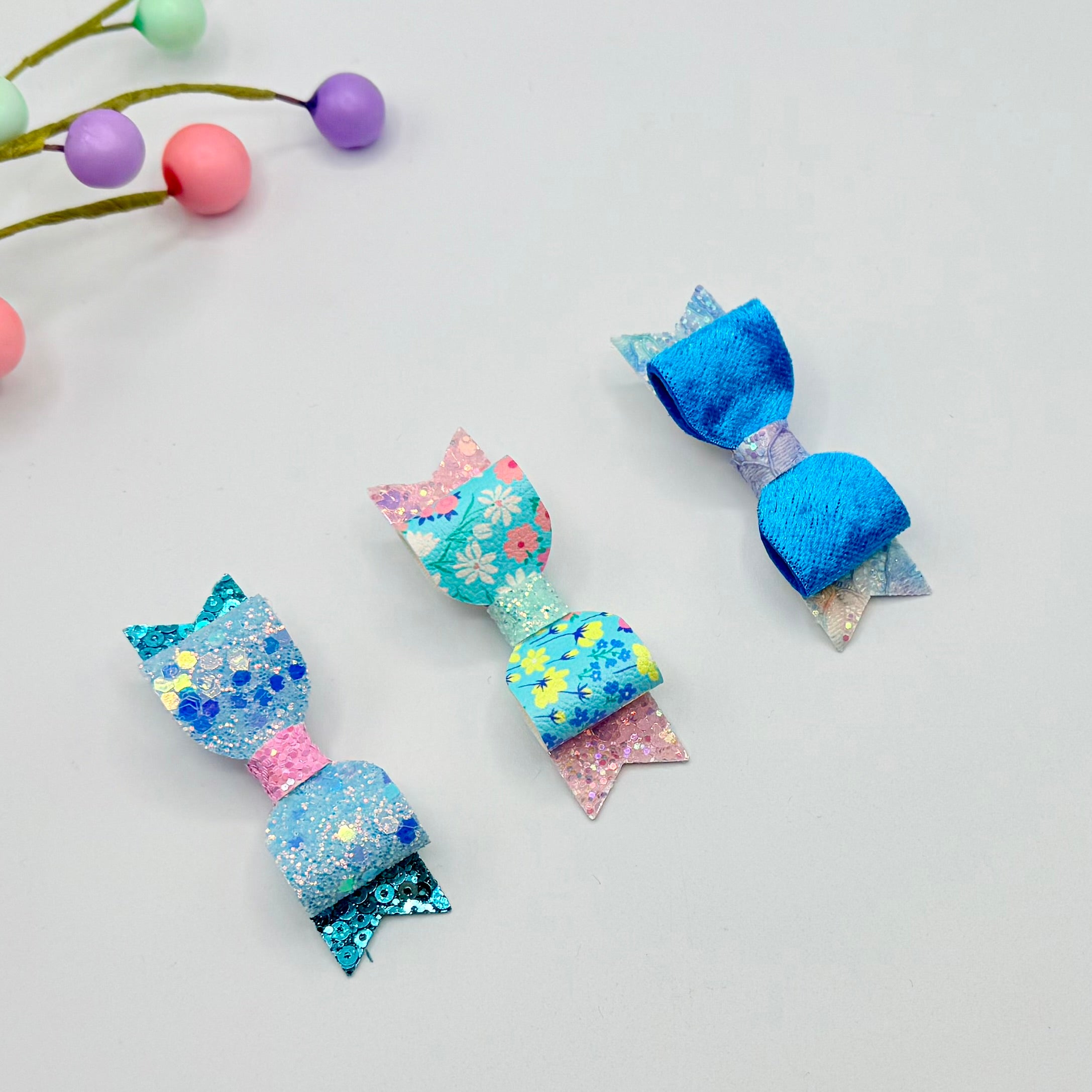 A set of 3 pretty hairs bows, all made in lovely fabrics, all fitted with crocodile clips and each approx 6.5 by 2cm.