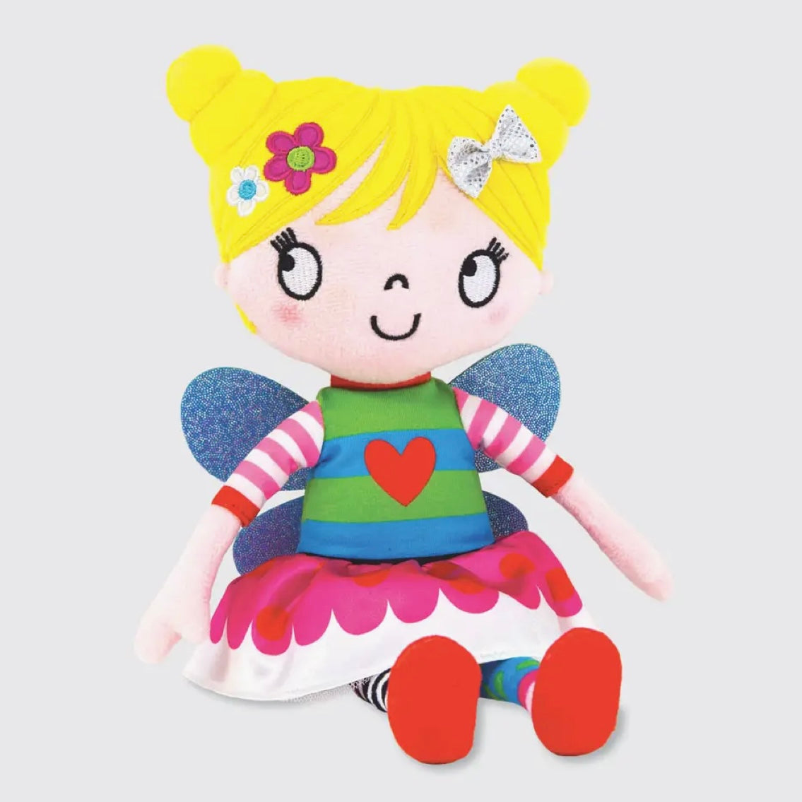 Mary the fairy. I am fast and funny, happy and lucky. I love glitter and sparkle and baking fairy cakes with a special sprinkling of fairy dust. Always remember..' Be lovely and sparkle'. A large plush character. Each doll has been made to the highest standard with a mix of textured fabrics to suit the character and the multicolored embroidery adds extra attention to detail. Suitable from birth. Size: approx. Height 32 cm. suitable from birth.