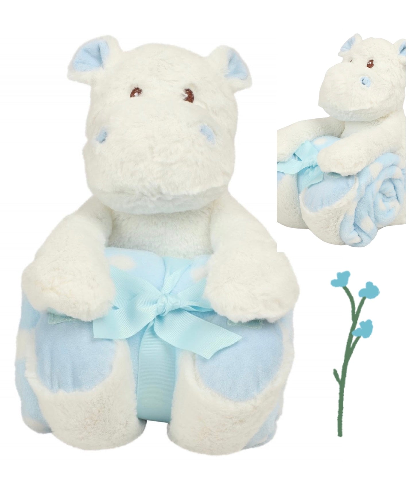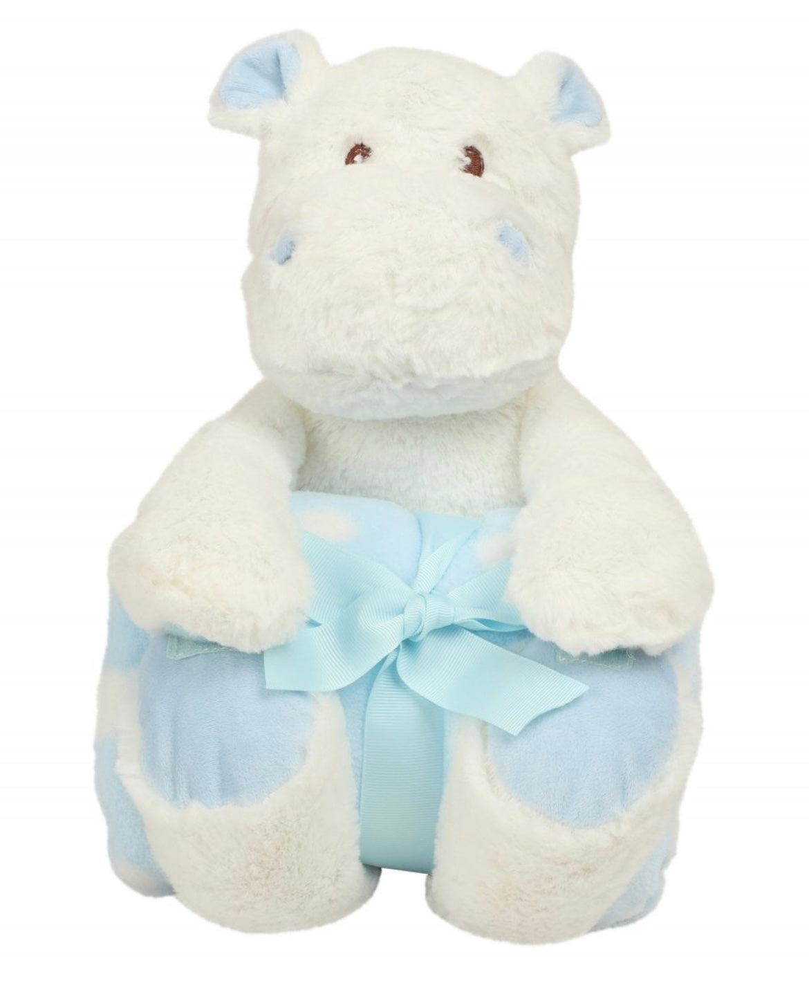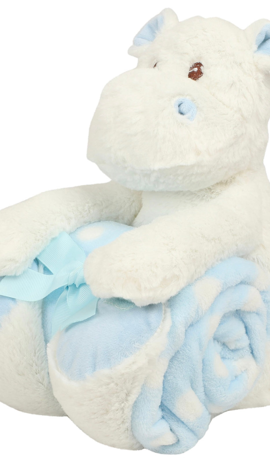 The hippo has contrast pink or blue feet, ears and nose. The blanket is a soft lightweight printed fleece in a blue or pink with white spots and is 87x73cm.