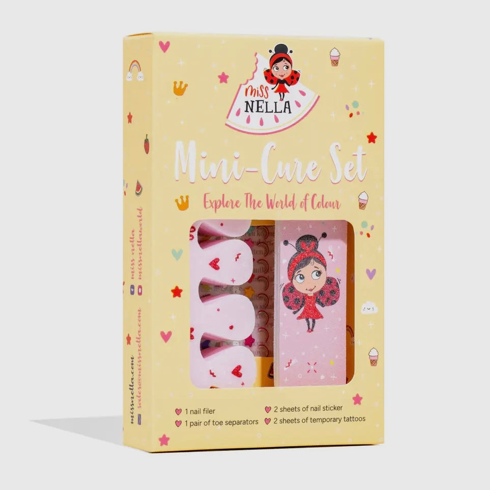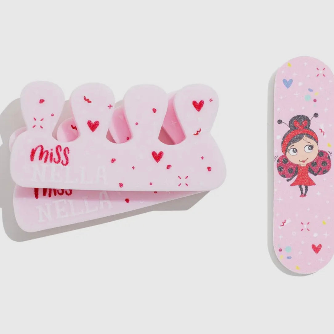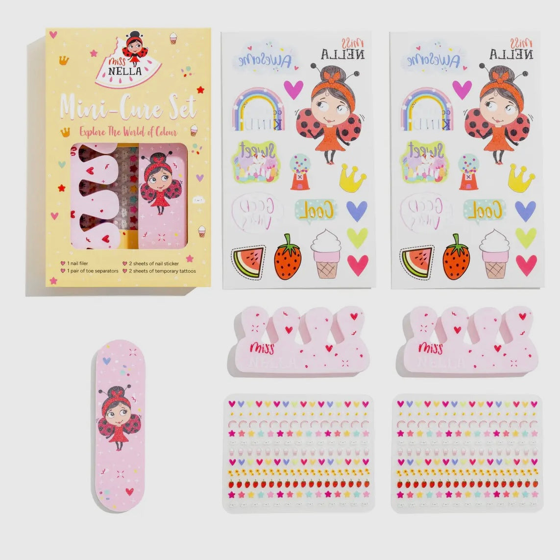 Miss Nella branded nails and accessories kit includes one nail filer, a pair of toe separators, two lots of fun nail stickers, and two sheets of temporary tattoos in assorting sizes.