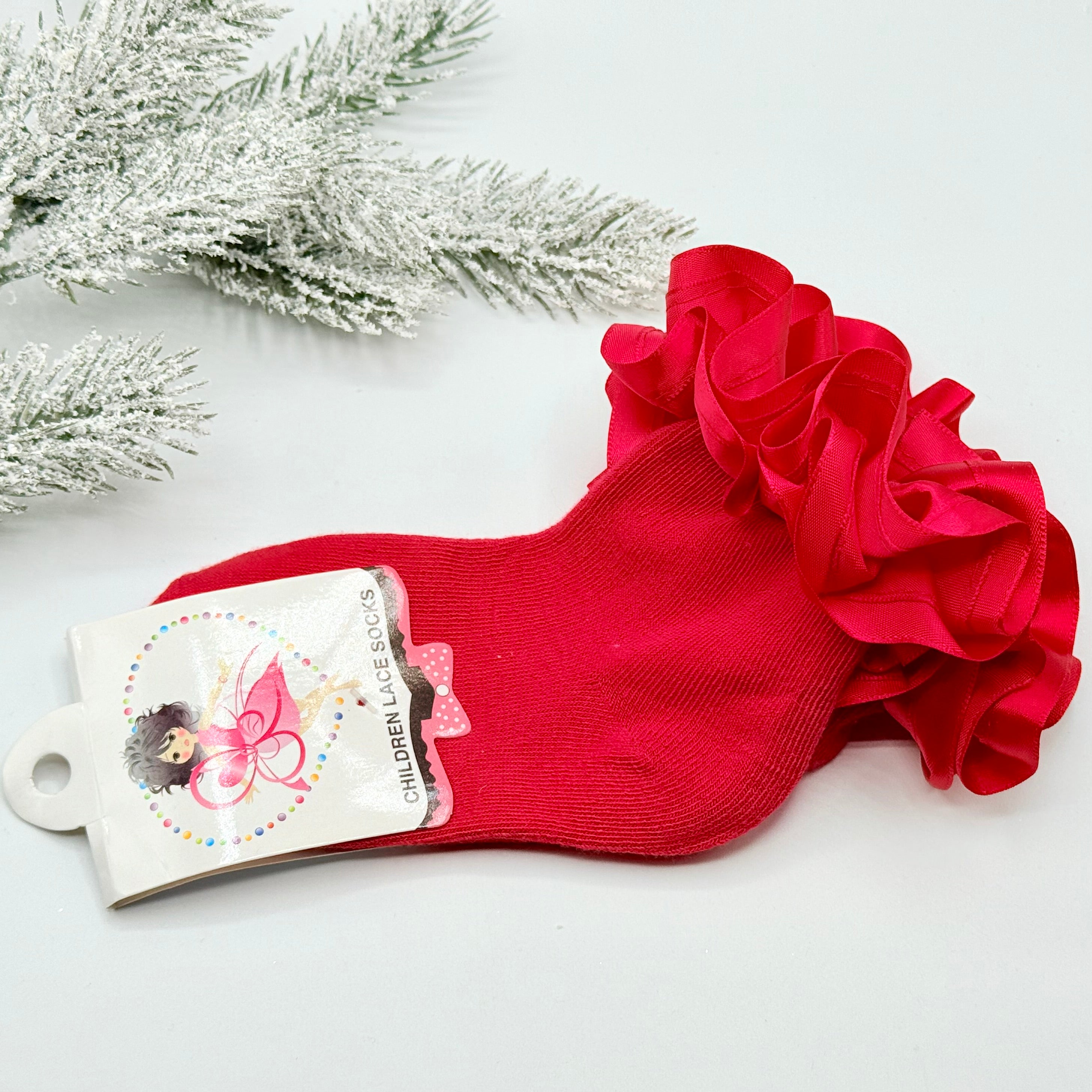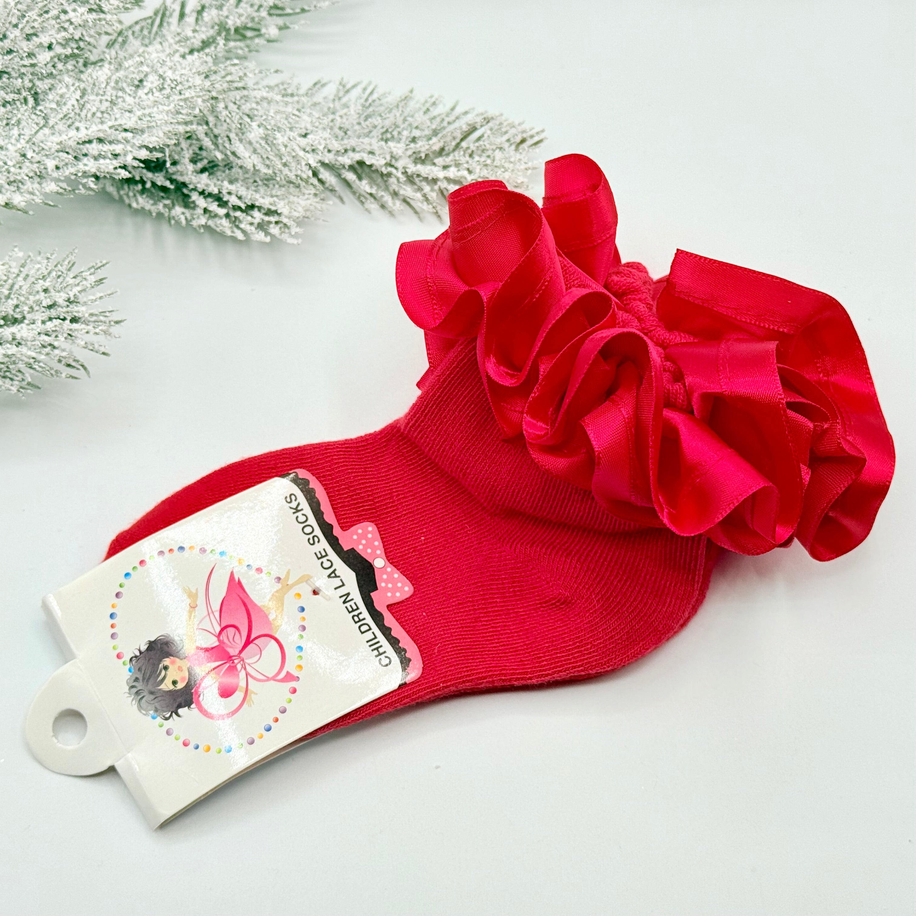 A beautiful pair of socks in lovely shade of vibrant red, finished with a pretty frill to the ankle area.