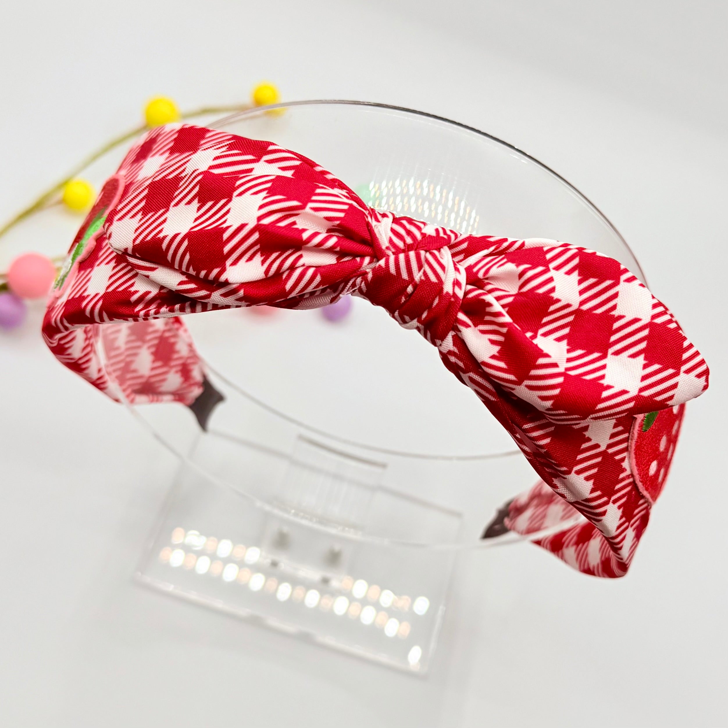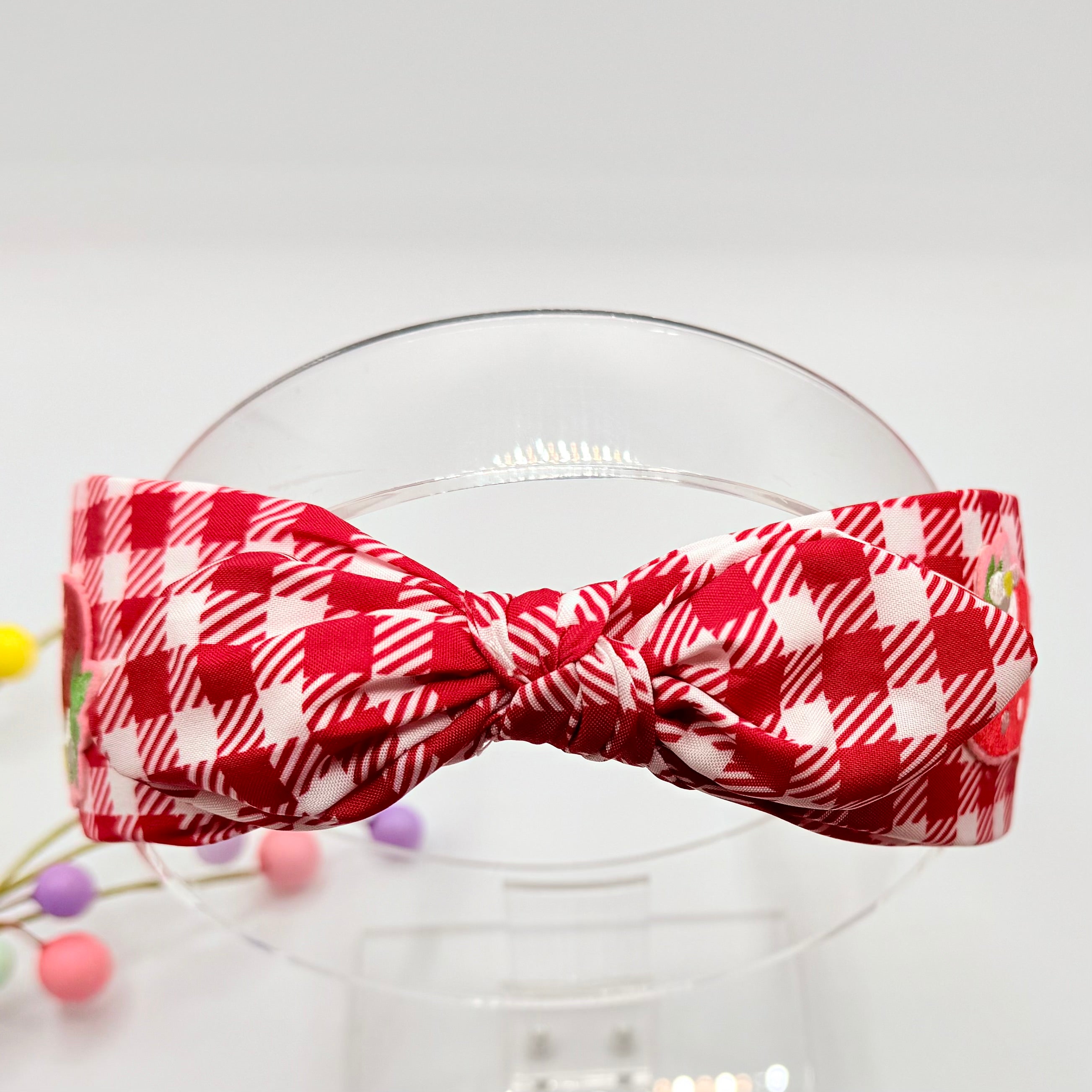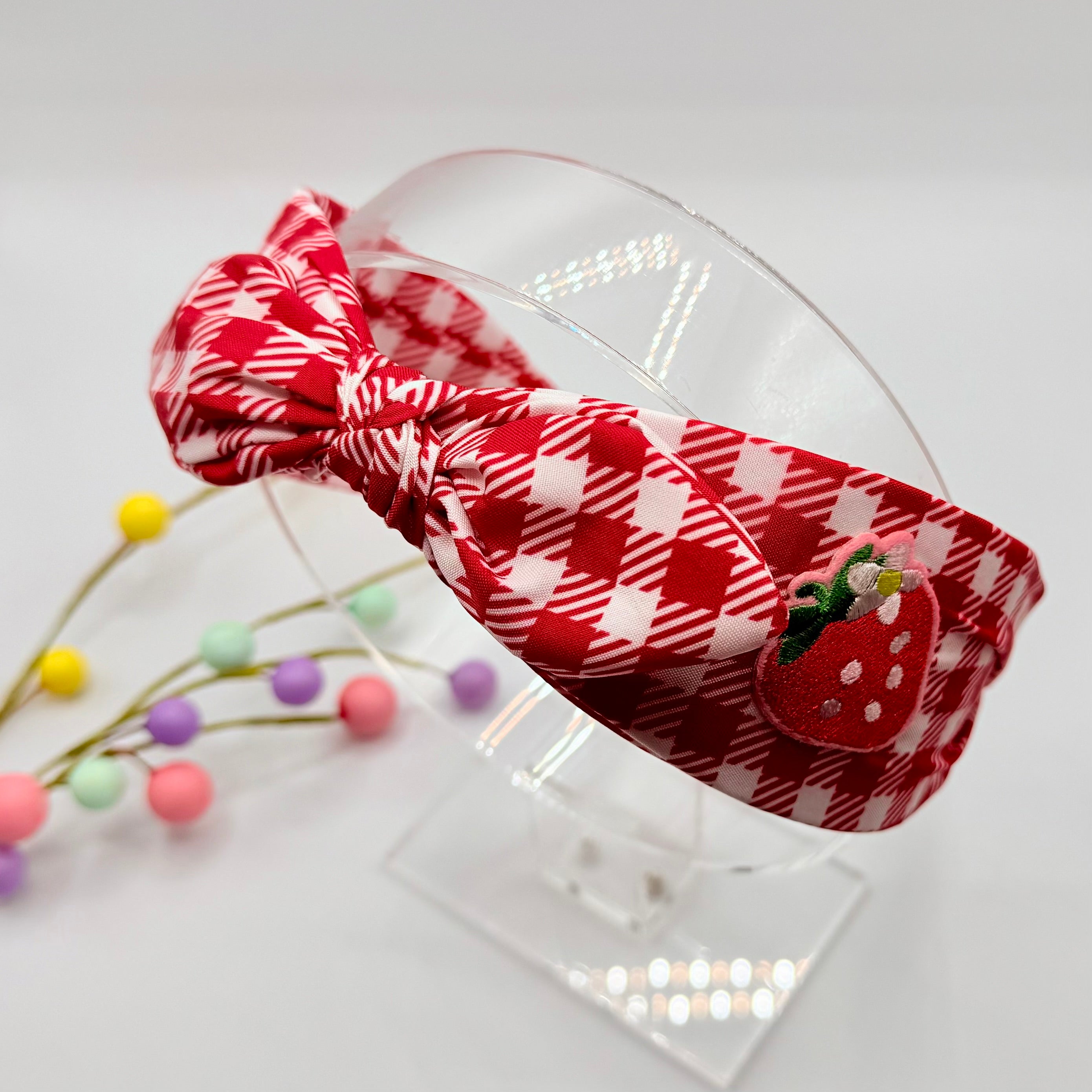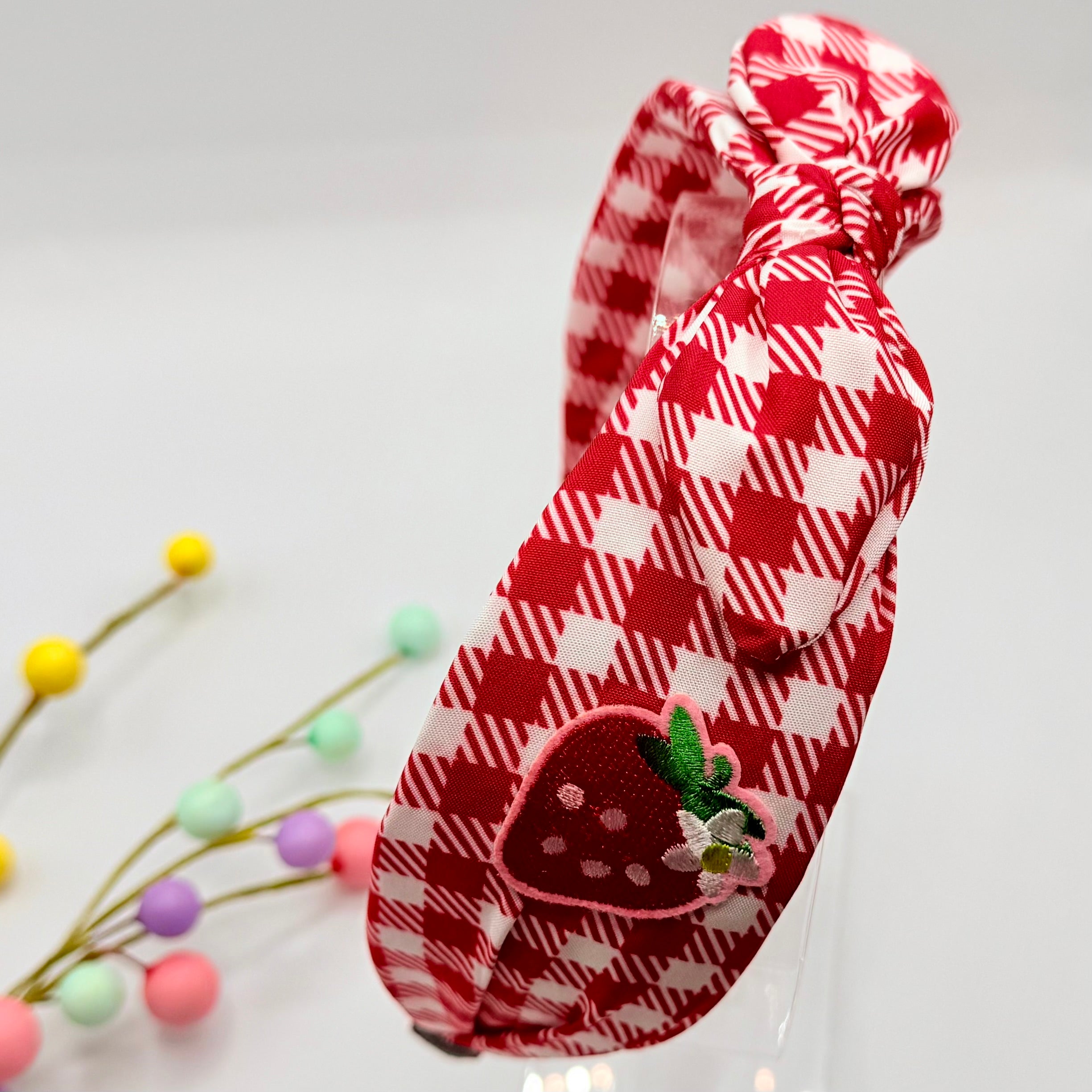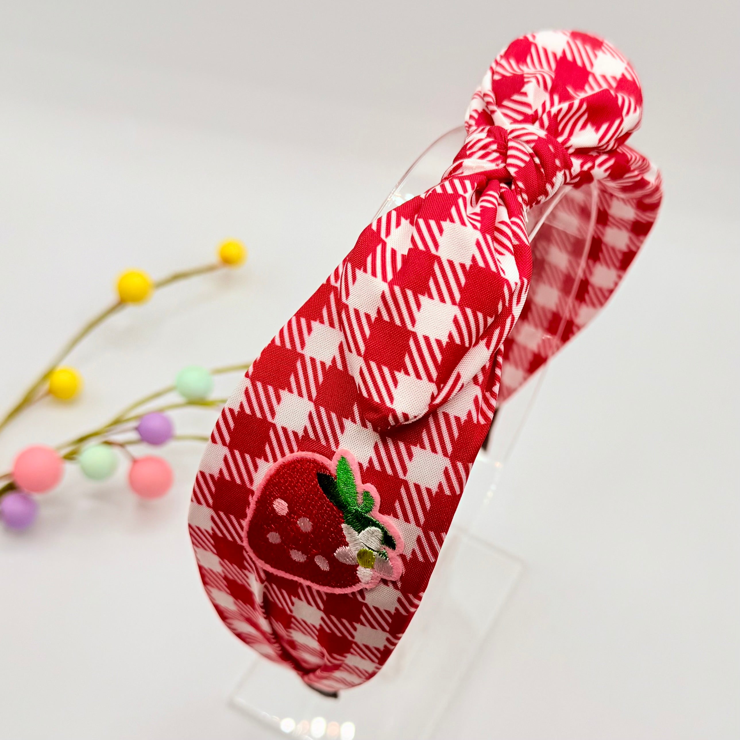 A great looking red / white hair band with a knotted style bow to the top and pretty, embroidered style strawberries to either side. Super cute.