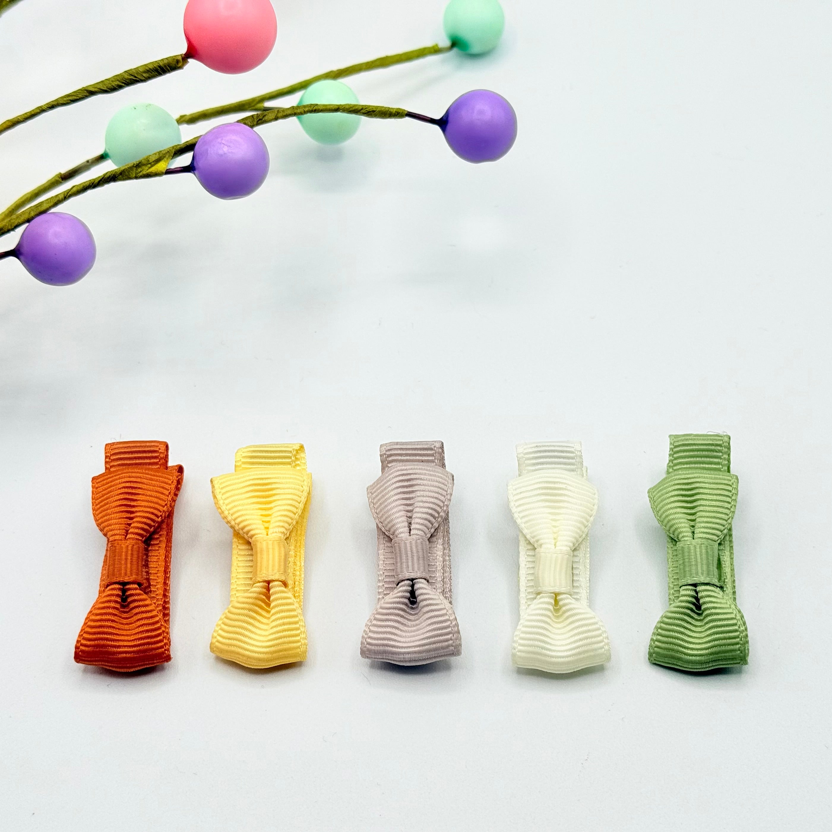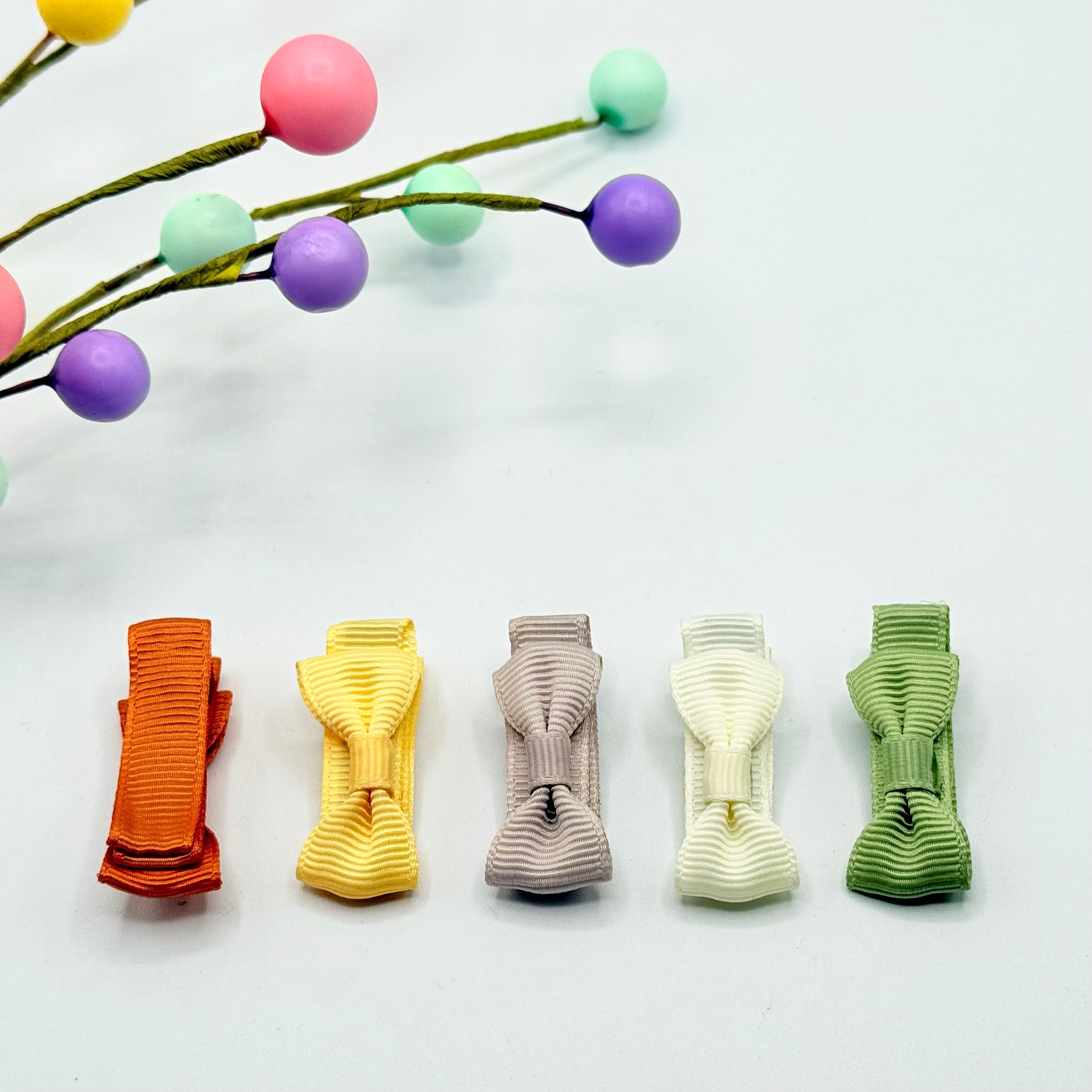 A pretty set of 5 dainty style hair clip. Each ribbon lined and a matching bow attached. Perfect for clipping stray hair aside, fringes and many other styles. Each clip is approx 4cm in length