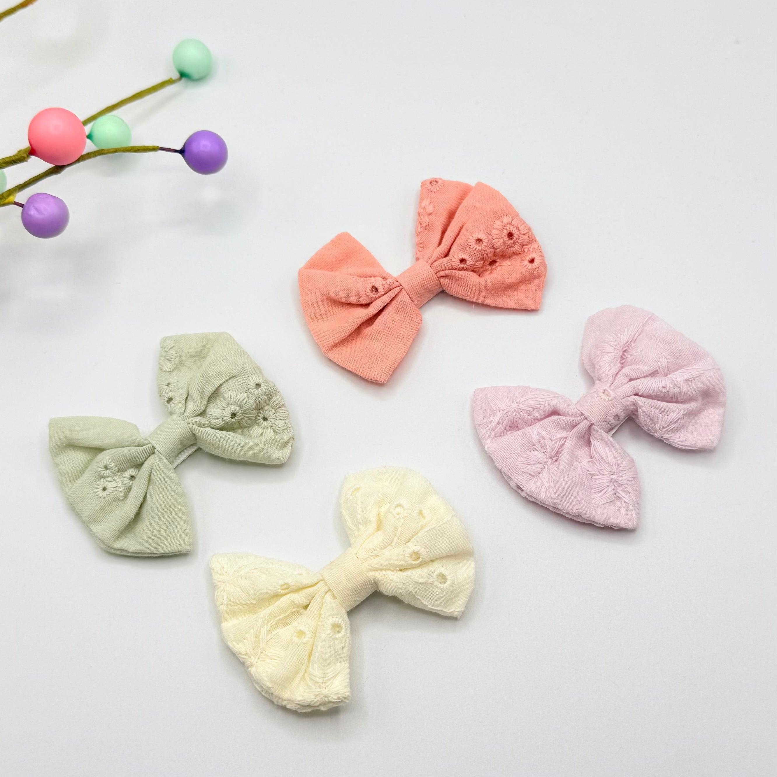 A beautiful set of 4 hair bows. Pretty soft colours that are perfect for matching in with an array of many outfits. Each approx 7.5cm across. Each fitted with a lined clip to the underside.