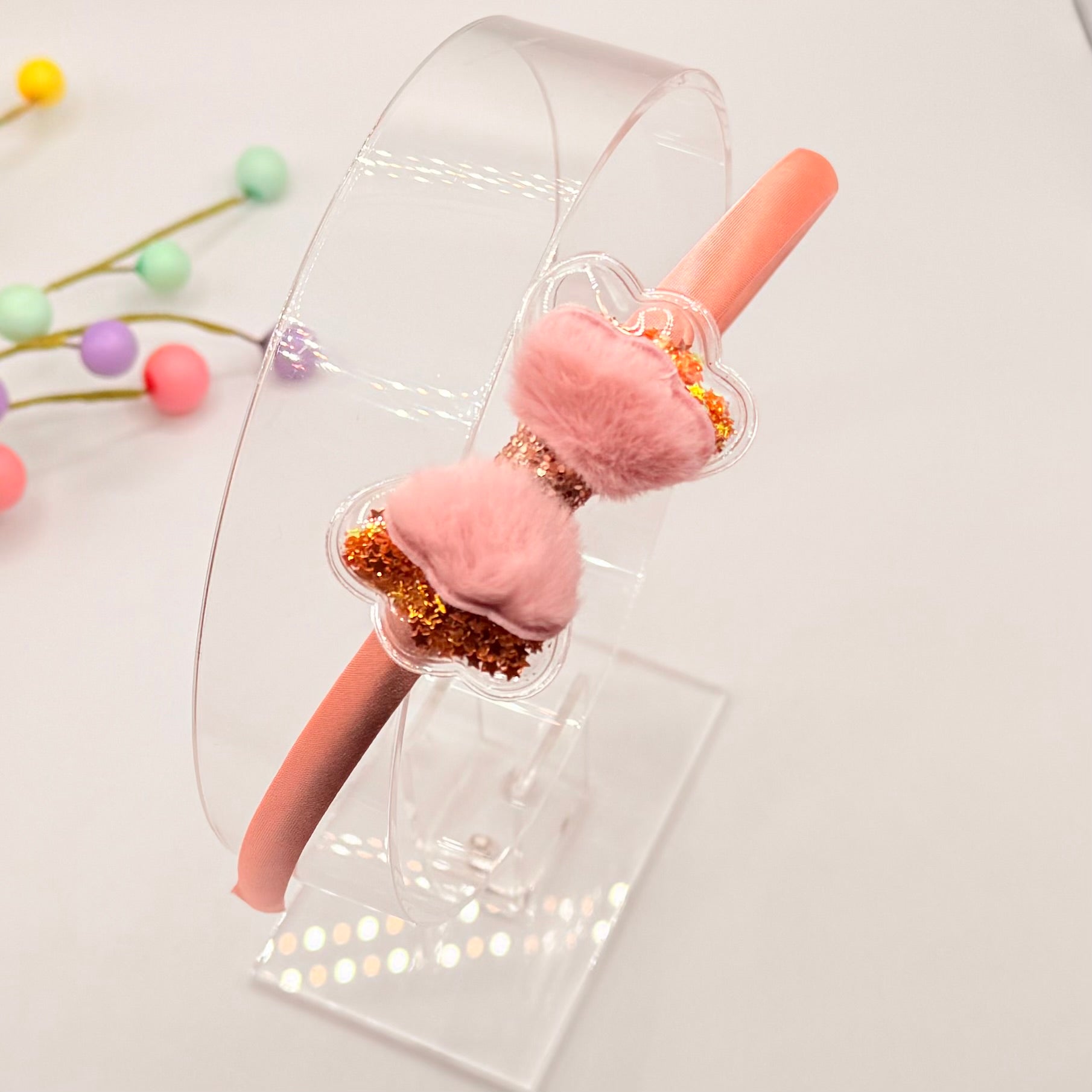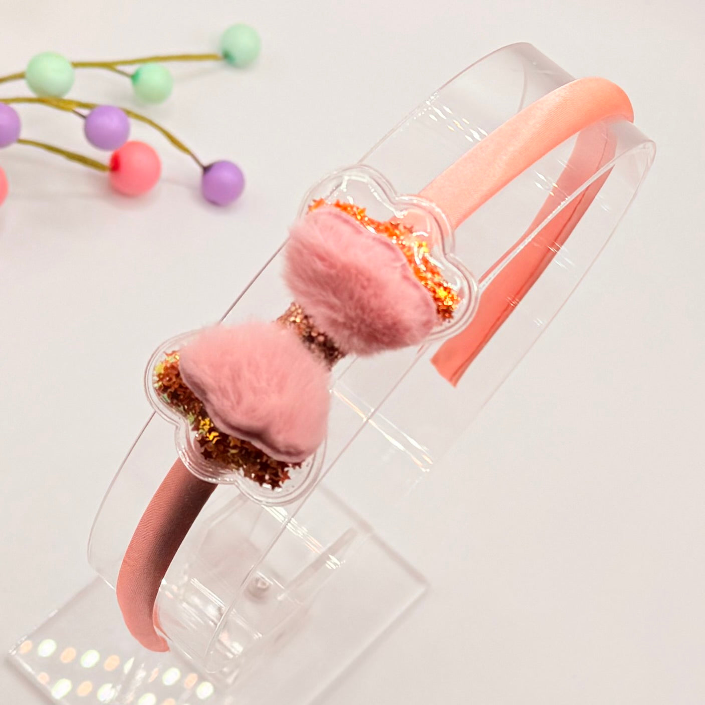 A lovely satin effect, lined Alice band fitted with a clear styled bow. Filled with lots of twinkly stars that move about, topped with the softest, fluffy bow. Super cute to wear.