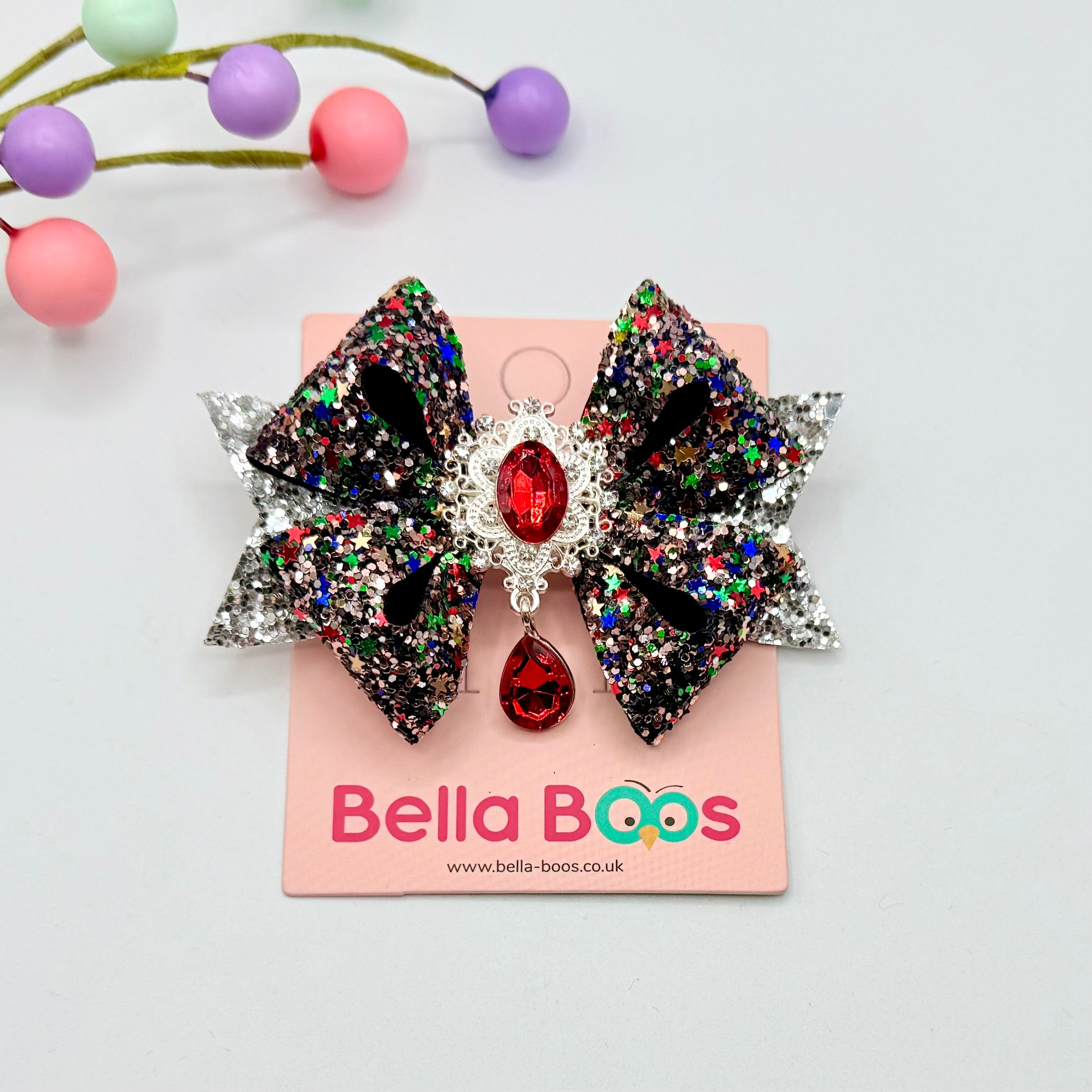 A sparkly glitter fabric with an array of colours, finished with a beautiful, droplet style gem embellishment.