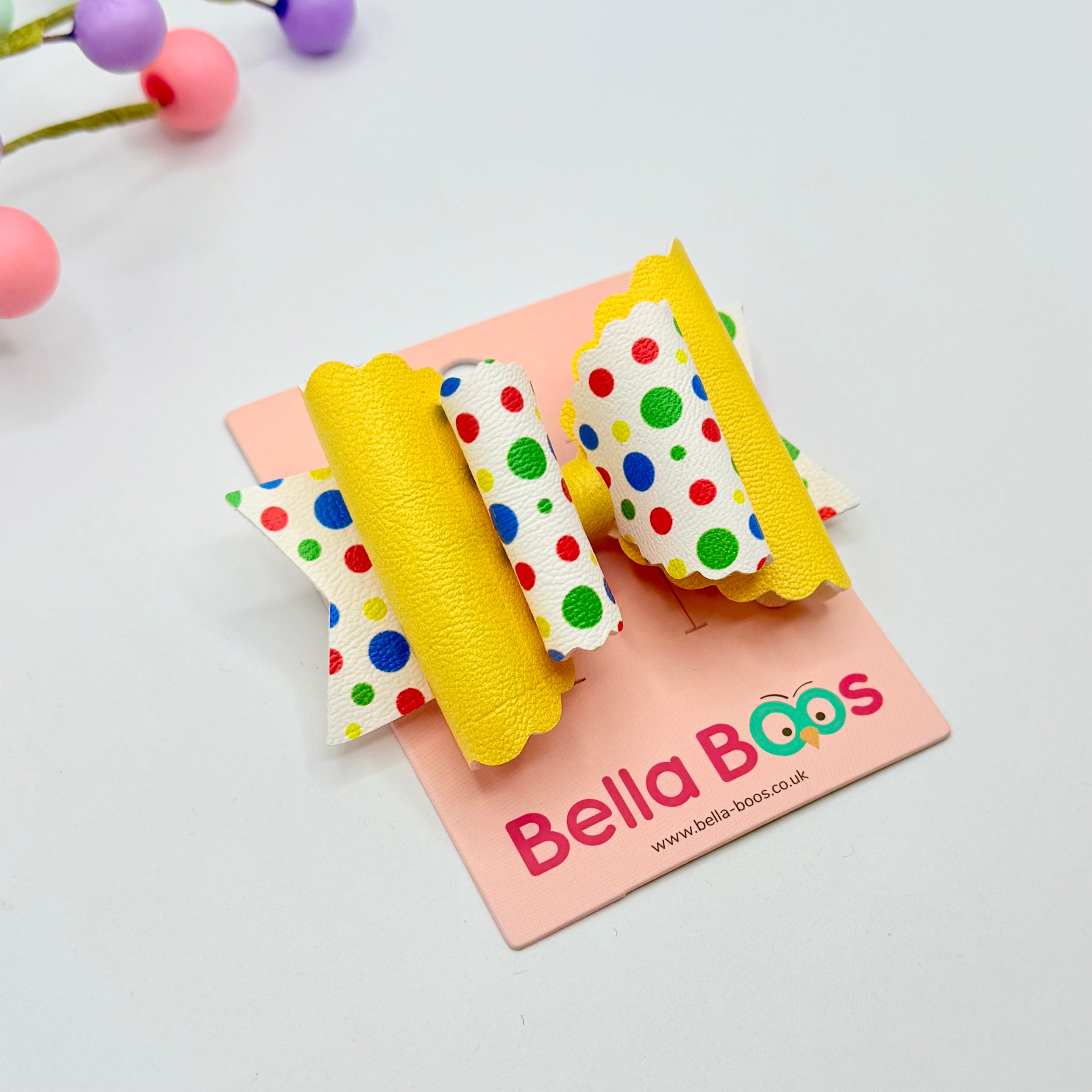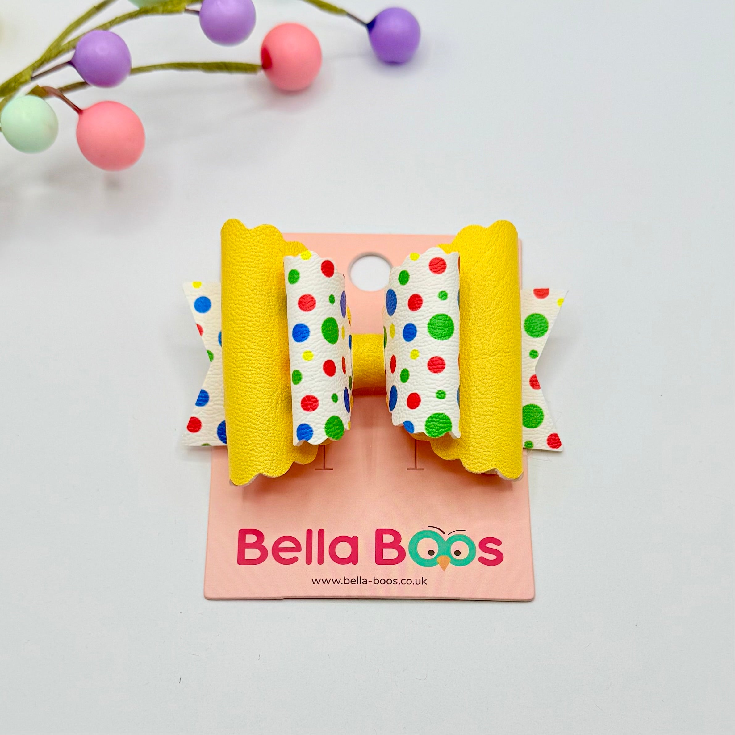 A lovely colourful hair bow, double layered and fitted with a crocodile style to the underside for a secure hold.