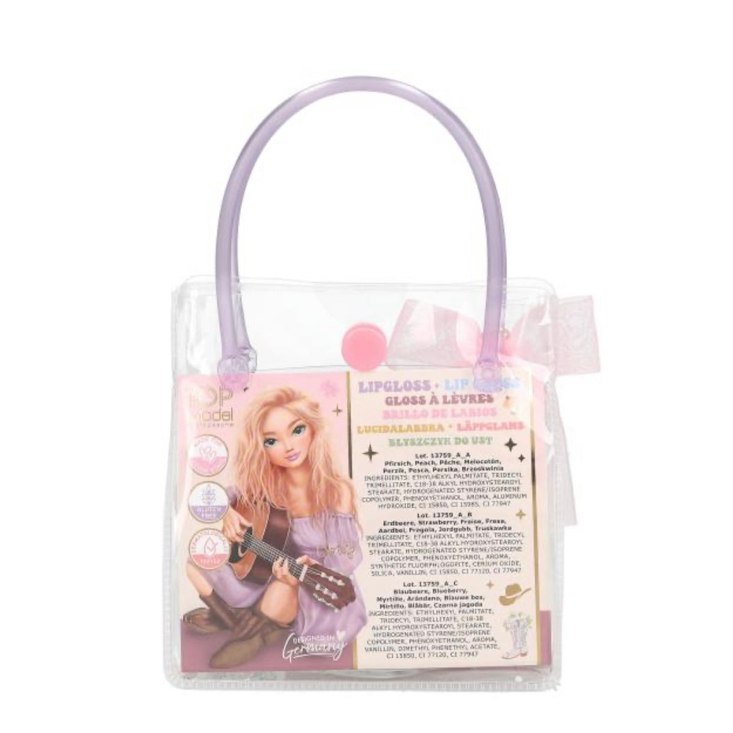For shiny cowgirl lips: The lip gloss set from TOPModel consists of a pink lip gloss with a blueberry scent, a rose lip gloss with a peach scent and a purple lip gloss with a strawberry scent. The three tubes with cute model motives are packed in a transparent pouch with a handle and bow. Content per tube: 9 ml