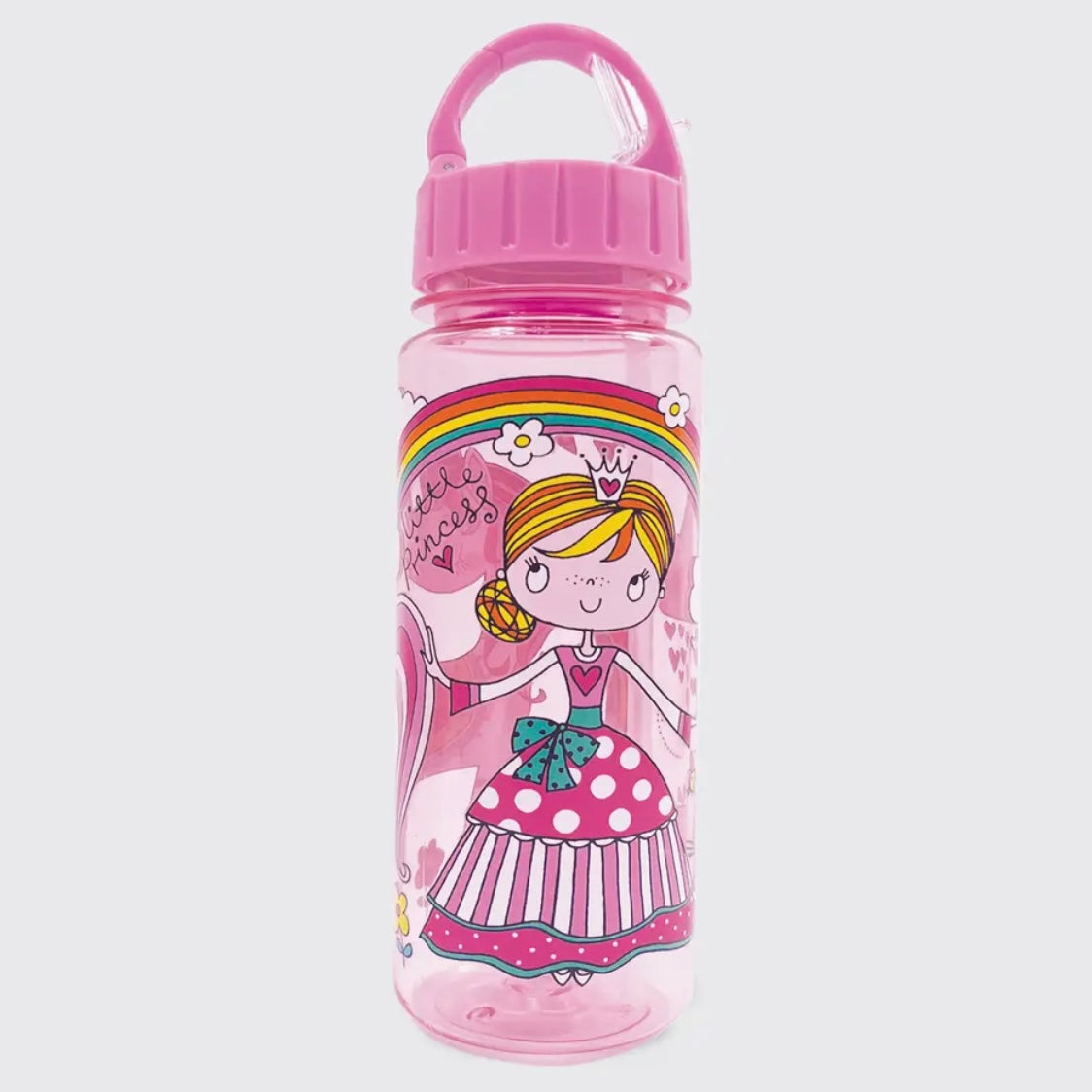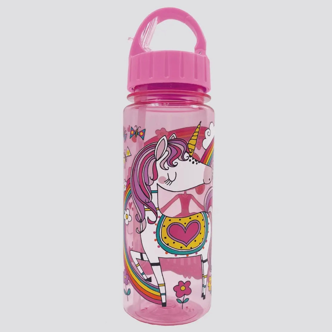 This fun and funky drinking bottle feature a brightly colored leak proof/easy-use lid with colorful little princess and unicorn characters printed onto a clear pink 500ml bottle. Size: 63mm diameter 205mm high. Capacity: 500mls. Specification: BPA-free. Care: freezer safe, handwashing is recommended.