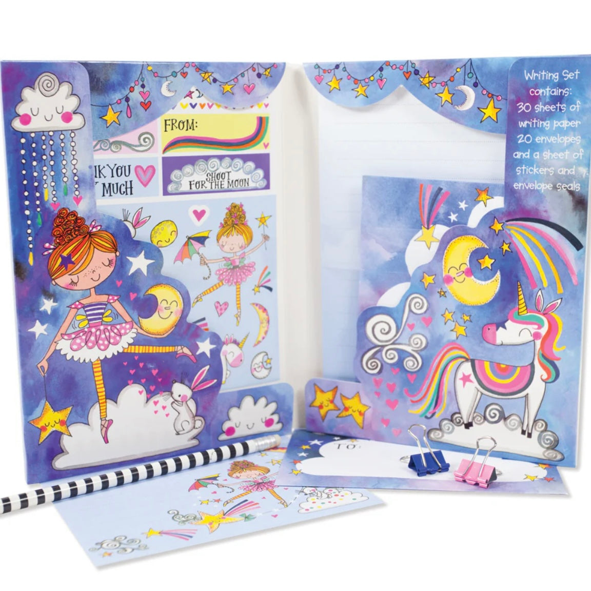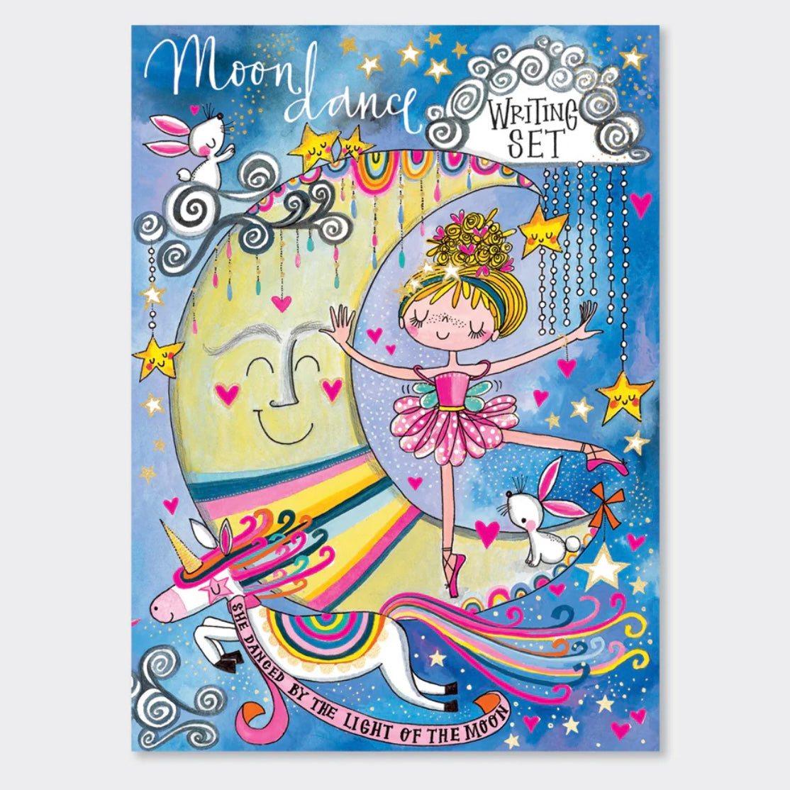This wonderful writing set from our Moon dance collection contains 30 sheets of co-ordinated writing paper, 20 printed envelopes and a sheet of stickers. Each wallet comes in an open cello bag to allow the contents to be seen. A beautiful ballet theme with a very pretty unicorn and delicate design features.