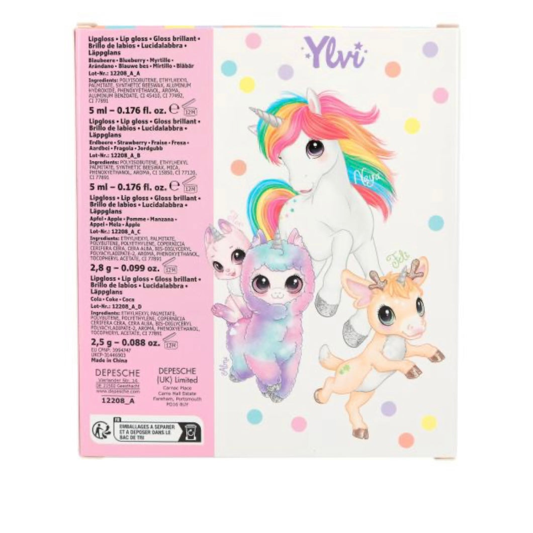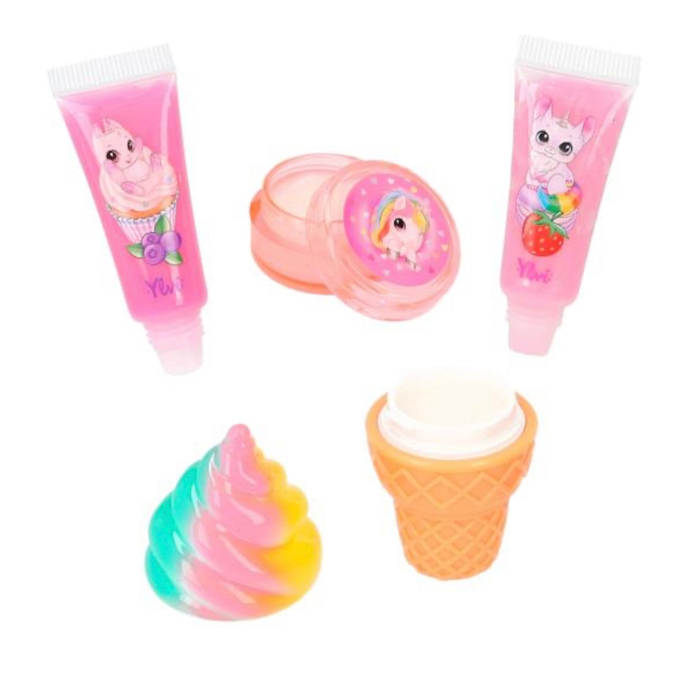 Beauty is this cute: the lip gloss set in candy shop style by Ylvi includes 2 tubes of pink lip gloss (strawberry and blueberry scent, 5 ml each), 1 round lip gloss tin (apple scent, 2.8 g) and 1 lip gloss in the shape of an ice cream cone (cola scent, 2.5 g).