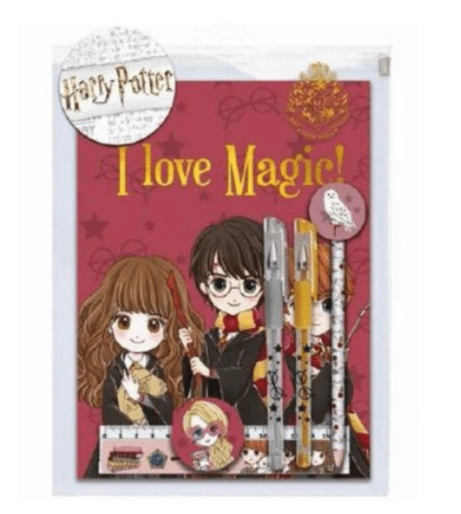 Set includes ; Pencil sharpener, pencil, rubber, ruler, 2 x pens and a wonderful note book. All presented in a clear zip pouch.