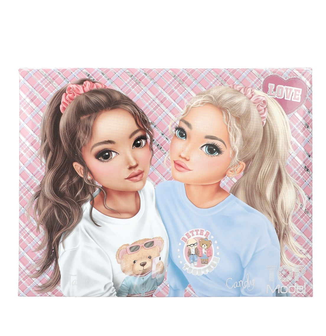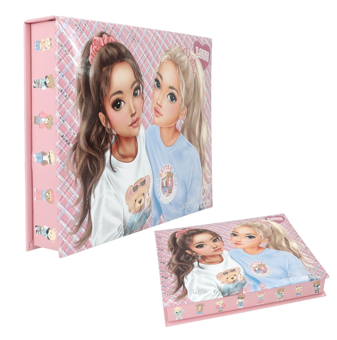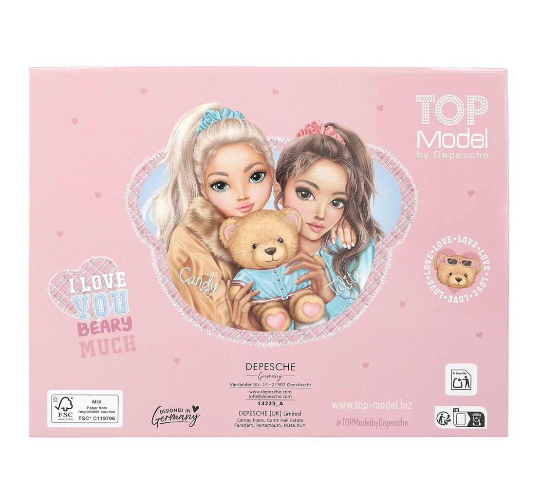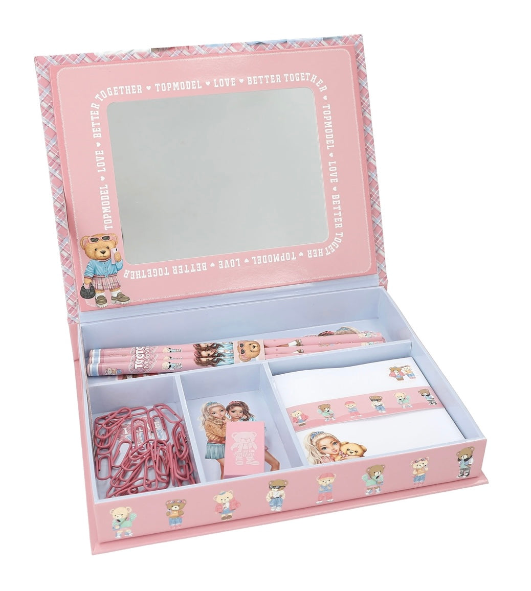 Everything for the desk: The stationery box from TOPModel includes 3 colorful pencils with model motives, 1 eraser with a cute teddy bear print, 25 pink paper clips and 100 notepads. The pink box is printed with lots of cute teddy bears, a cool checked pattern and stylish models. Plus a mirror in the hinged lid