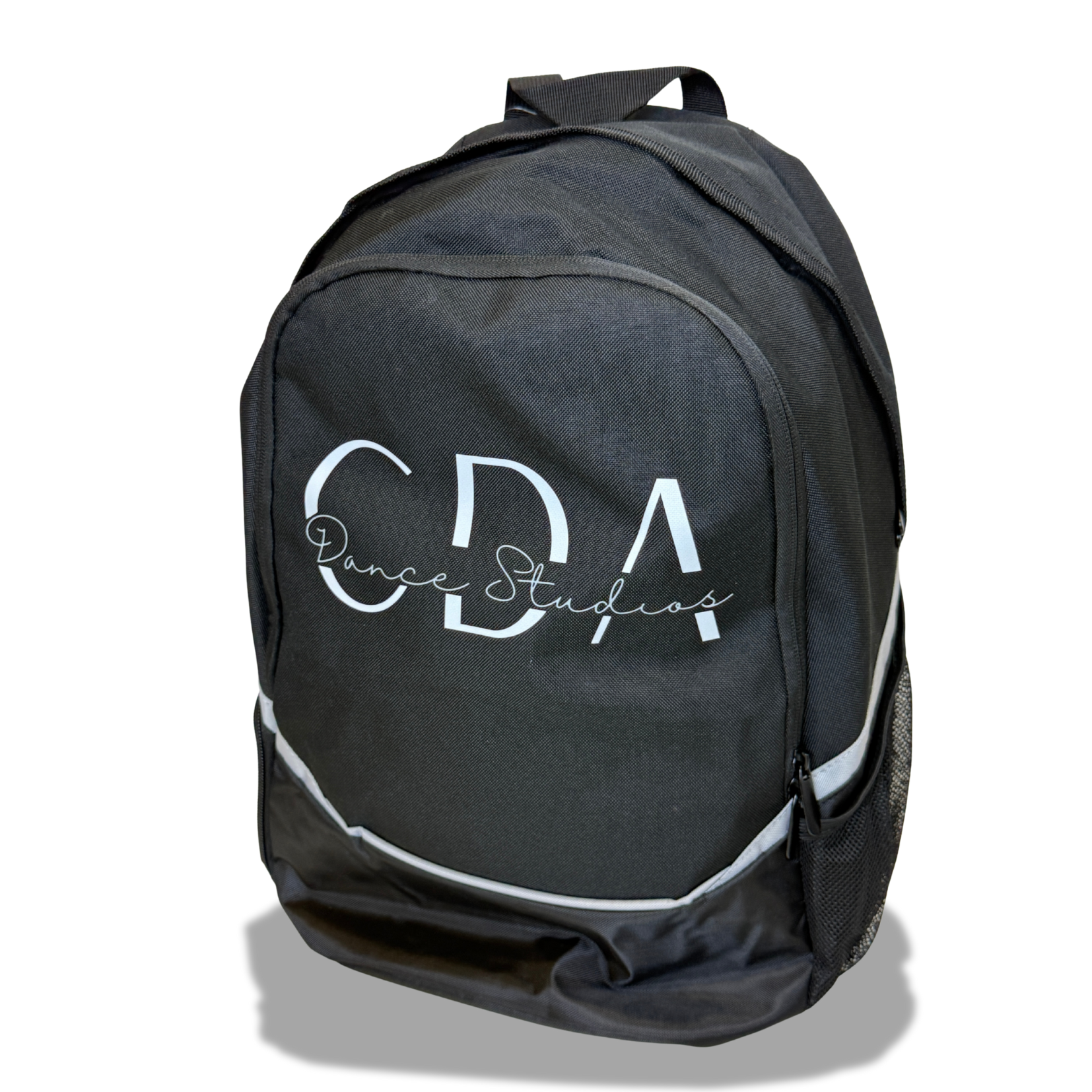 CDA dance studio backpack dimensions 43 x 30 x 20cm personalised with dancer initials, personalisation below logo