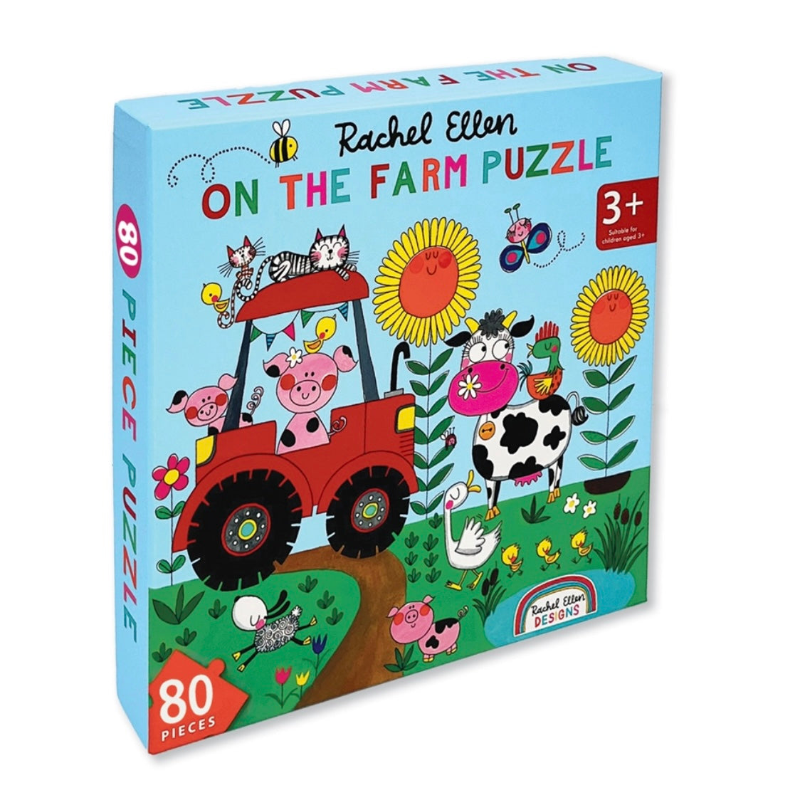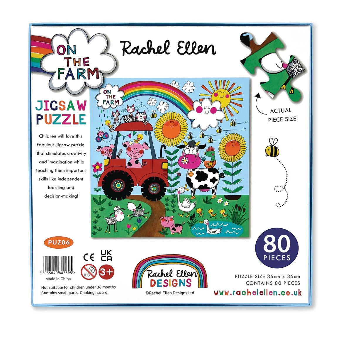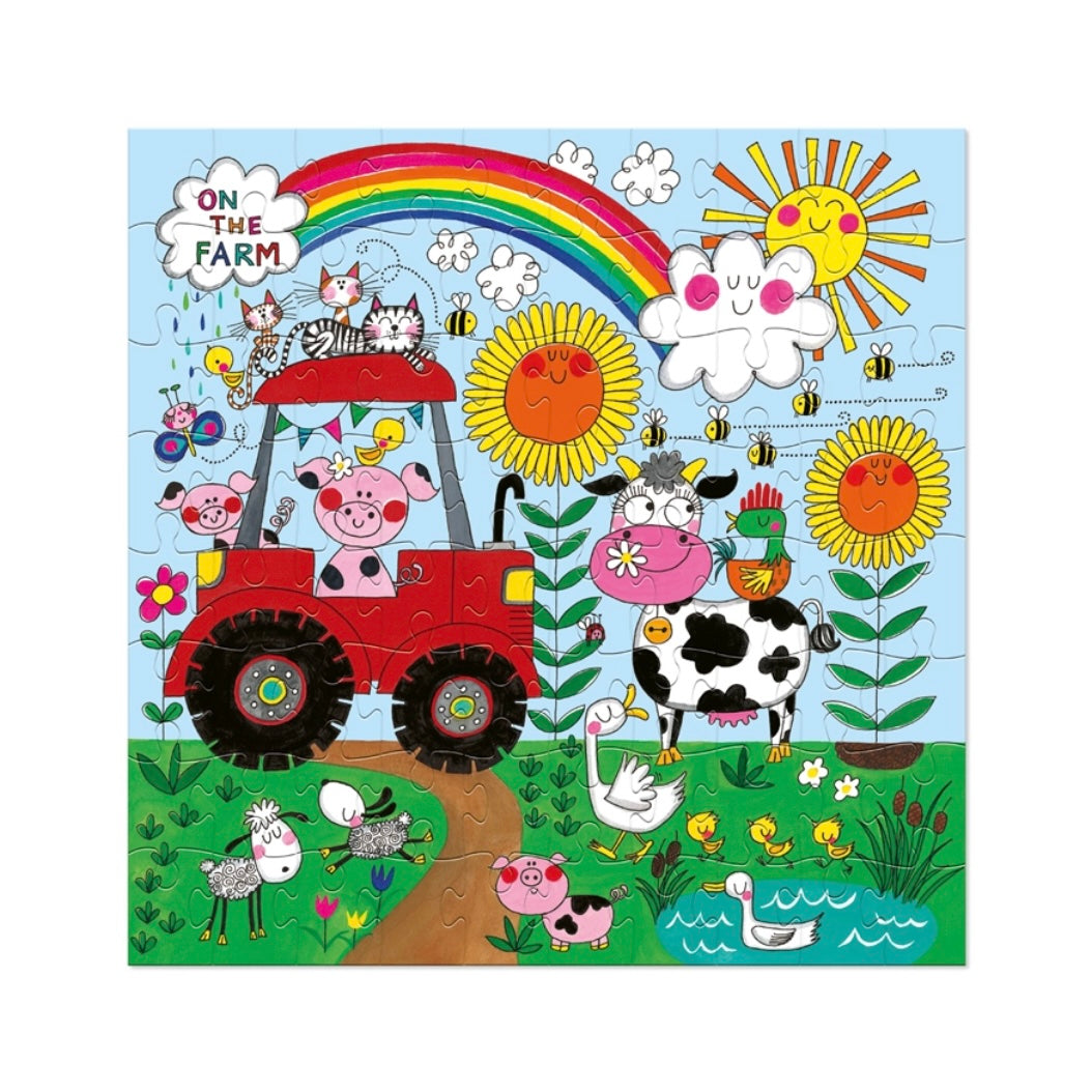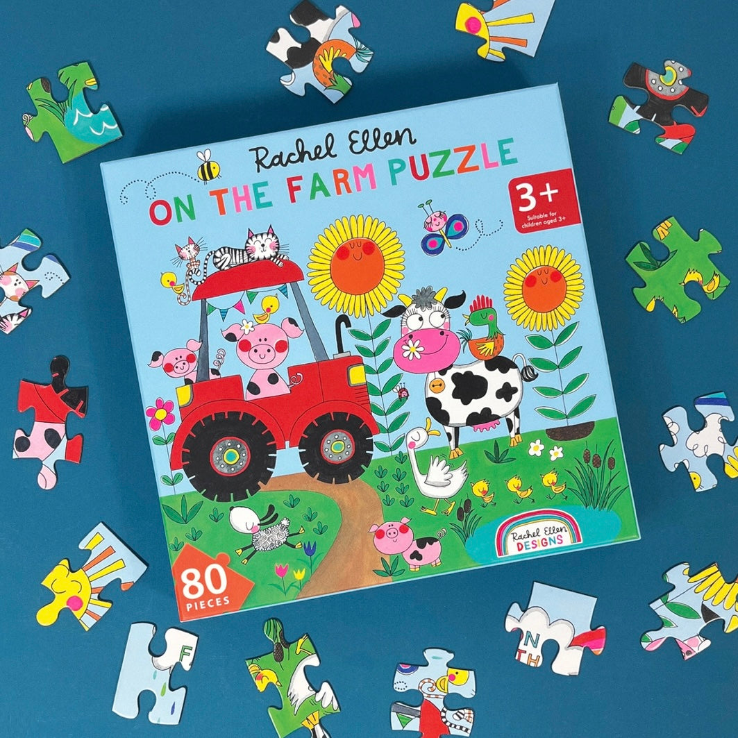 A vibrant brand new jigsaw puzzle in a fun 'on the farm' design. Packaged in a sturdy box with a printed visual of the puzzle inside containing 80 pieces. Suitable for 3+ Size: Box - 235mm (h) x 235mm (w) x 40mm (d) Jigsaw - 350mm x 350mm 80 pieces