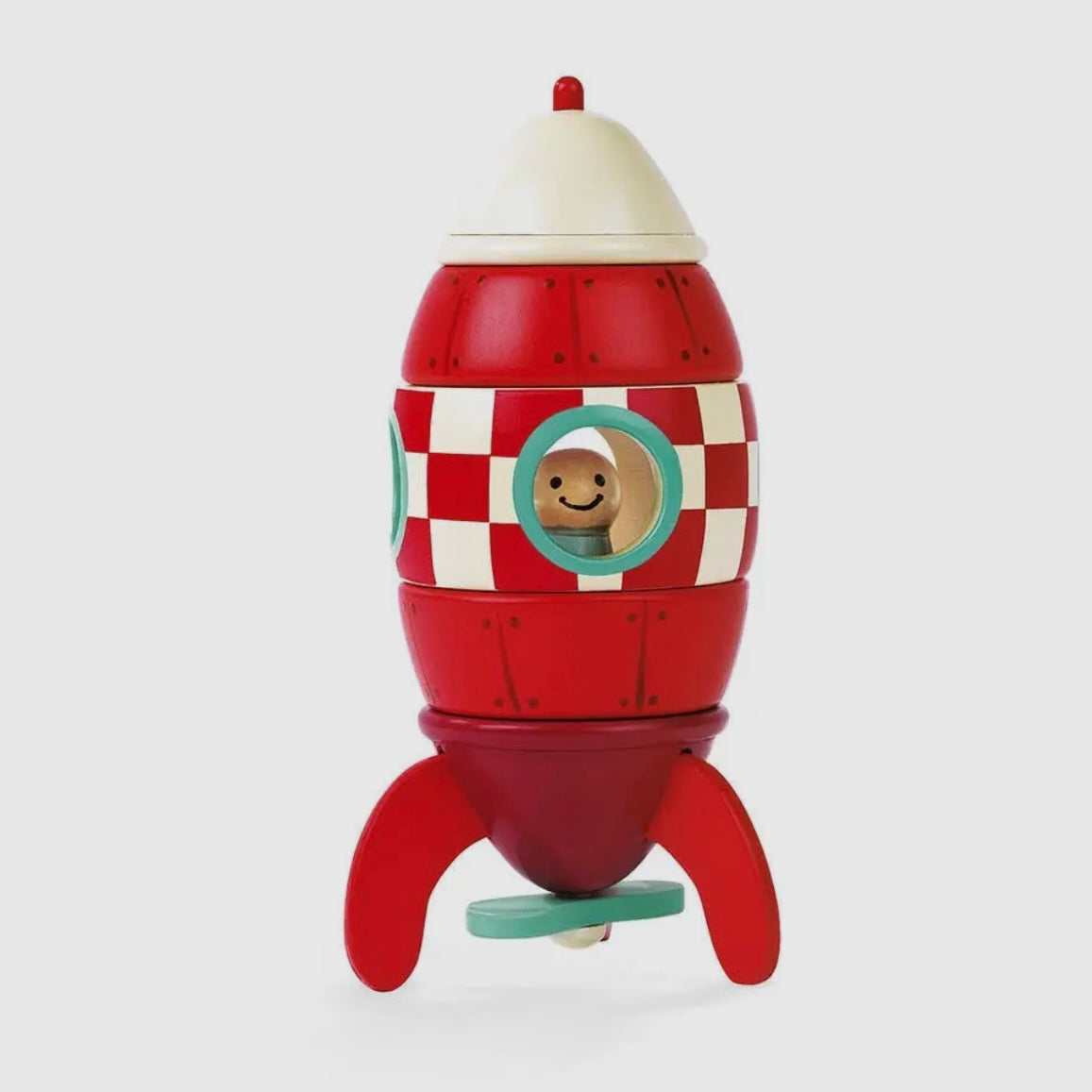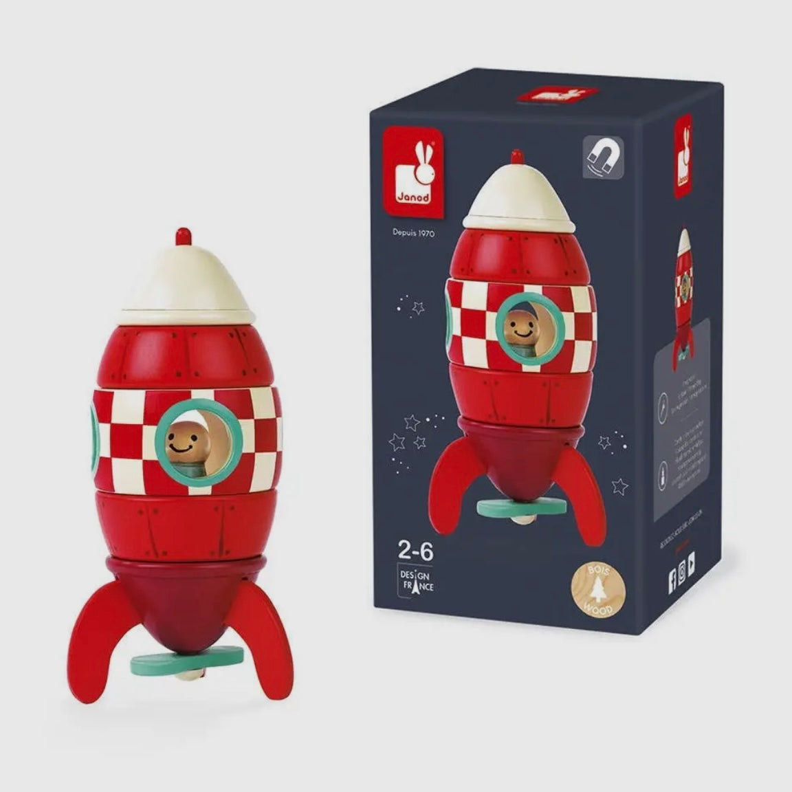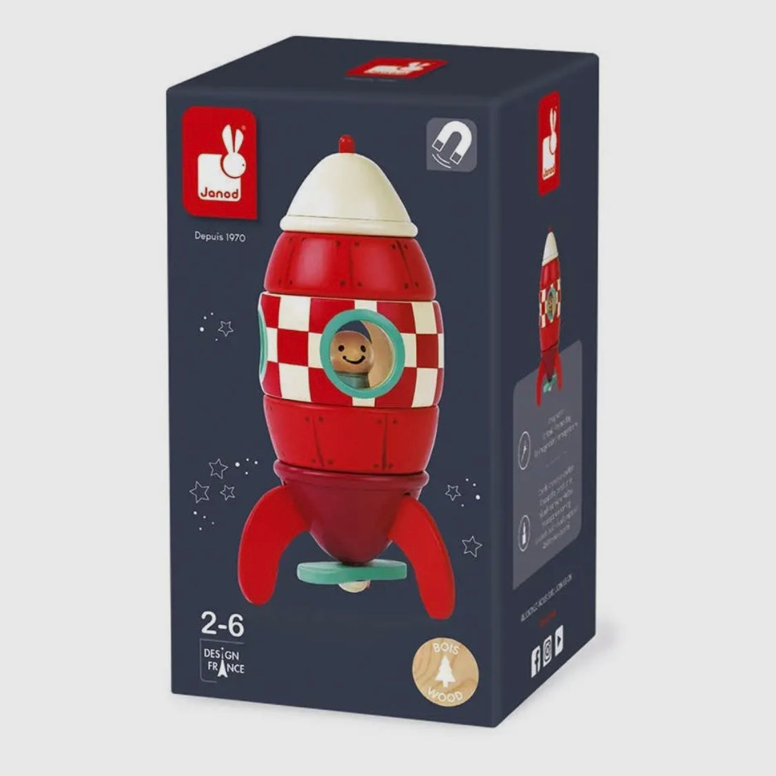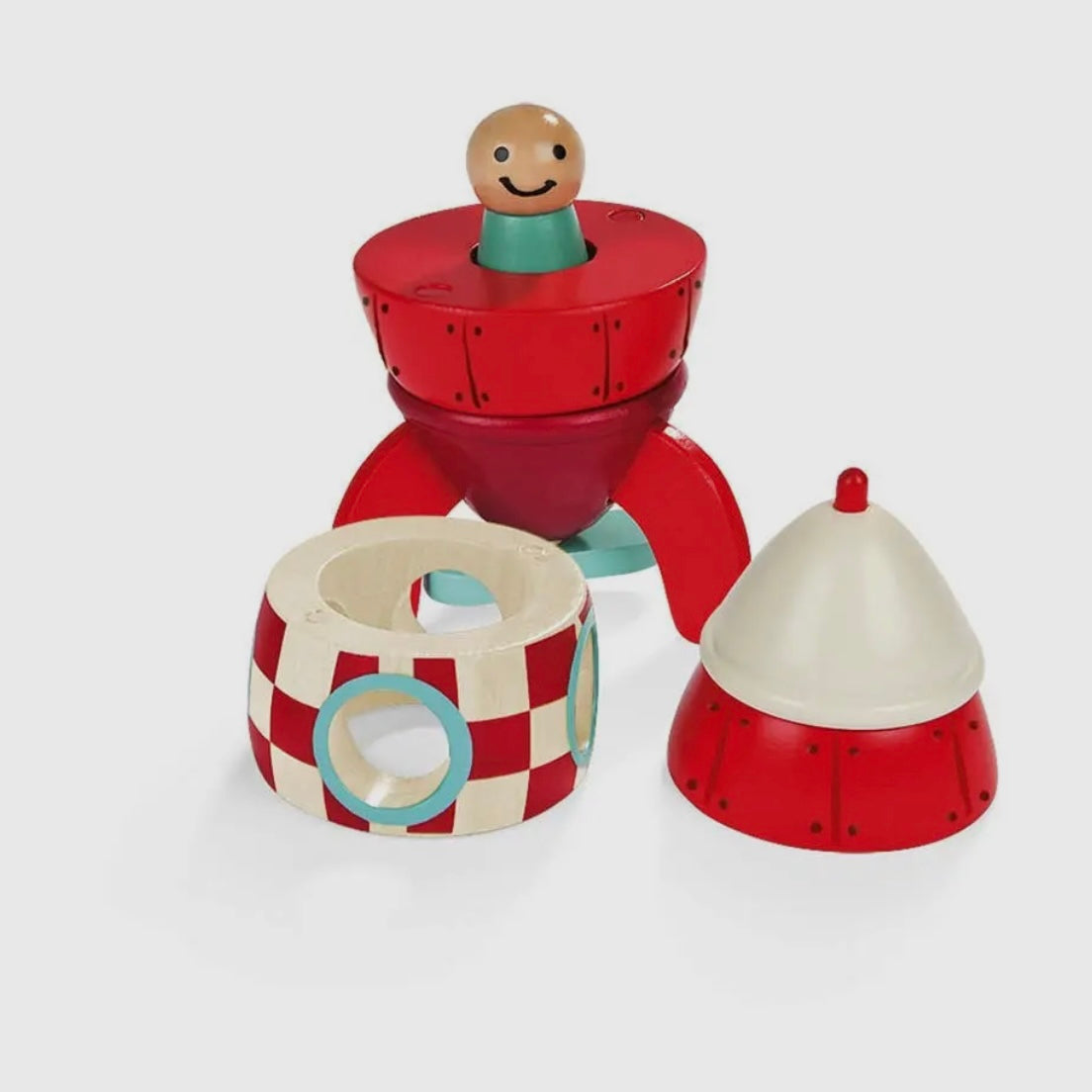 2 in 1 game: a rocket to build... to assemble and disassemble as many time as you want... and a toy (when assembled, the child can really play with the rocket as all the pieces stay together). Wood: Chinese cherry. Standard painting and silkscreen printing. Closed colour box.