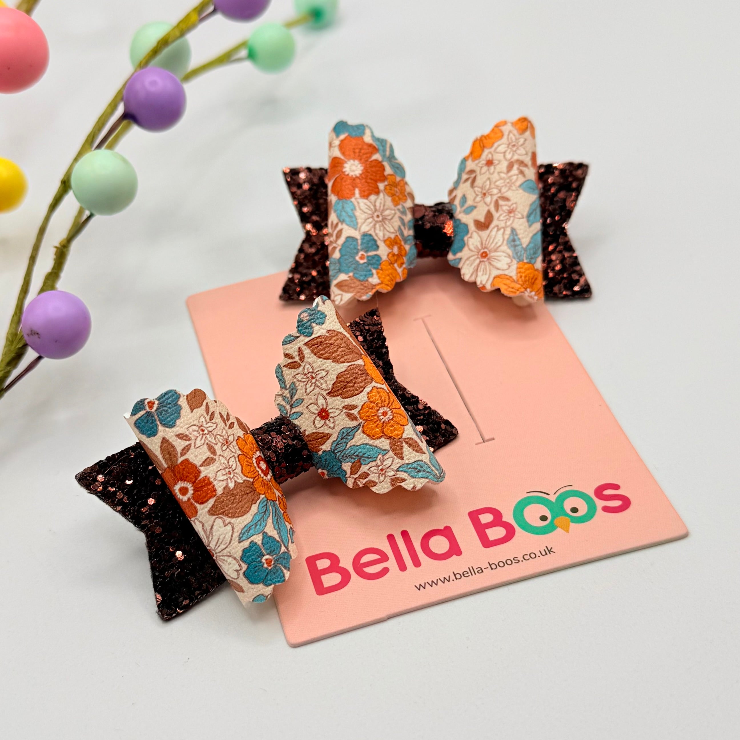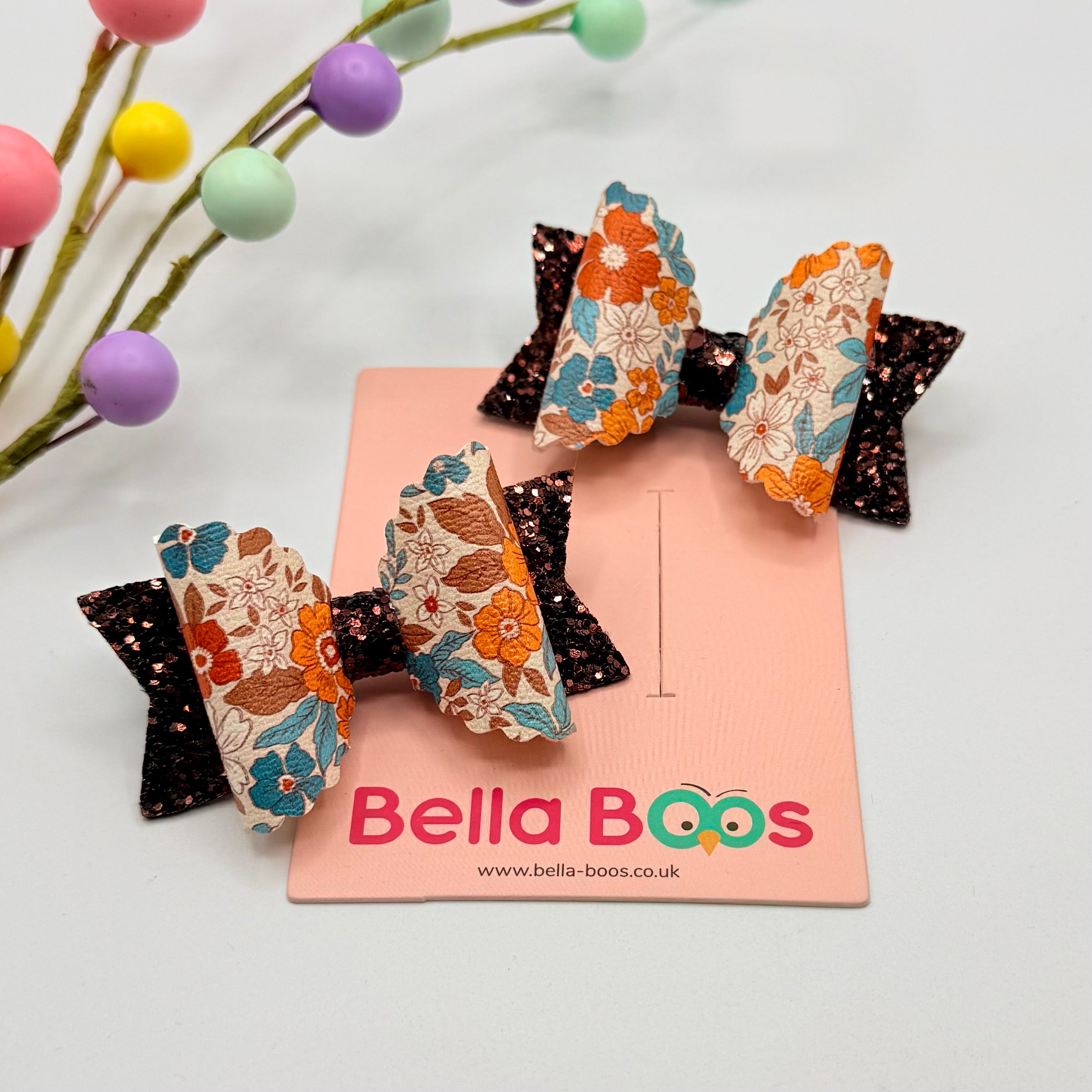 A beautiful set of 2 hair bows, both made in a wonderful shape with the prettiest of fabrics. Each fitted with a crocodile clip to the underside for a secure hold. Perfect for piggy tails and an array of other hair styles.