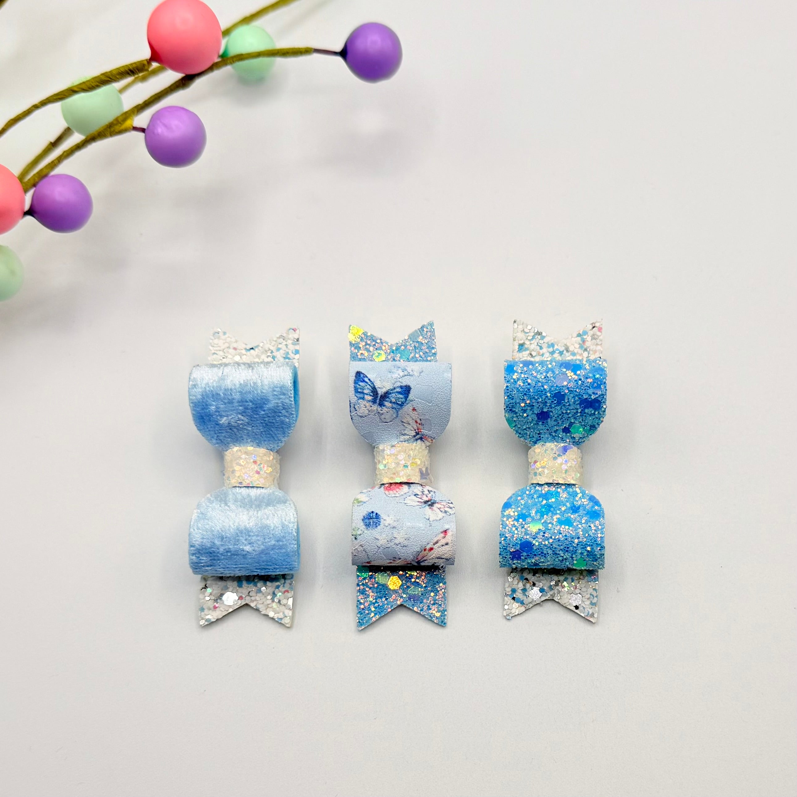 A set of 3 pretty hairs bows, all made in lovely fabrics, all fitted with crocodile clips and each approx 6.5 by 2cm.