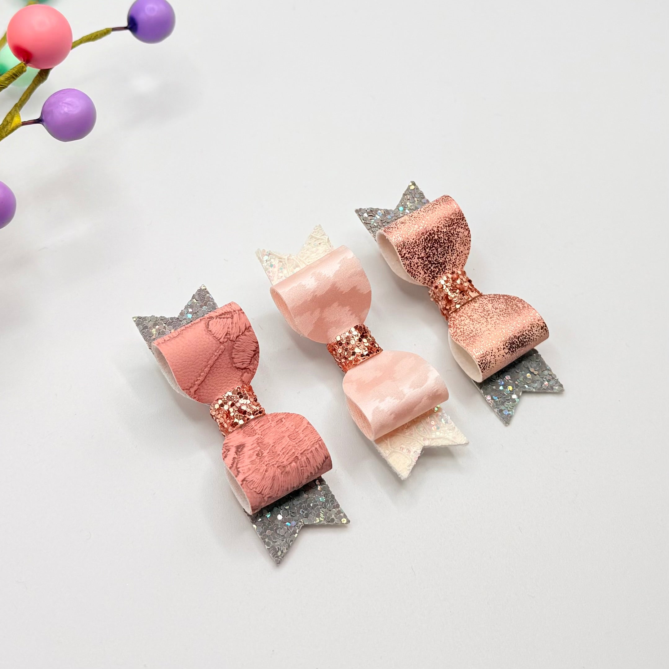 A set of 3 pretty hairs bows, all made in lovely fabrics, all fitted with crocodile clips and each approx 6.5 by 2cm.