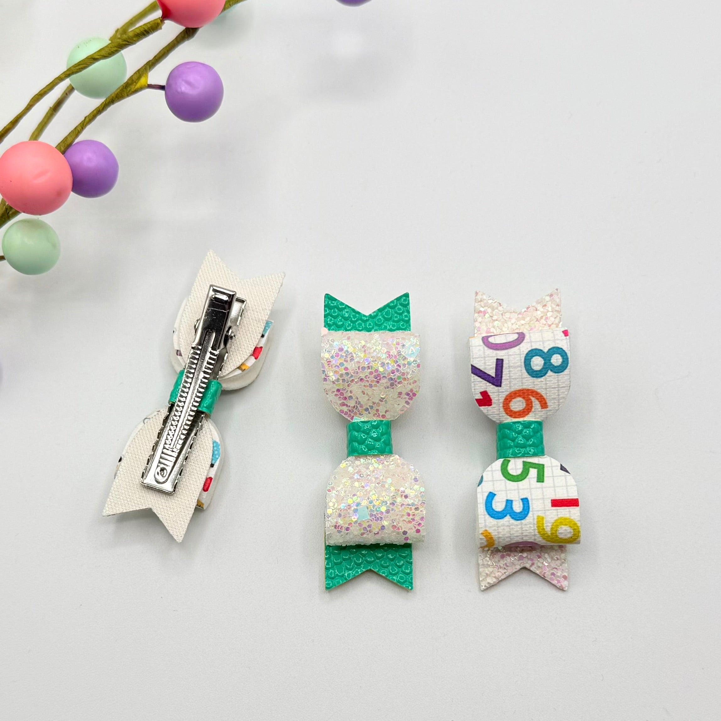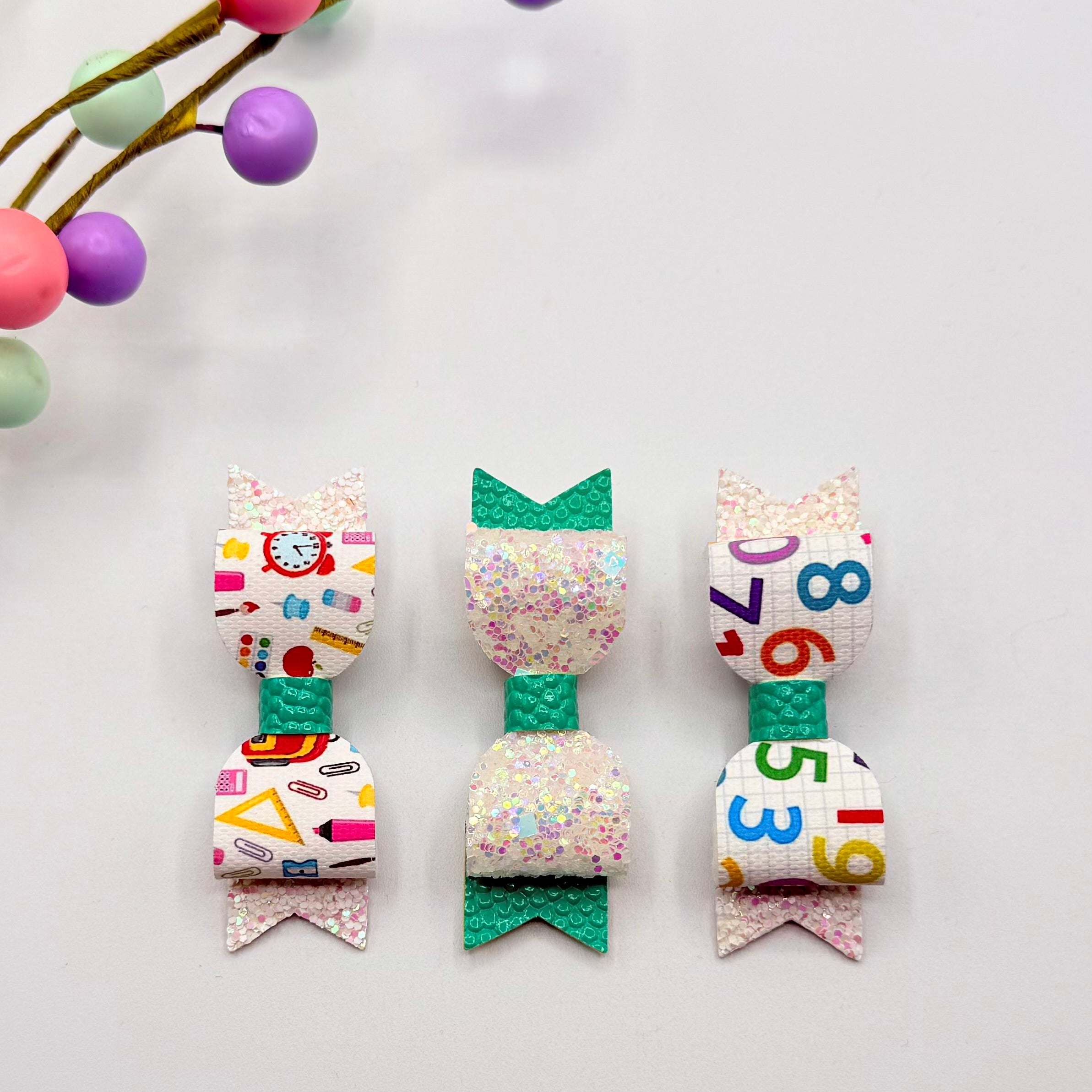 A set of 3 pretty hairs bows, all made in lovely fabrics, all fitted with crocodile clips and each approx 6.5 by 2cm.