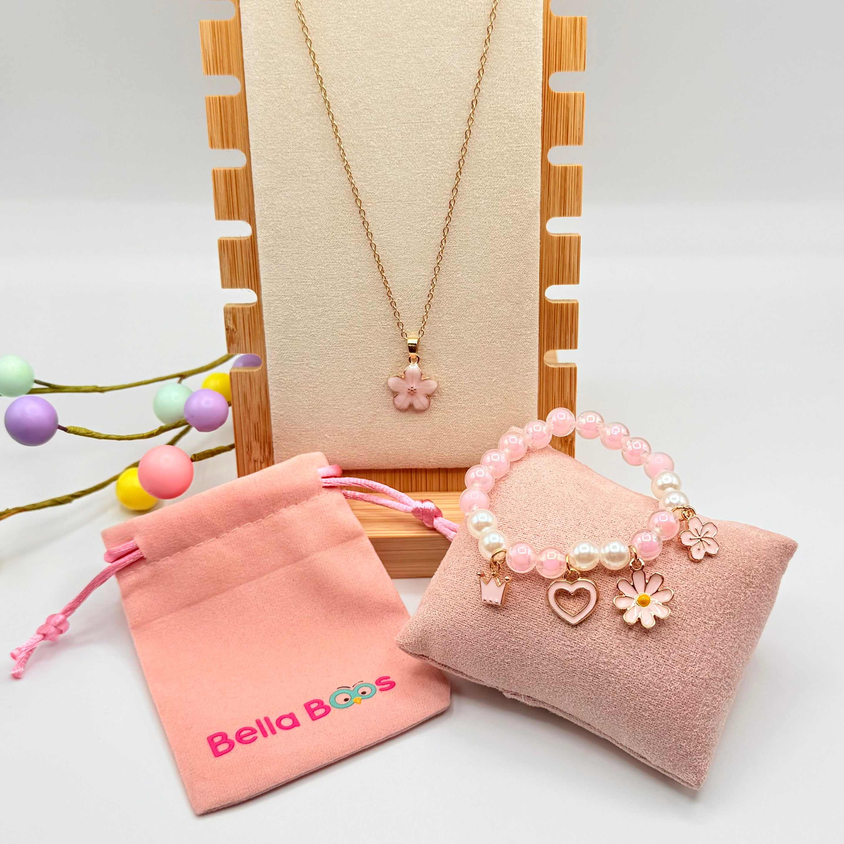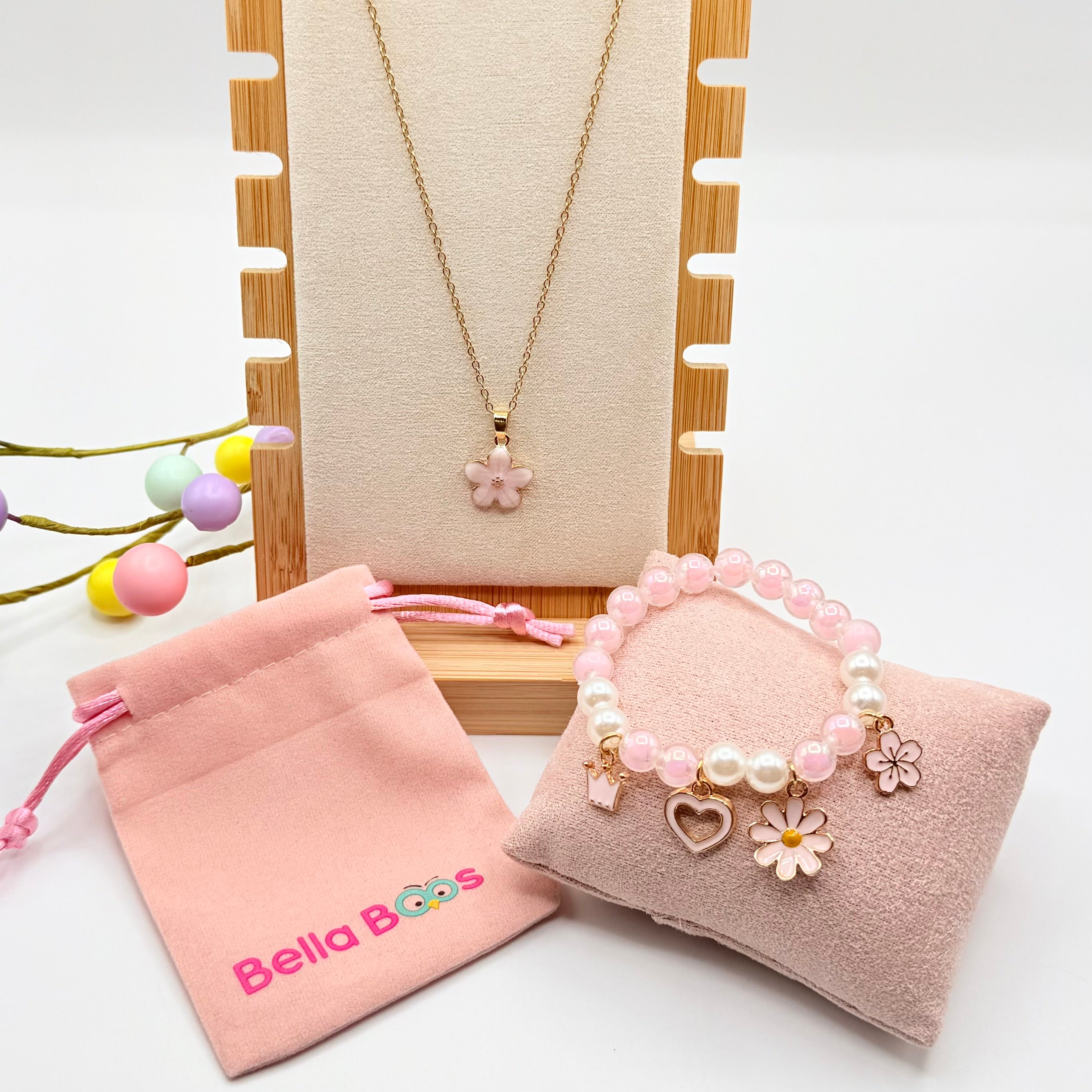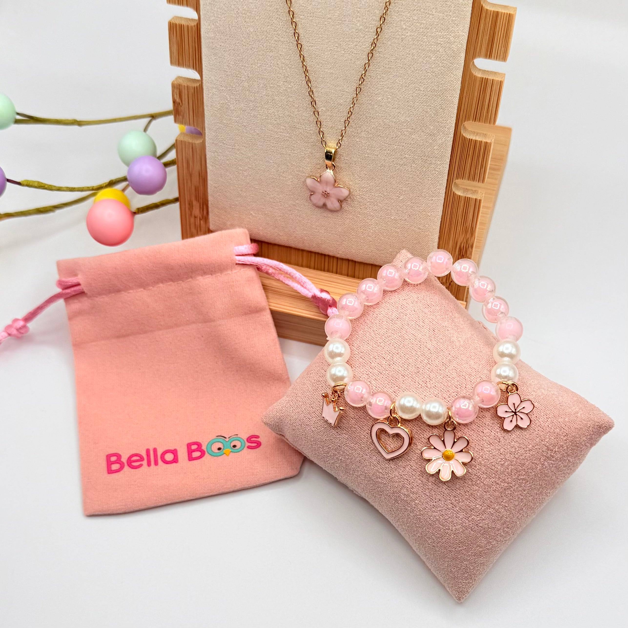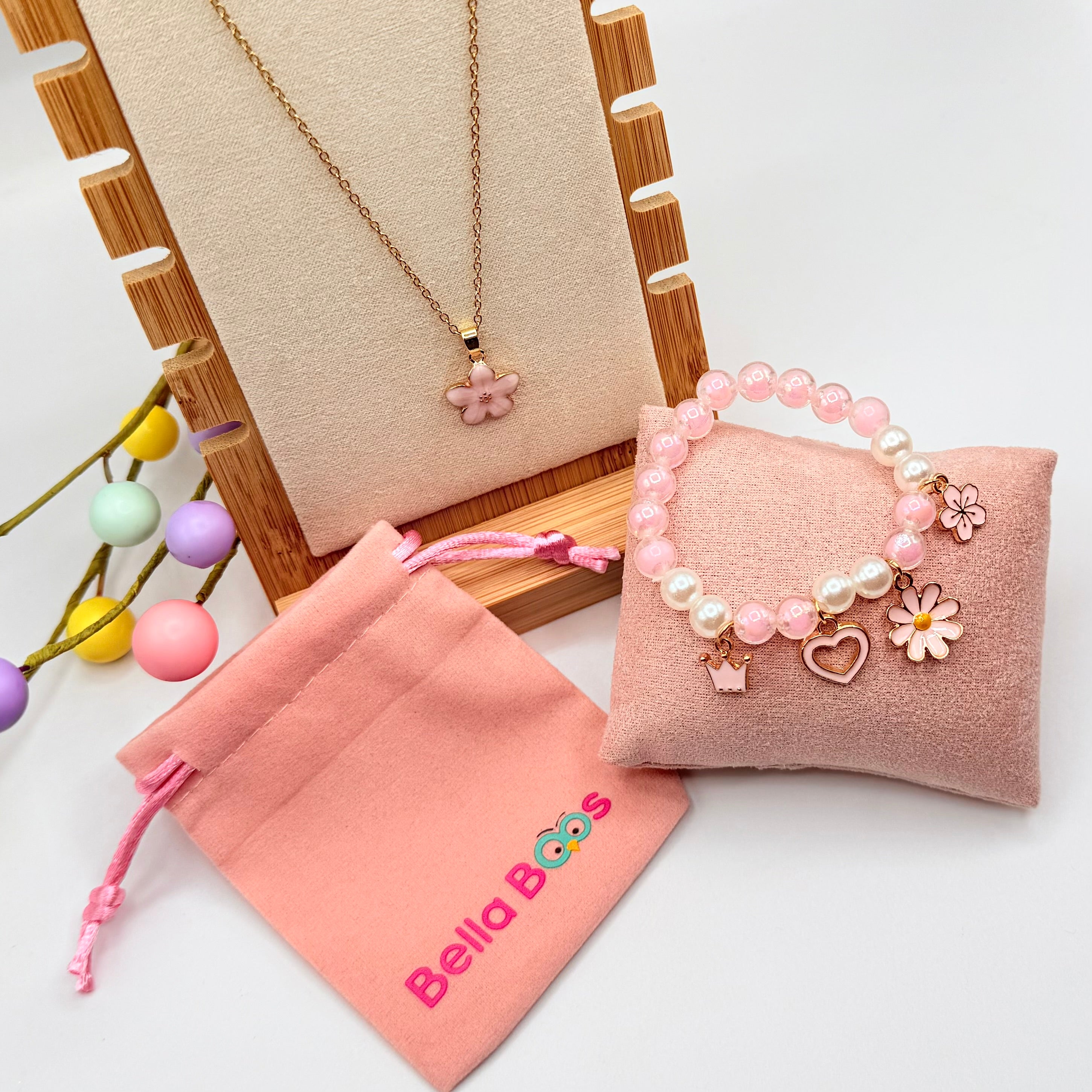 A beautiful set that contains a gold tone necklace with a pretty pink flower pendant. Comes with an elasticated, beaded bracelet that has four great charms attached. A perfect set that comes presented in a great drawstring pouch. Makes a fantastic gift to give for any young girl.