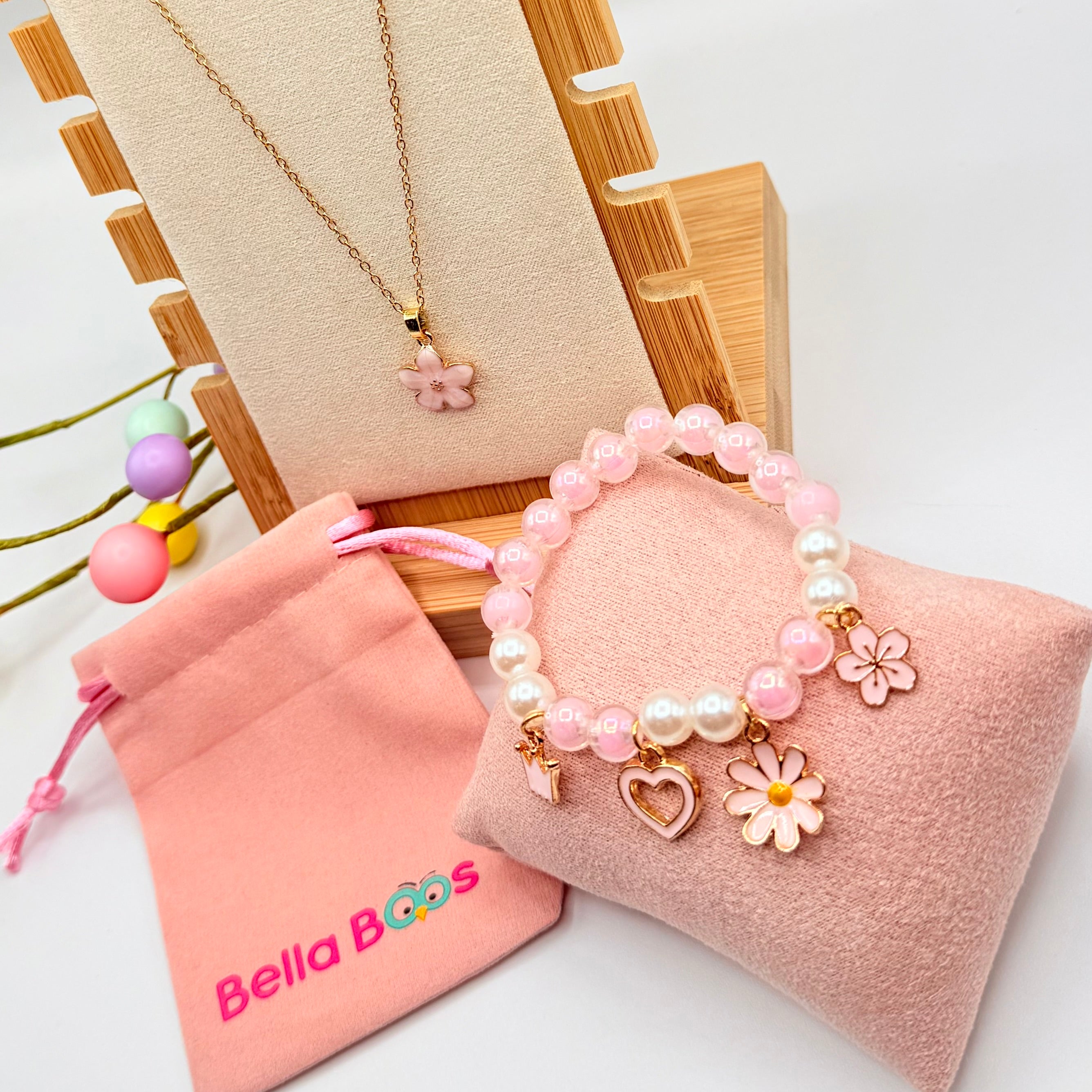 Pretty Pink Flower Necklace & Bracelet Gift Set