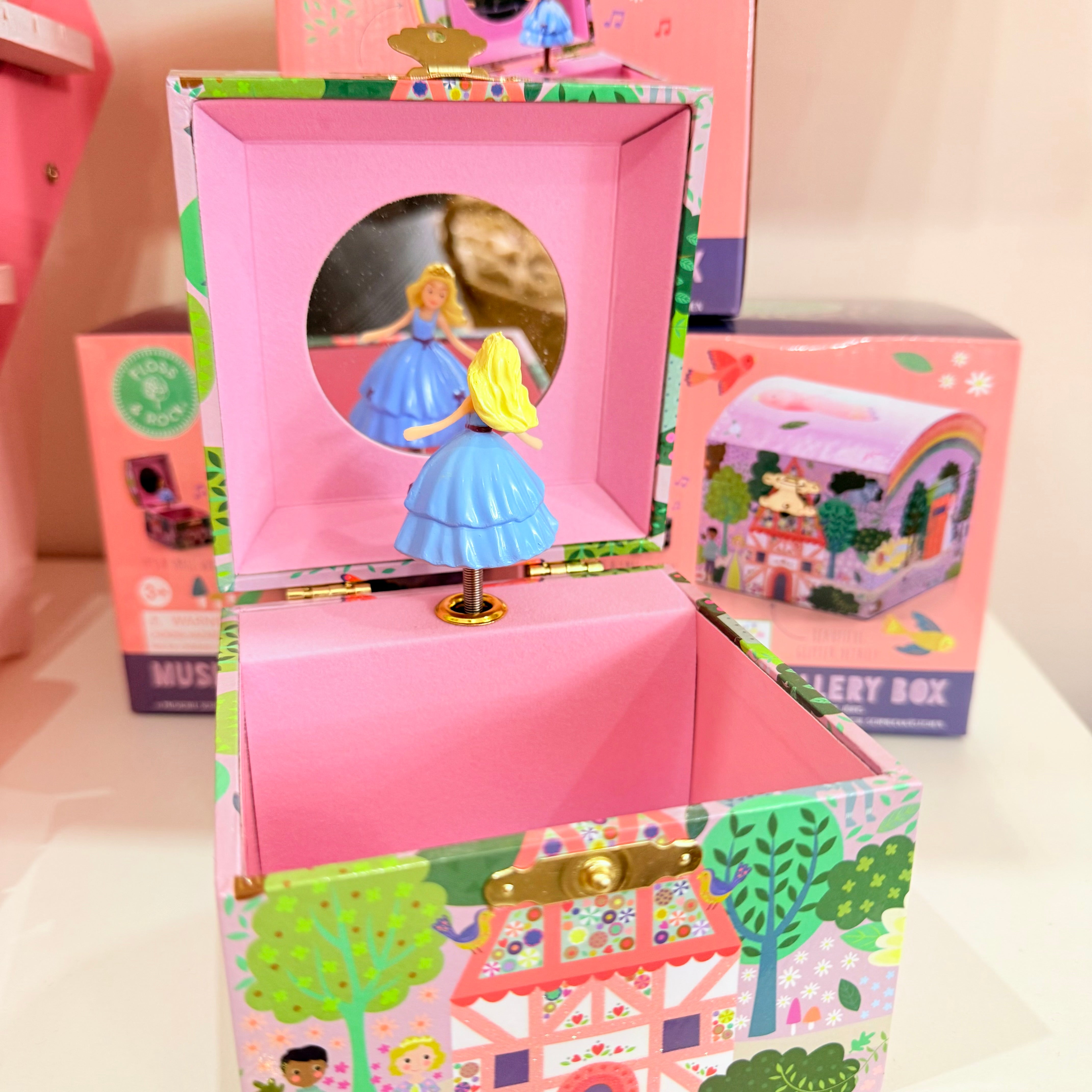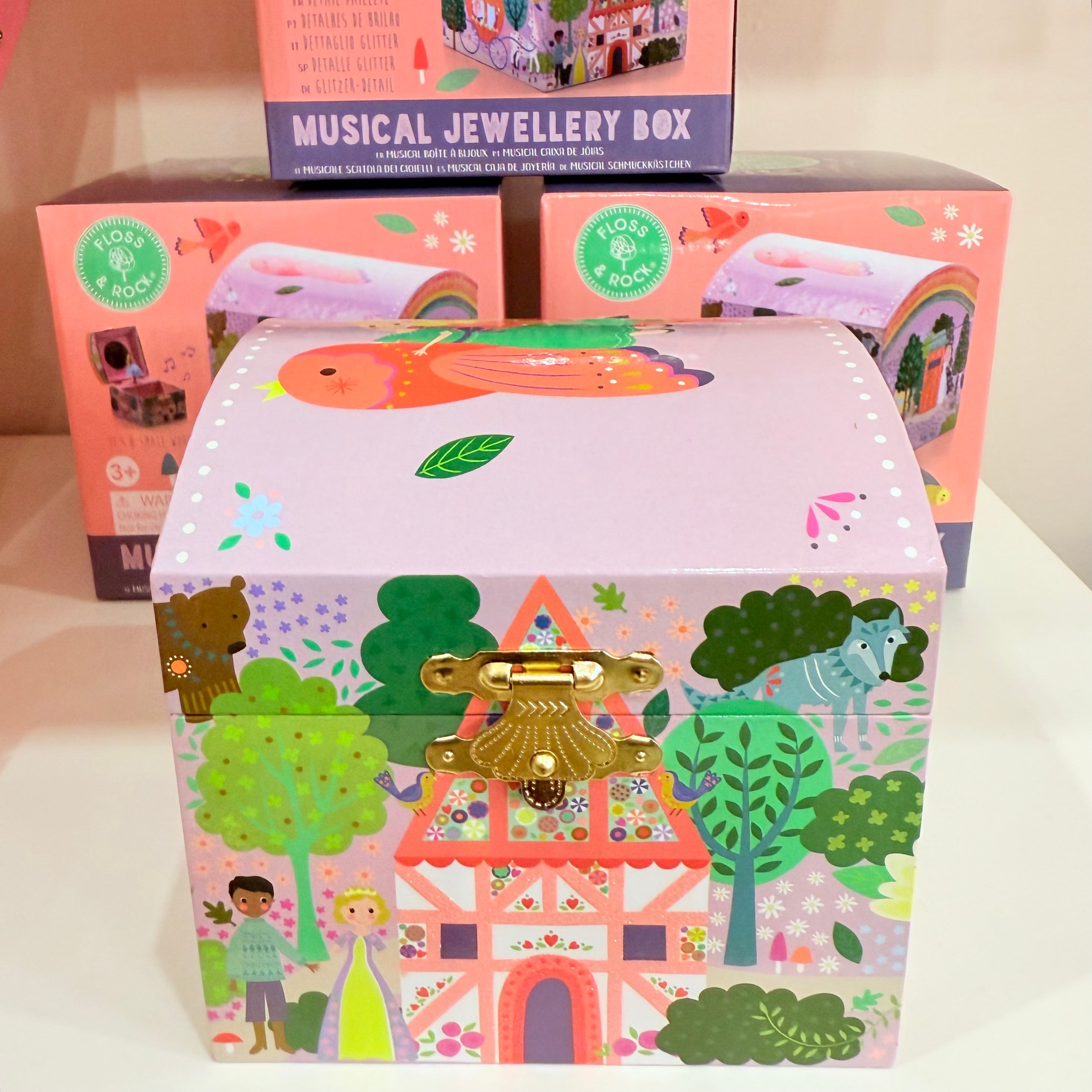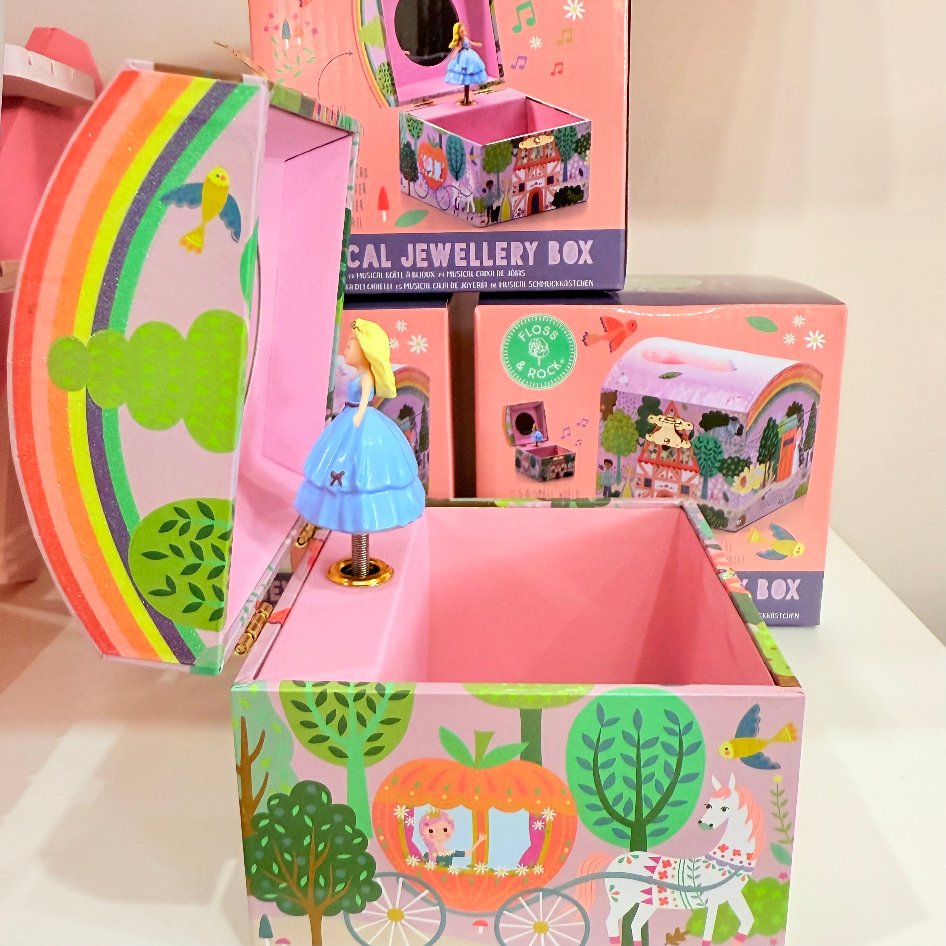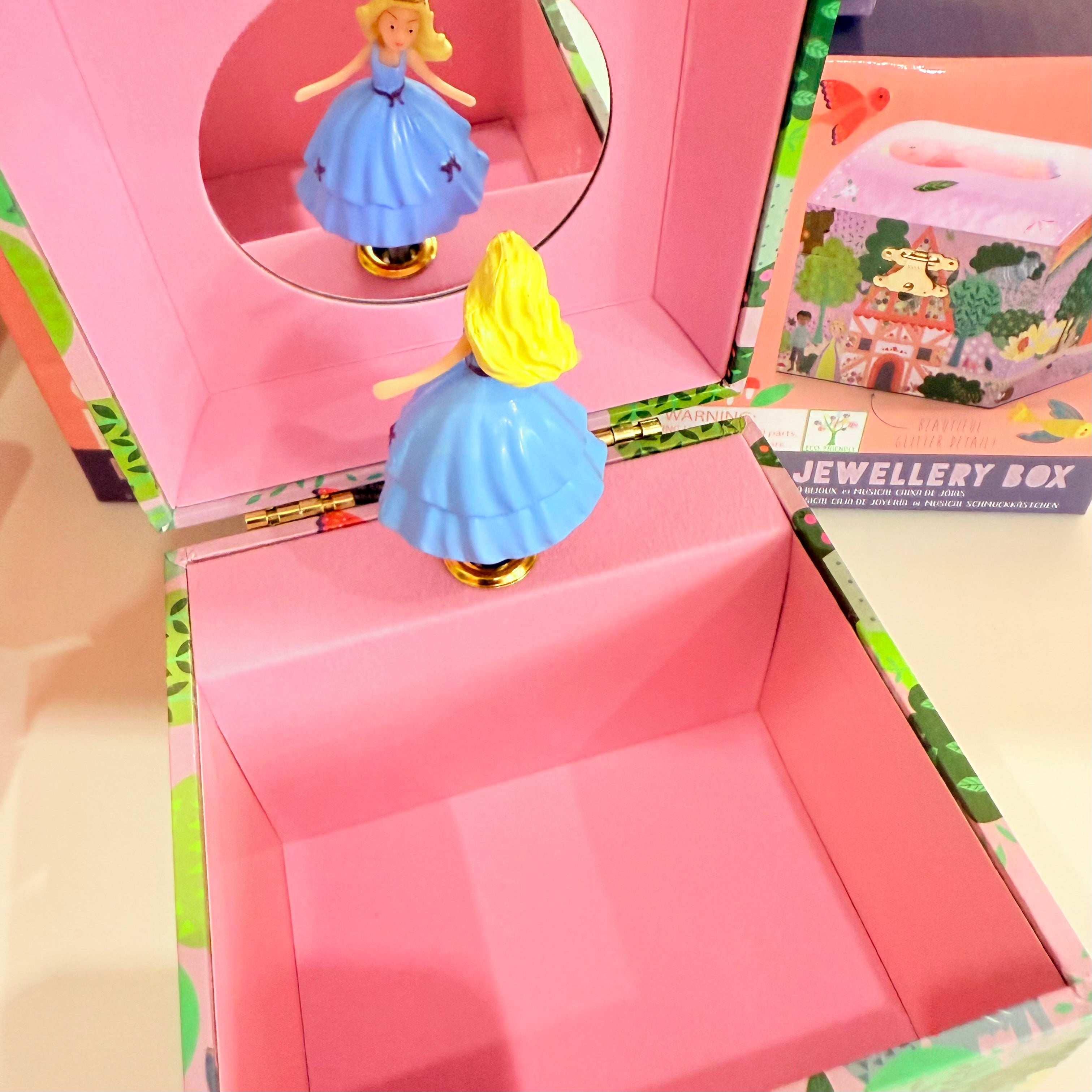 With a lovely dome roof this musical jewellery box is themed in our Fairy Tale land. Featuring Princesses, horse & carriage, secret gardens and amazing glittered rainbows. Turn the winder and open the lid to reveal a princess figurine that swirls around to the tune of 'It's a small world'. With plenty of space to keep your trinkets inside. This comes beautifully gift boxed in a full colour box to make it extra special. Turn the winder and open the lid to hear the music play. Glitter detail on the jewellery box. Swirling figurine. Perfect for storing little trinkets. Includes our new colourful gift boxes.