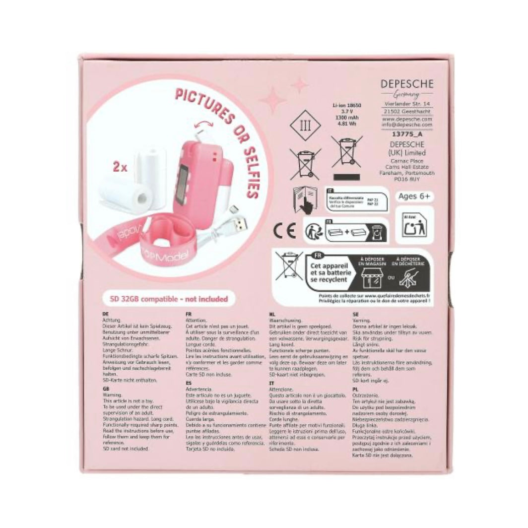 Smile, print, and enjoy! The pink TOPModel digital camera with its cute double-model design has a built-in printer (gray thermal printing). The camera lens can be rotated forward or, for selfies, backward. Images can be saved by inserting an SD card (32 GB, not included!). Included are: 2 rolls of printer paper (50-60 prints per roll), a charging cable, a lanyard, and an instruction manual. The camera's menu can be set to English, French, German, Polish, Dutch, Italian, Spanish, and Swedish. The included battery (USB-C connection) is not replaceable.