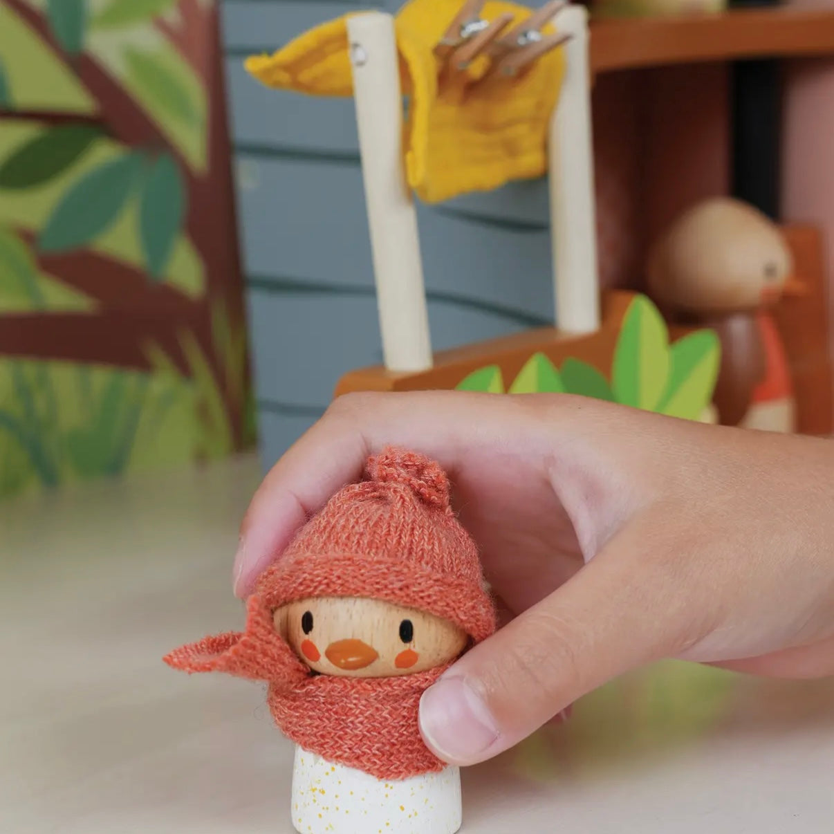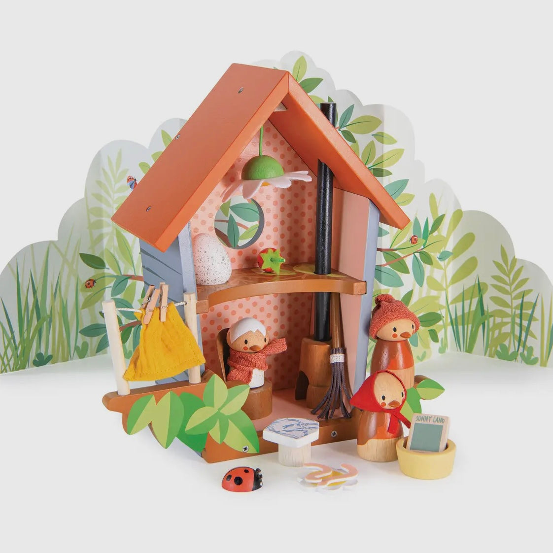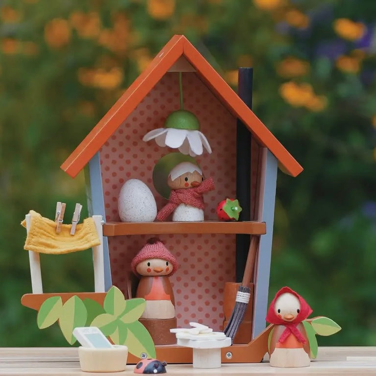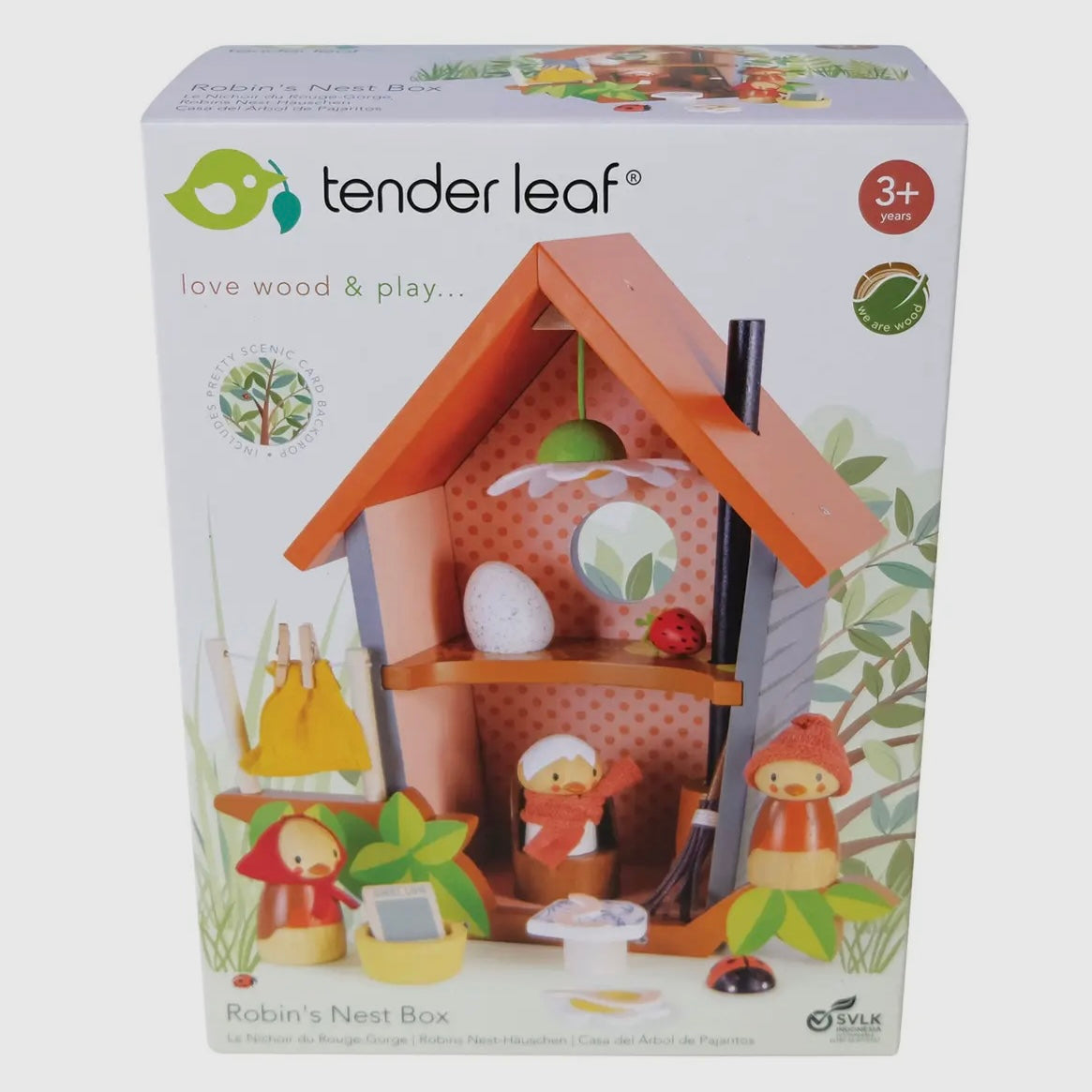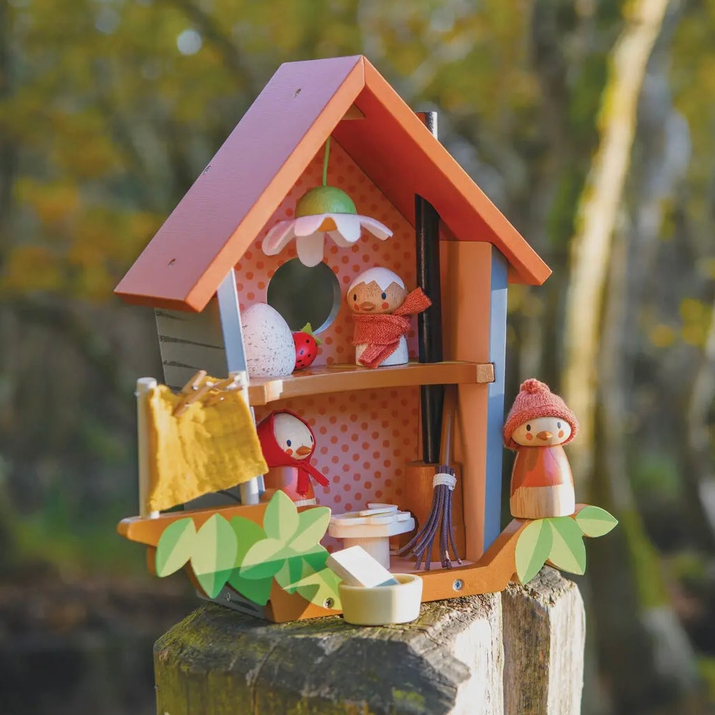 Create a world of magical imagination. Brought to you by Tender Leaf Toys. Meet Robin and his growing family! Mother Ruby and baby Rosy who has just hatched out are eagerly watching the egg upstairs. Ruby is busy washing the sheets and hanging them on the line, while preparing a meal of juicy worms! A fold out printed backdrop completes the scene and encourages more storytelling! Good for imaginative play and good for story telling.