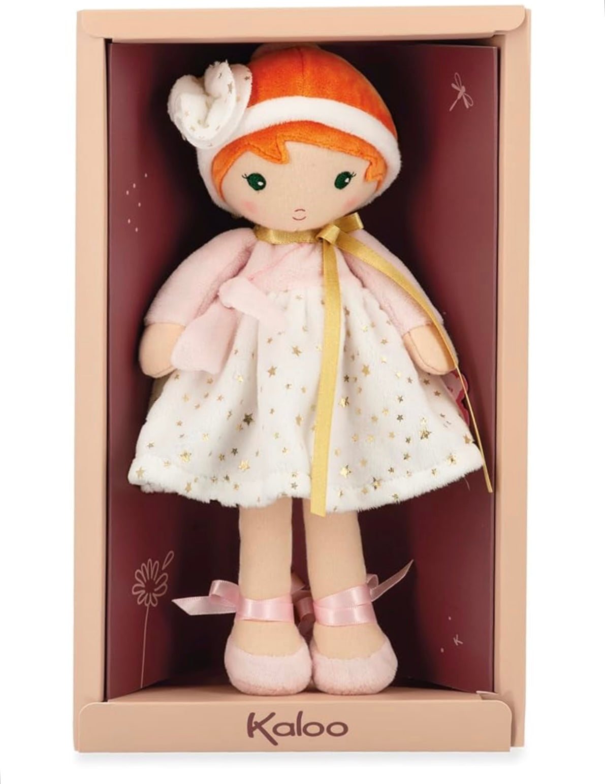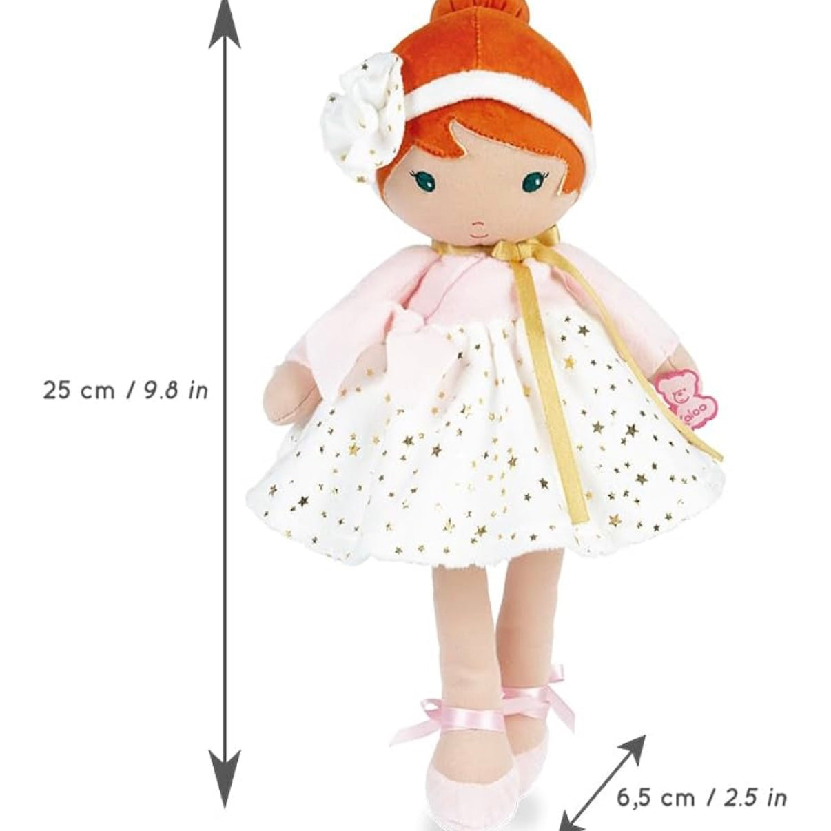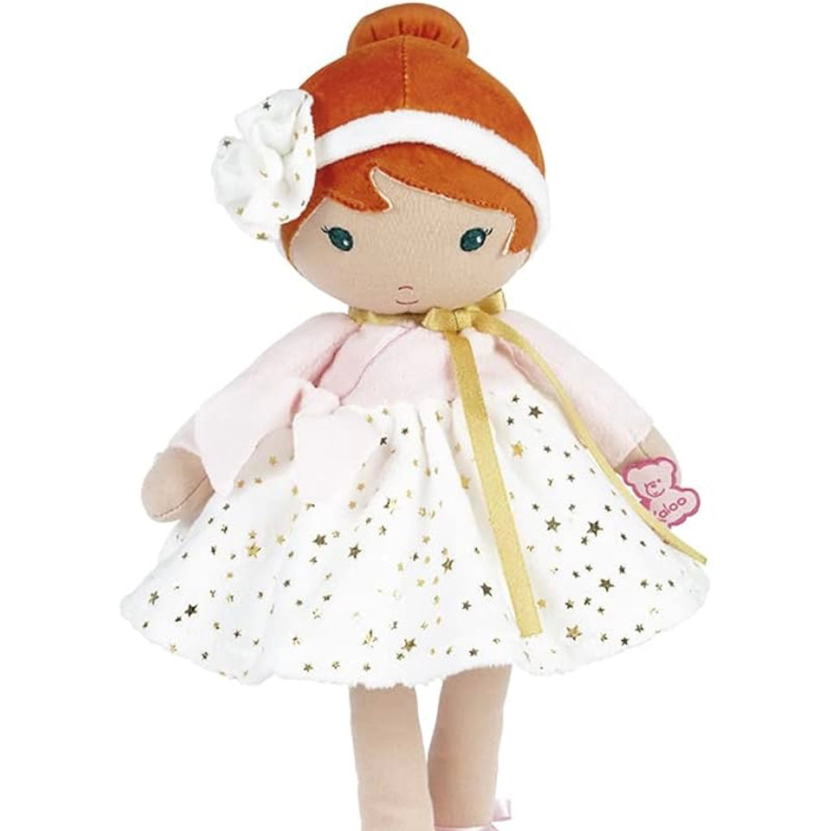 Meet Valentine, the 9,75 inches ballerina who will fascinate all little ballet fans! Dressed in a powder pink wrap-over top embellished with a golden scarf and an oh-so-soft champagne-coloured star print skirt, Valentine reveals delicate, refined style. Her red hair distinguishes her from other Tendresse dolls. Machine washable.