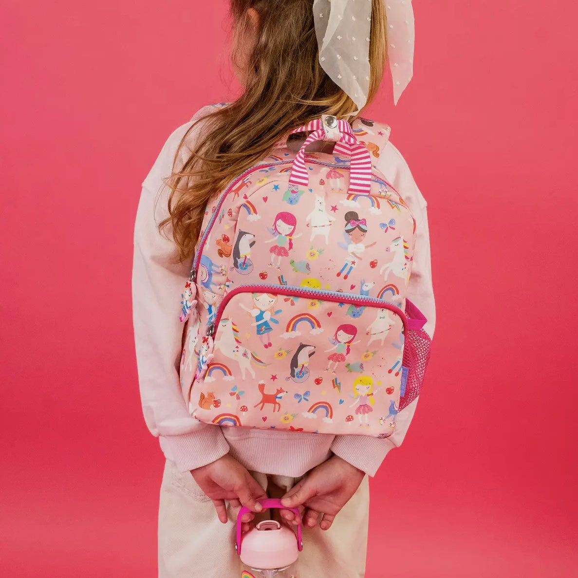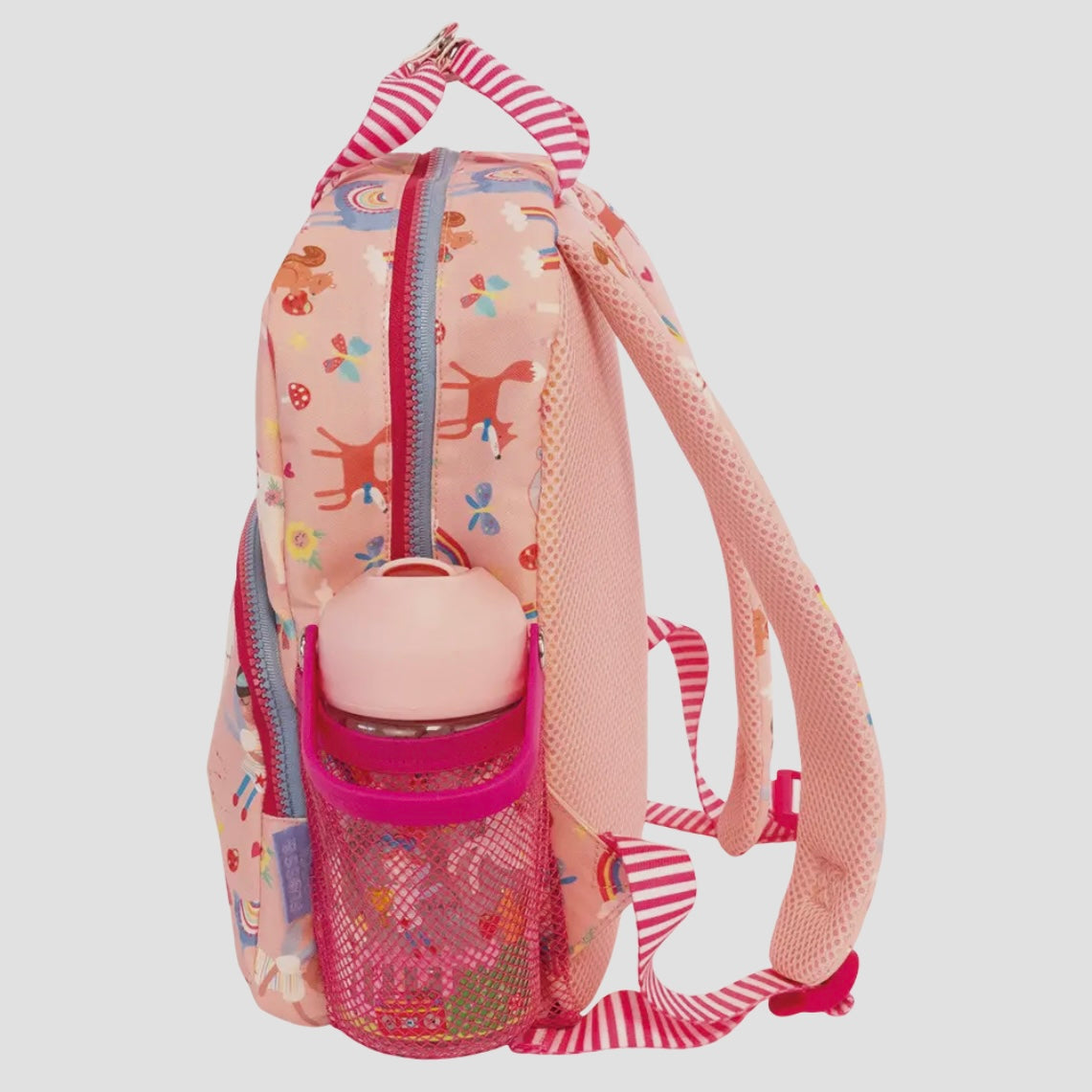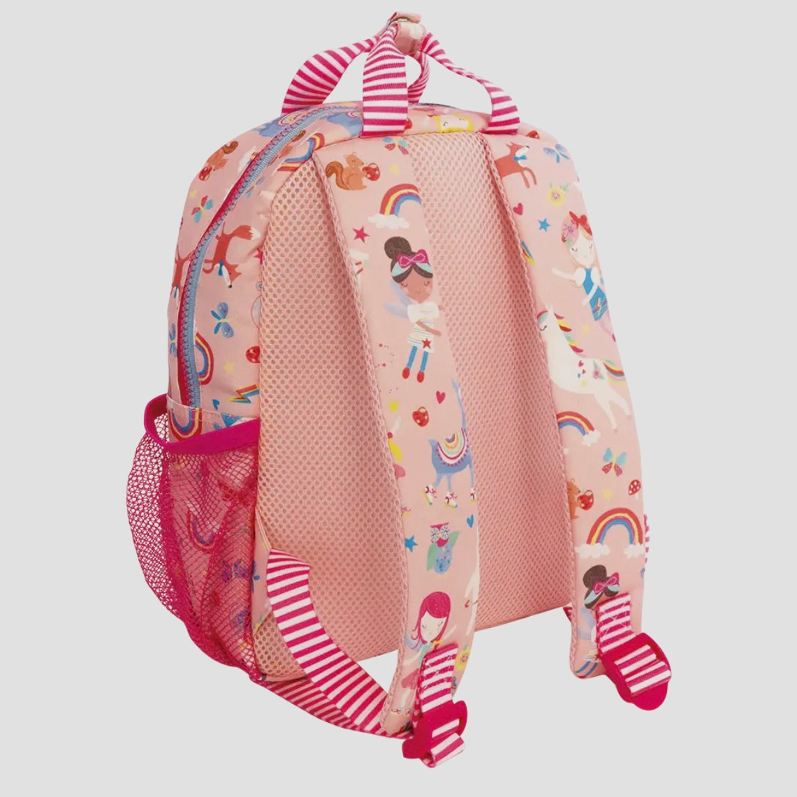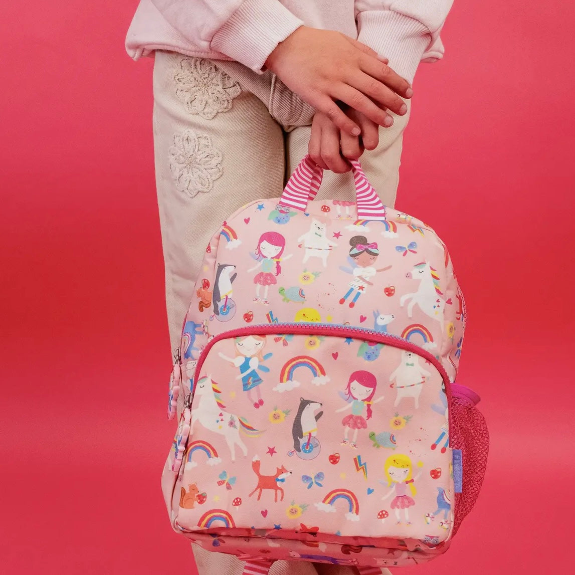 Perfect for school, holidays and adventures - our super cool, bright and FUN Backpacks are sure to stand out from the crowd. Made with water resistant recycled fabric material, all of your important treasures inside will remain lovely and dry! Our Backpacks feature padded and adjustable straps, 2 funky shaped zip pulls, a handy carry handle and a side pocket for holding your drinks bottle. The inside is fully lined, with an 'I belong to...' label for personalisation. FEATURES Made from recycled materials Padded, adjustable shoulder straps Front pocket with zip Chunky, fun shaped zip pulls A side pocket for holding drinks bottles Carry loop on top for hanging it up ‘I belong to....’ label sewn in on the inside Wipe clean Eco-friendly Recommended age 3+ DIMENSIONS 30 x 24 x 10cm