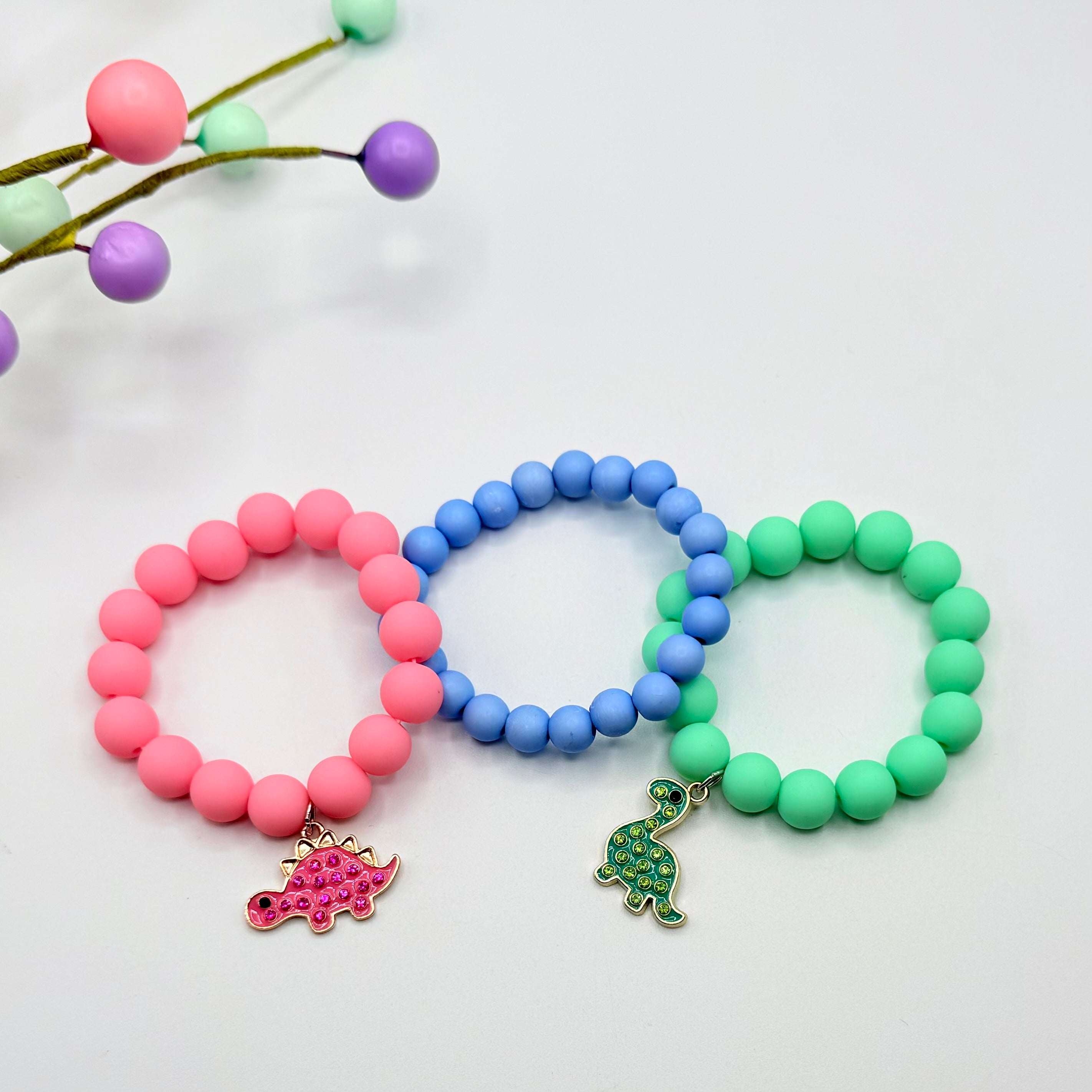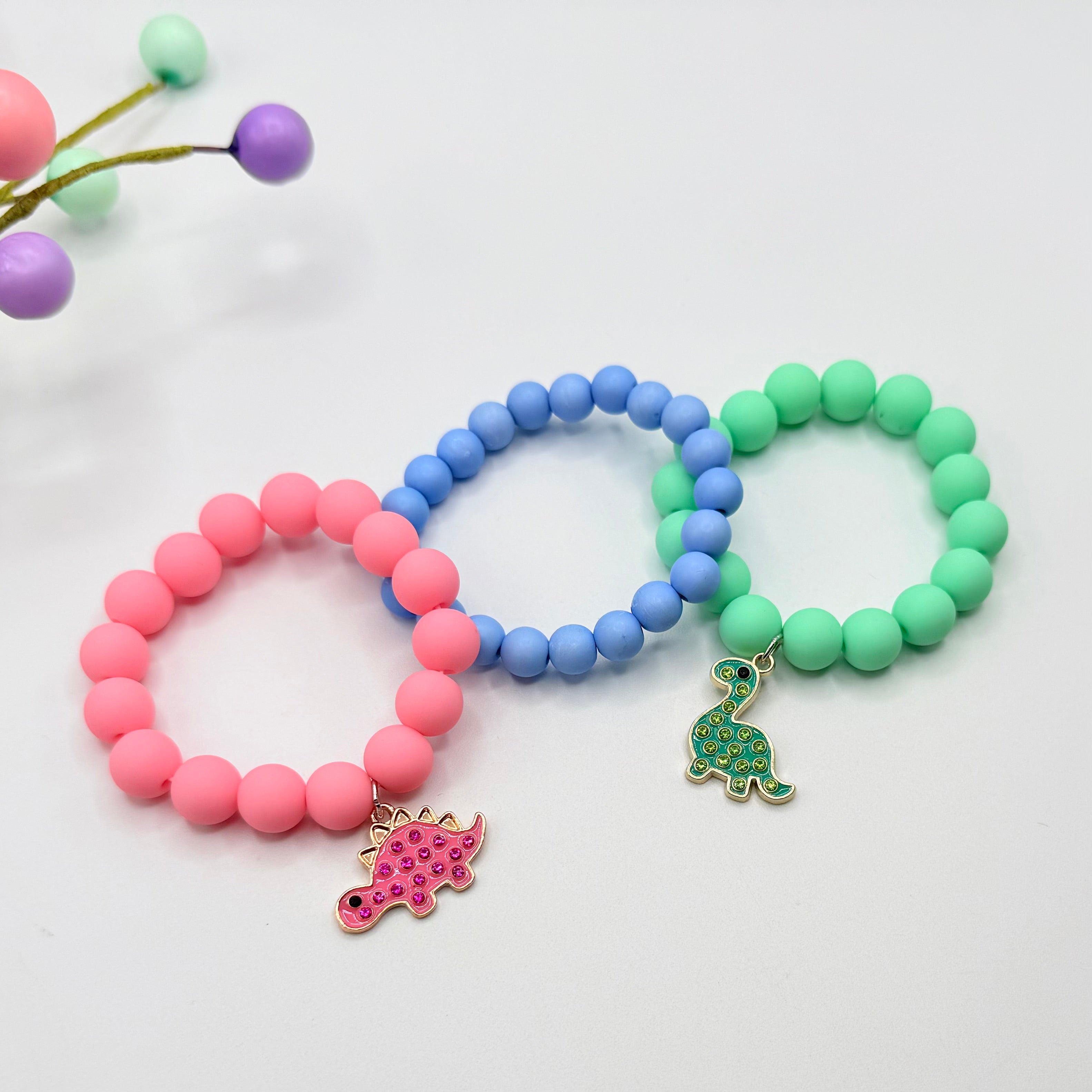A lovely set Of 3, elasticated beaded bracelets in the colours pink, blue and green. 2 bracelets with sparkly Dino charms. Super cute and make a great gift.