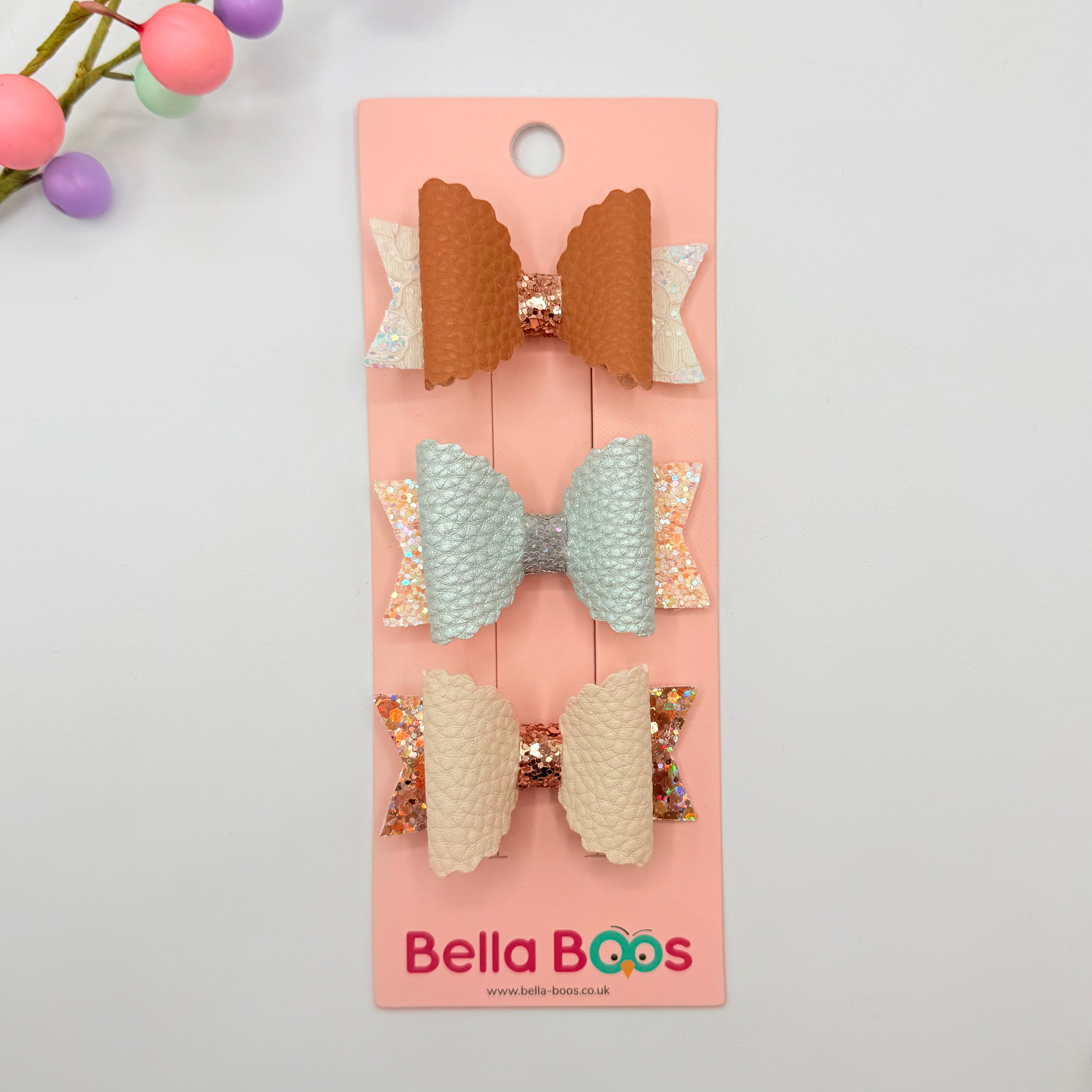 A lovely set of 3 hair bows. All made in pretty fabrics and each fitted with crocodile style clips to the underside for a firm hold.