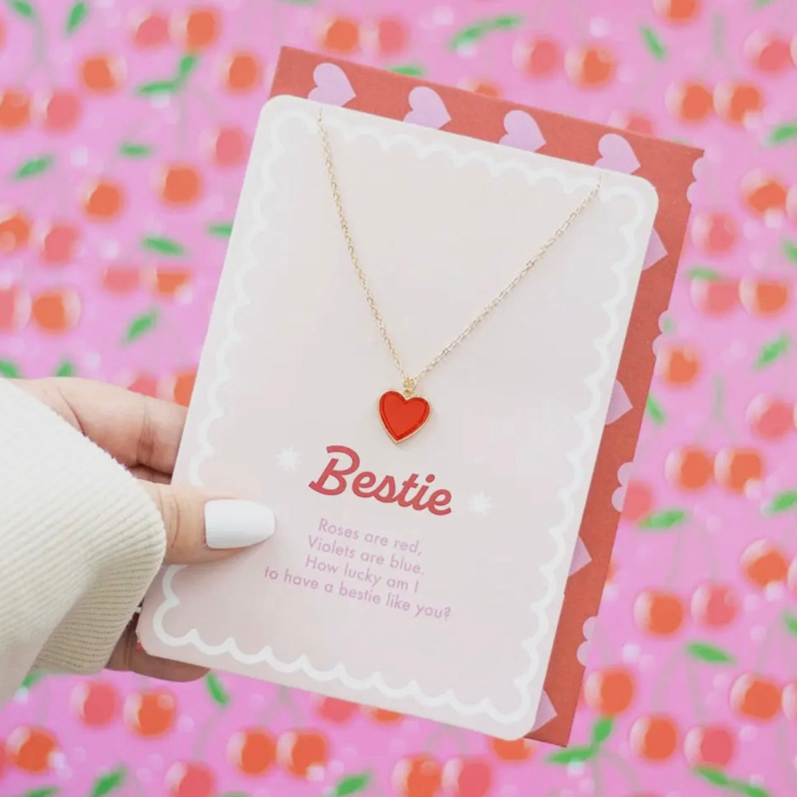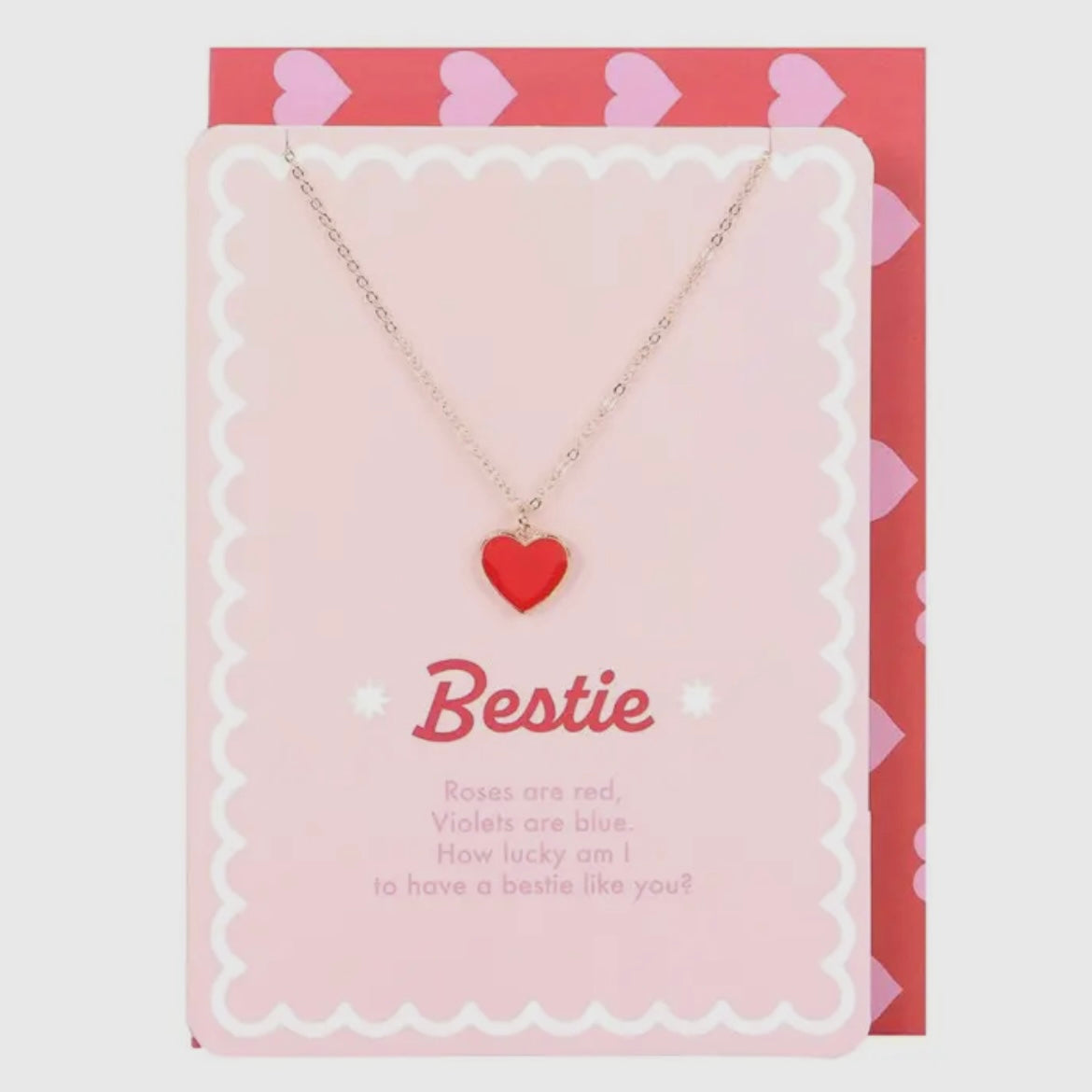 Spread the love this Valentine's and show your bestie how much they mean to you with this 'Bestie' enamel heart necklace which is presented on a matching greeting card featuring the poem 'Roses are red, violets are blue, how lucky am I to have a bestie like you?'. A perfect gifting idea for friends. Nickel-free. Made from stainless steel. Designed by Something Different and part of the 'Love Struck' collection of contemporary Valentine's gifts.