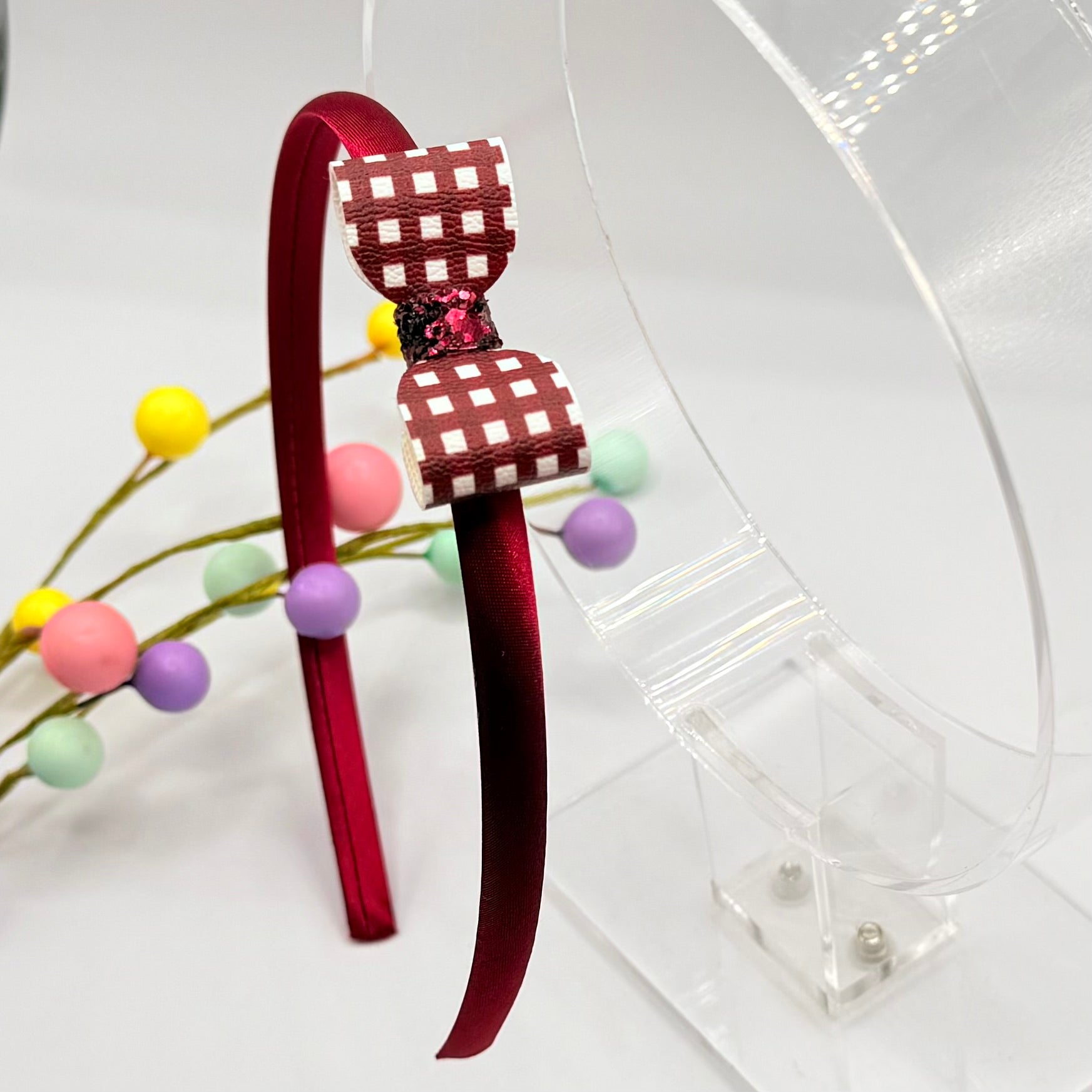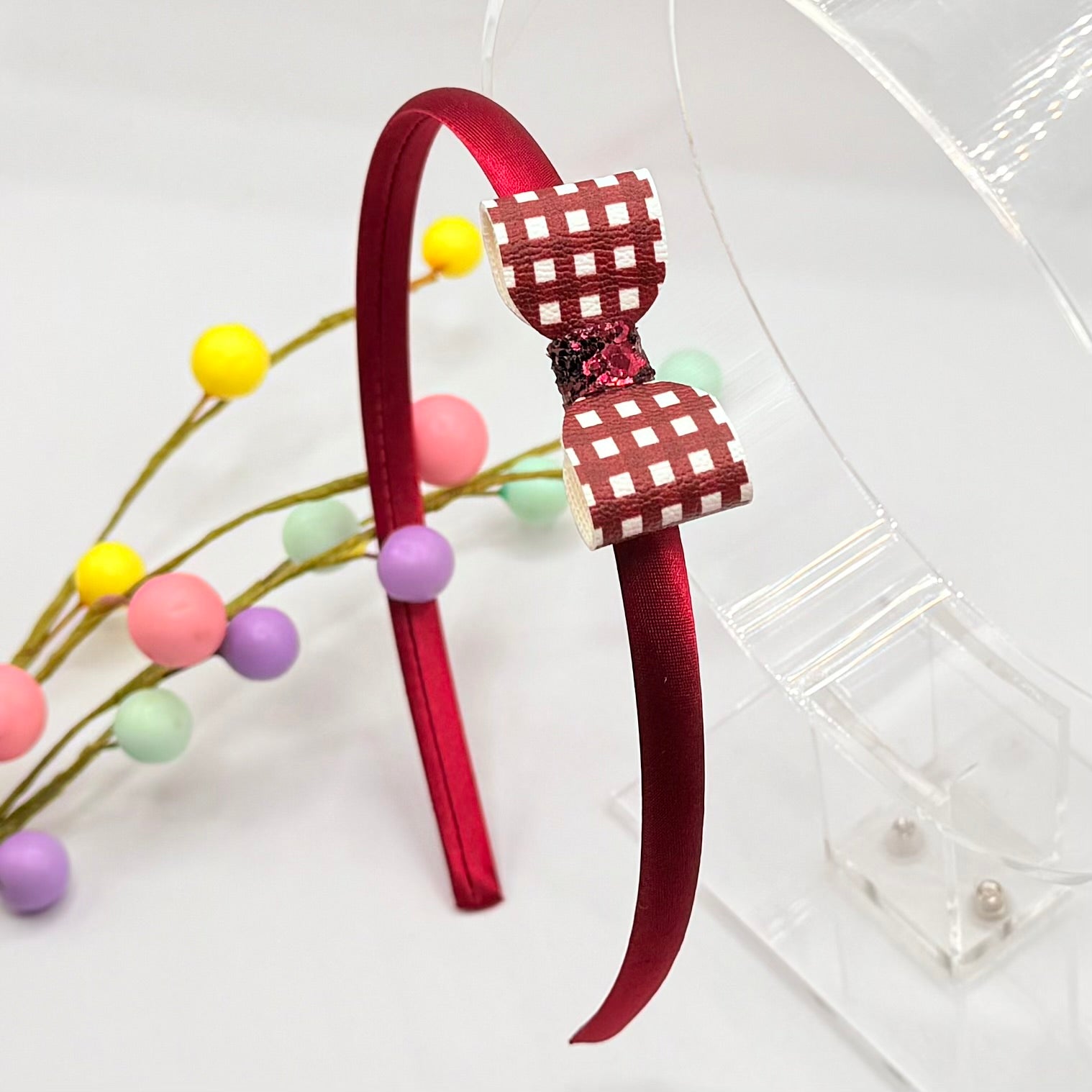 A pretty velvet effect bow attached to a , Checked effect lined Alice style hair band.