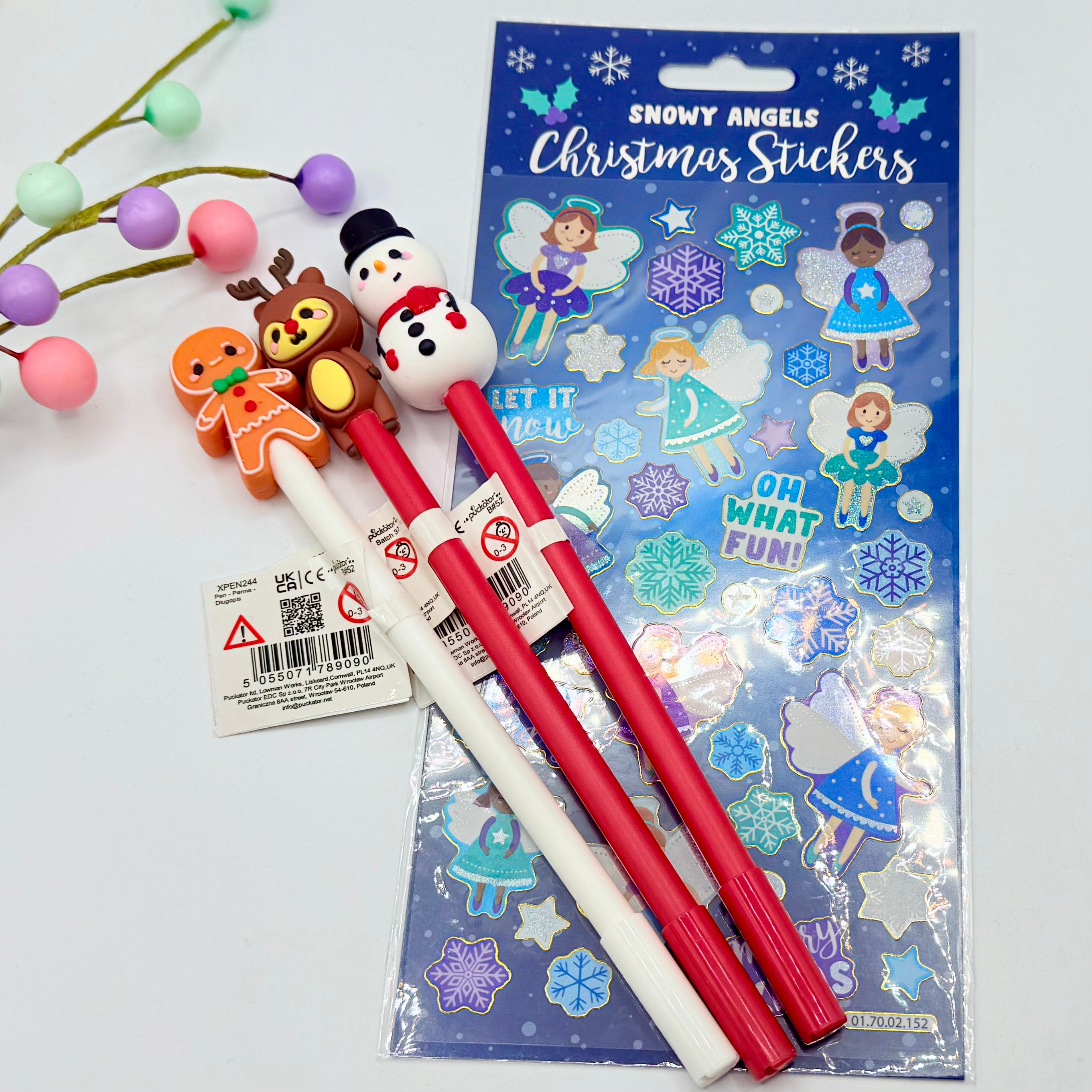 A festive assortment of stickers along with a fun set of 3 Christmas themed pens.
