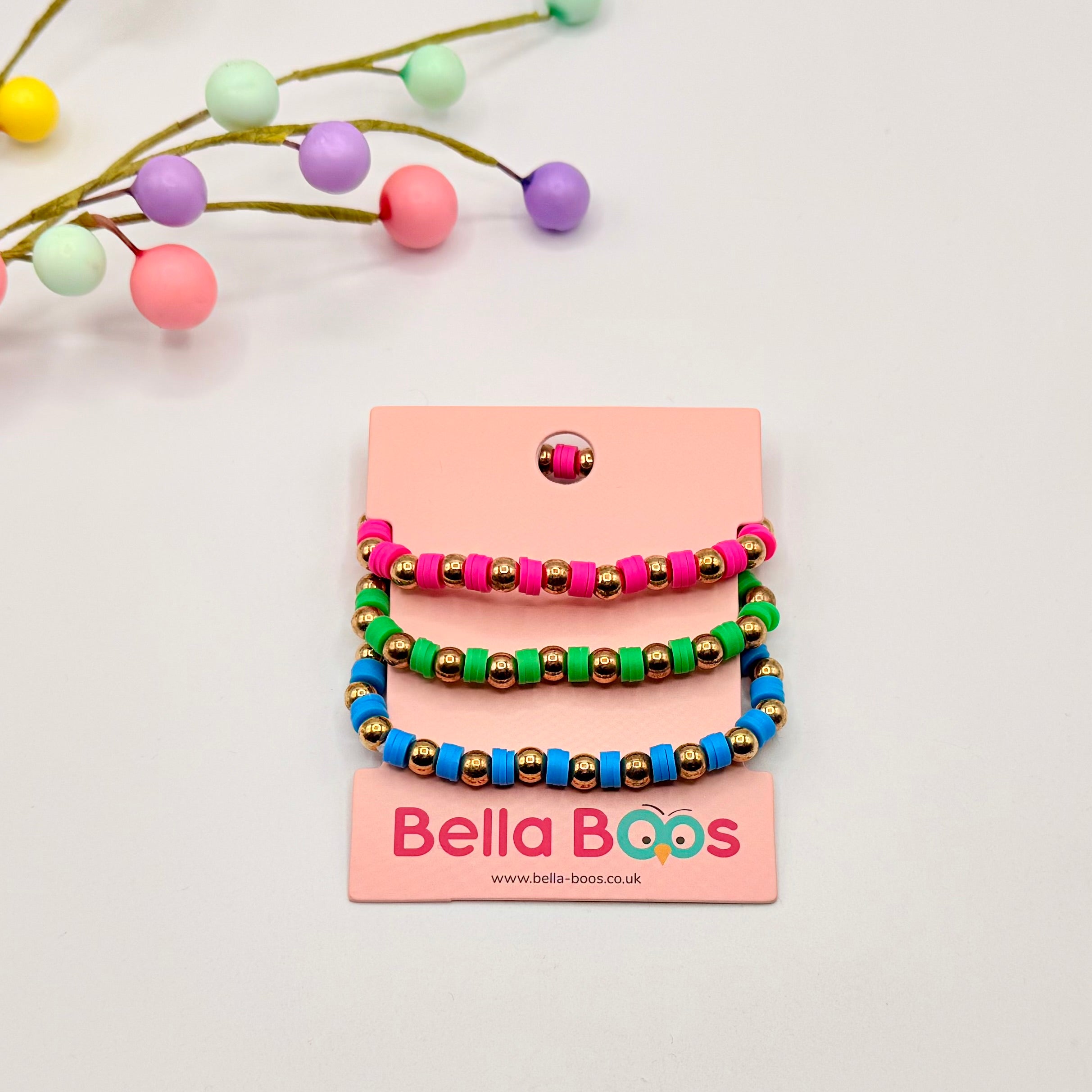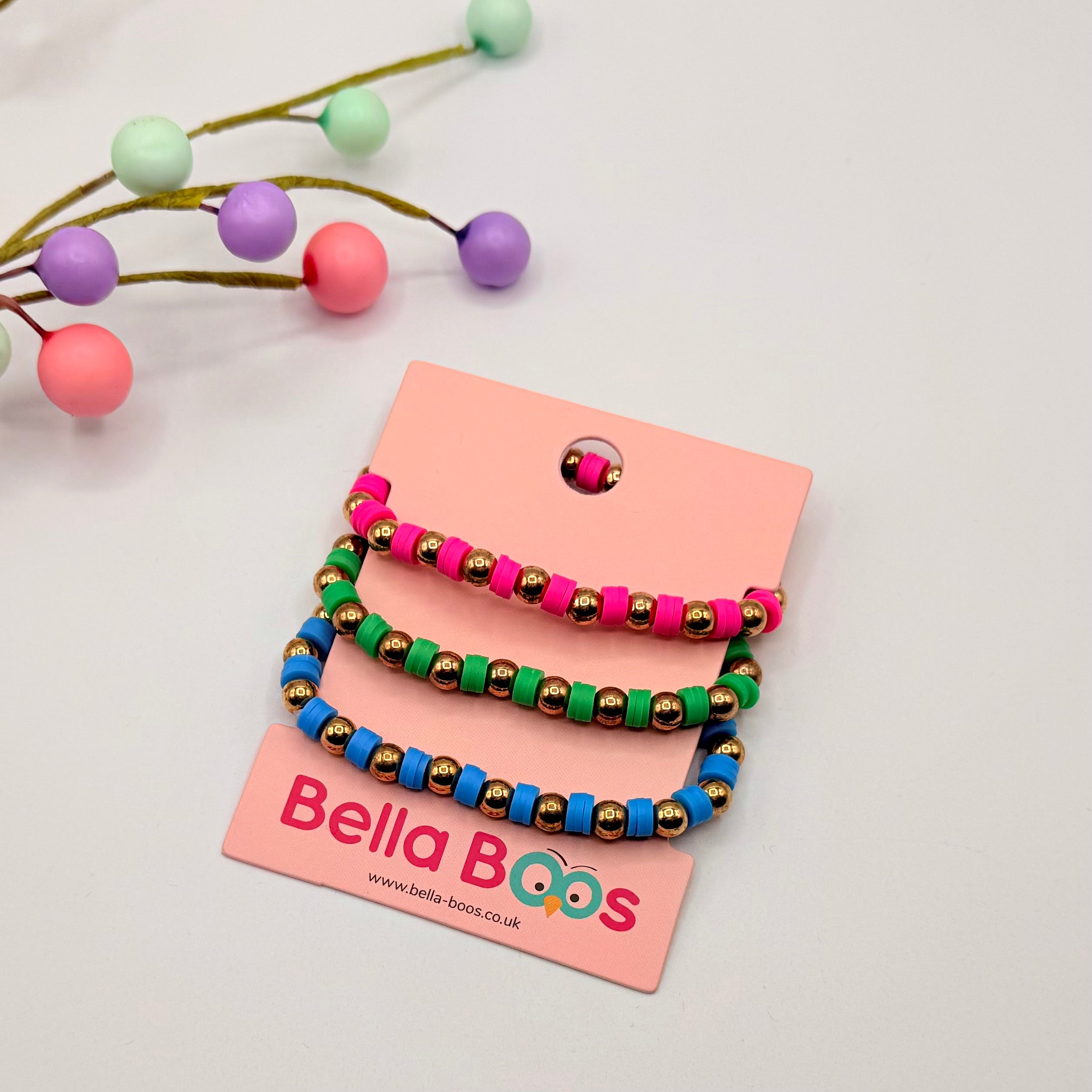 A lovely set of 3, elasticated style beaded bracelets. Vibrant colours that will be sure to add a touch of WOW to any outfit. Come ready to give in lovely, pink velvet effect, branded Bellaboos pouch.