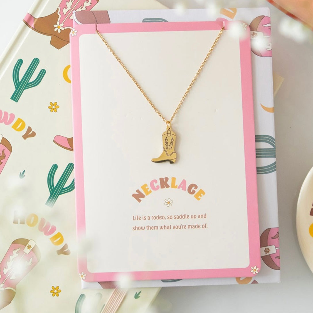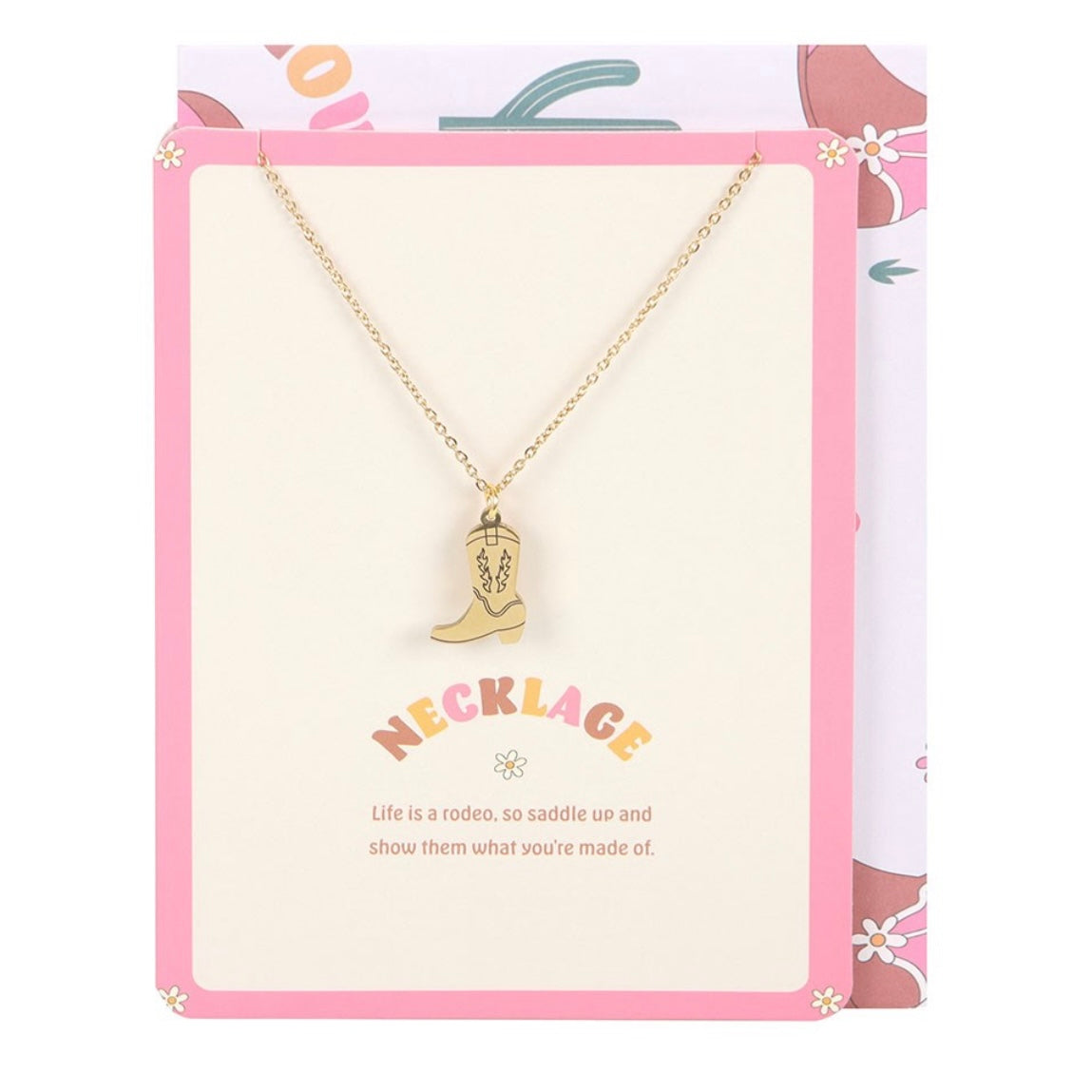 This girly necklace is a yee-haw worthy gift featuring a cowgirl boot pendant. Presented on a fun greeting card that reads, 'Life is a rodeo, so saddle up and show that what youre made of'. The ideal gift for any friend. Nickel free stainless steel. Card left blank inside. Envelope included.