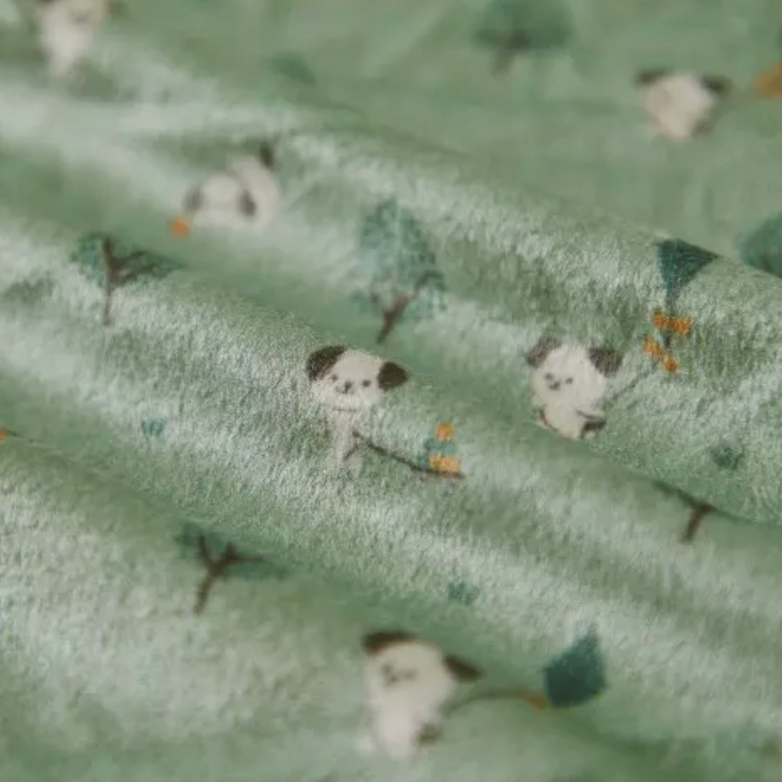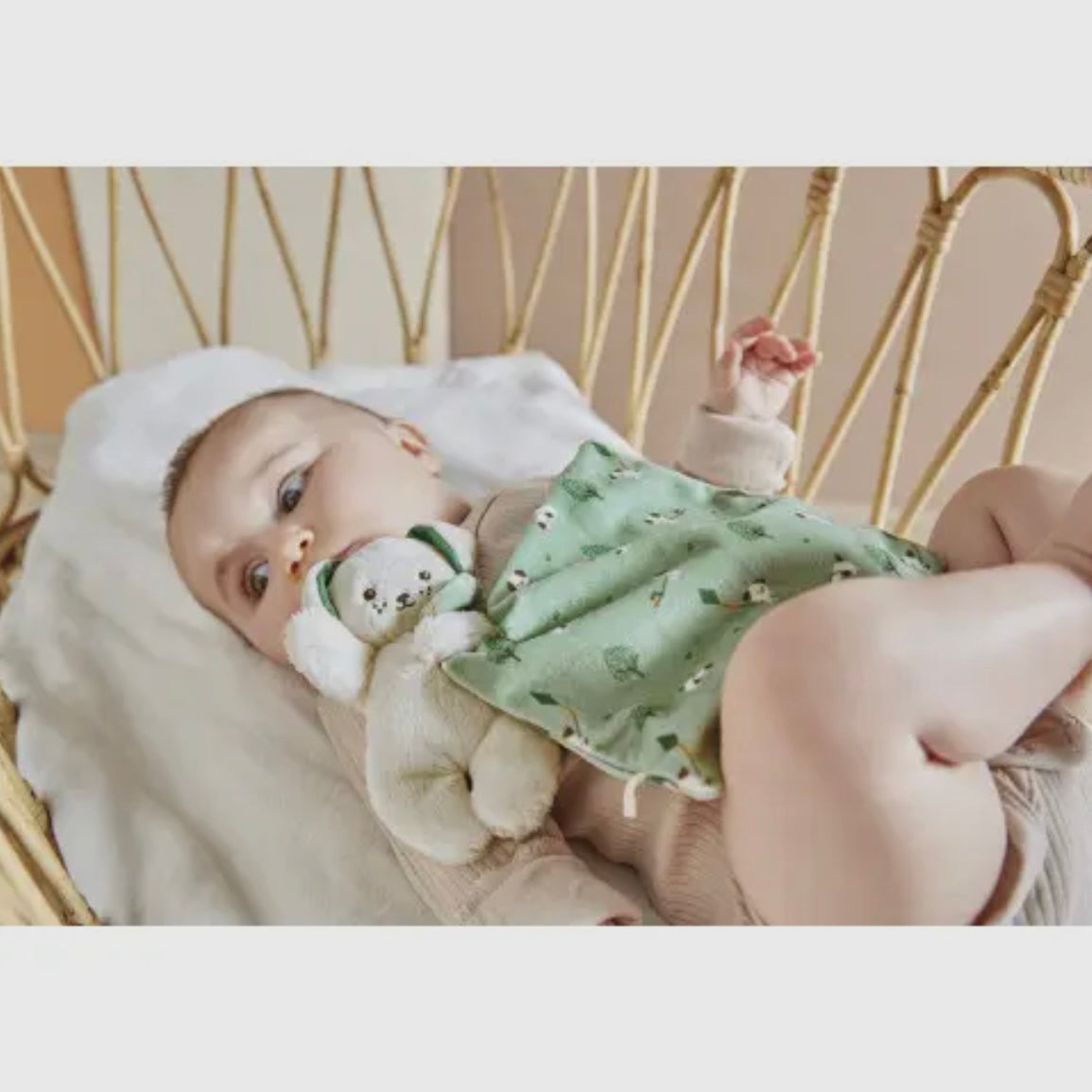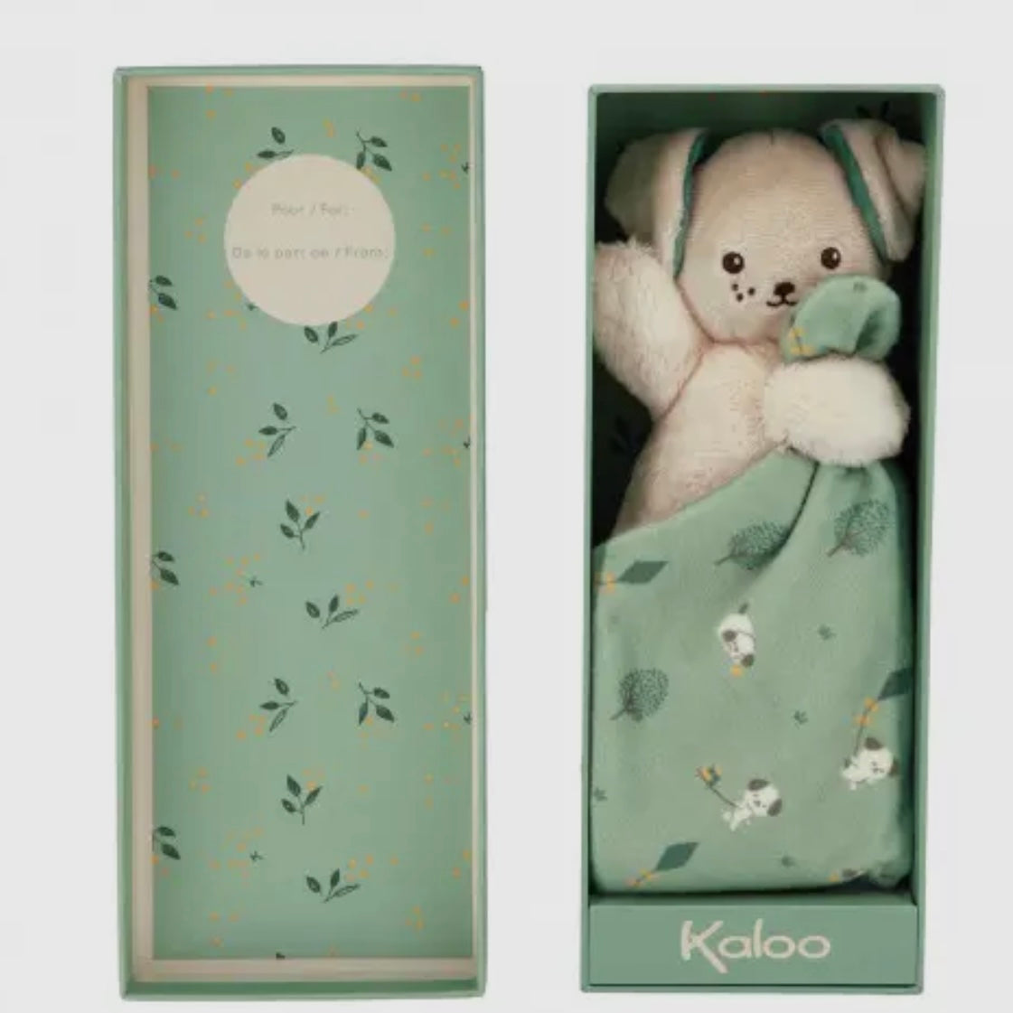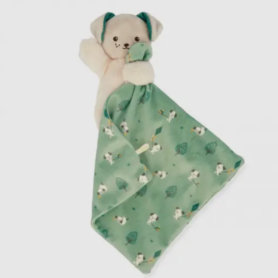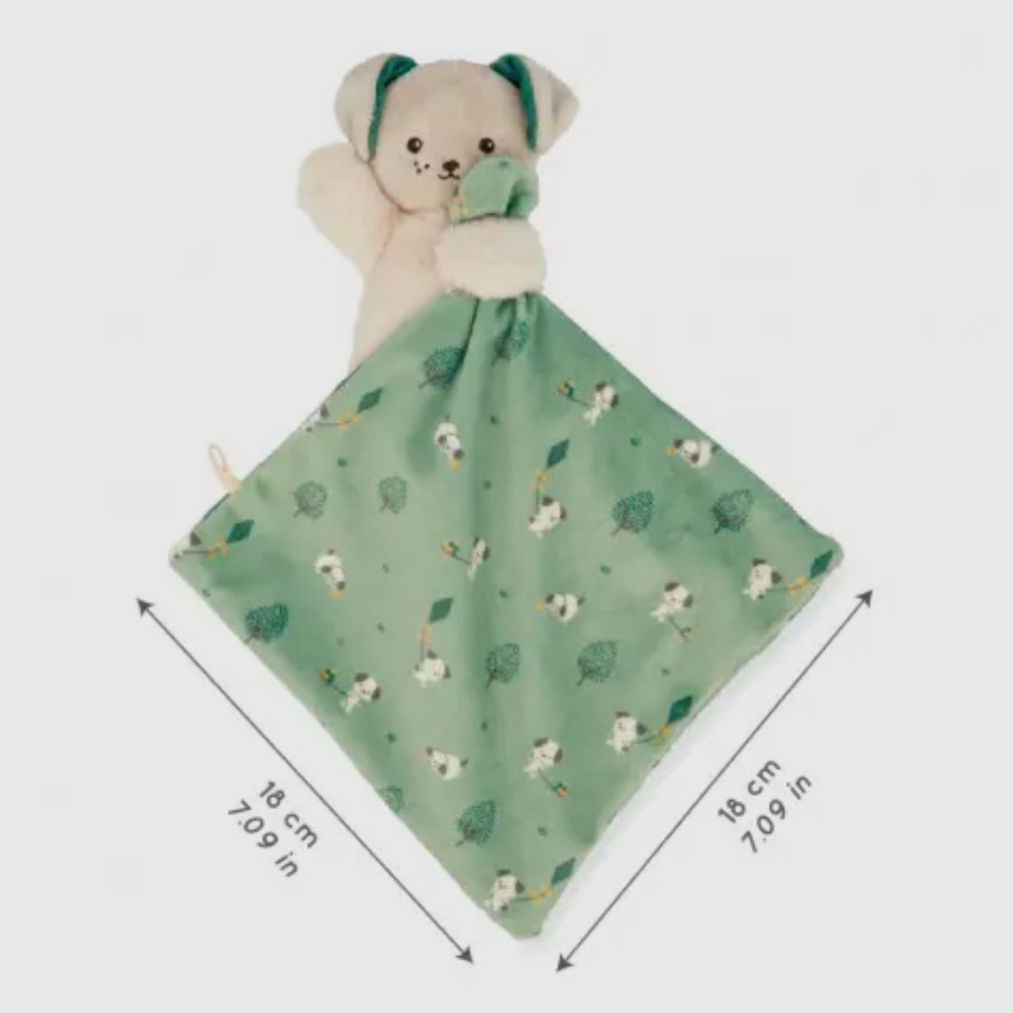 This dog enveloped in 7.09 inch green colour square of softness will be baby's favourite companion. Particular care has been taken in selecting 95% recycled materials and stuffing. With its small fluffy fur body, the dog is easy to grasp and hold by its body or its big ears. The micro-velvet square blanket between his hands is decorated with drawings of the story of a little dog playing. The colour of the delicate and poetic print is found in the dog's ears and enhances the whole. Presented in a beautiful gift box that can be reused as a storage case. It's the perfect comforter for a gift made from recycled materials. Machine washable at 30°. From birth.