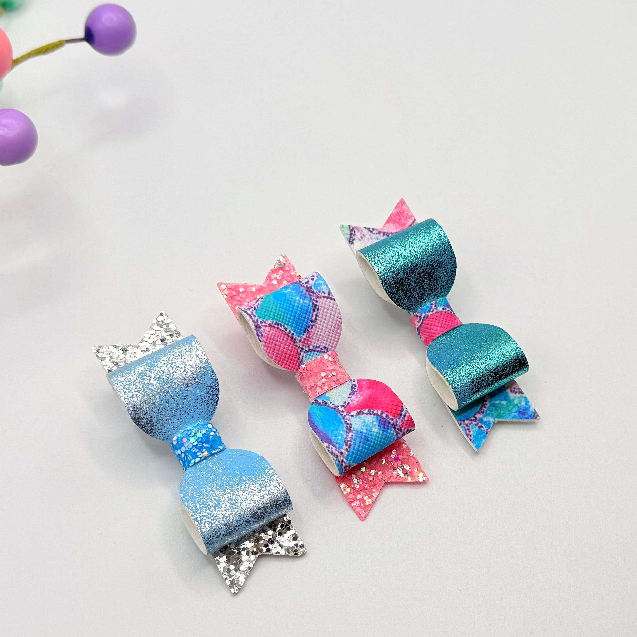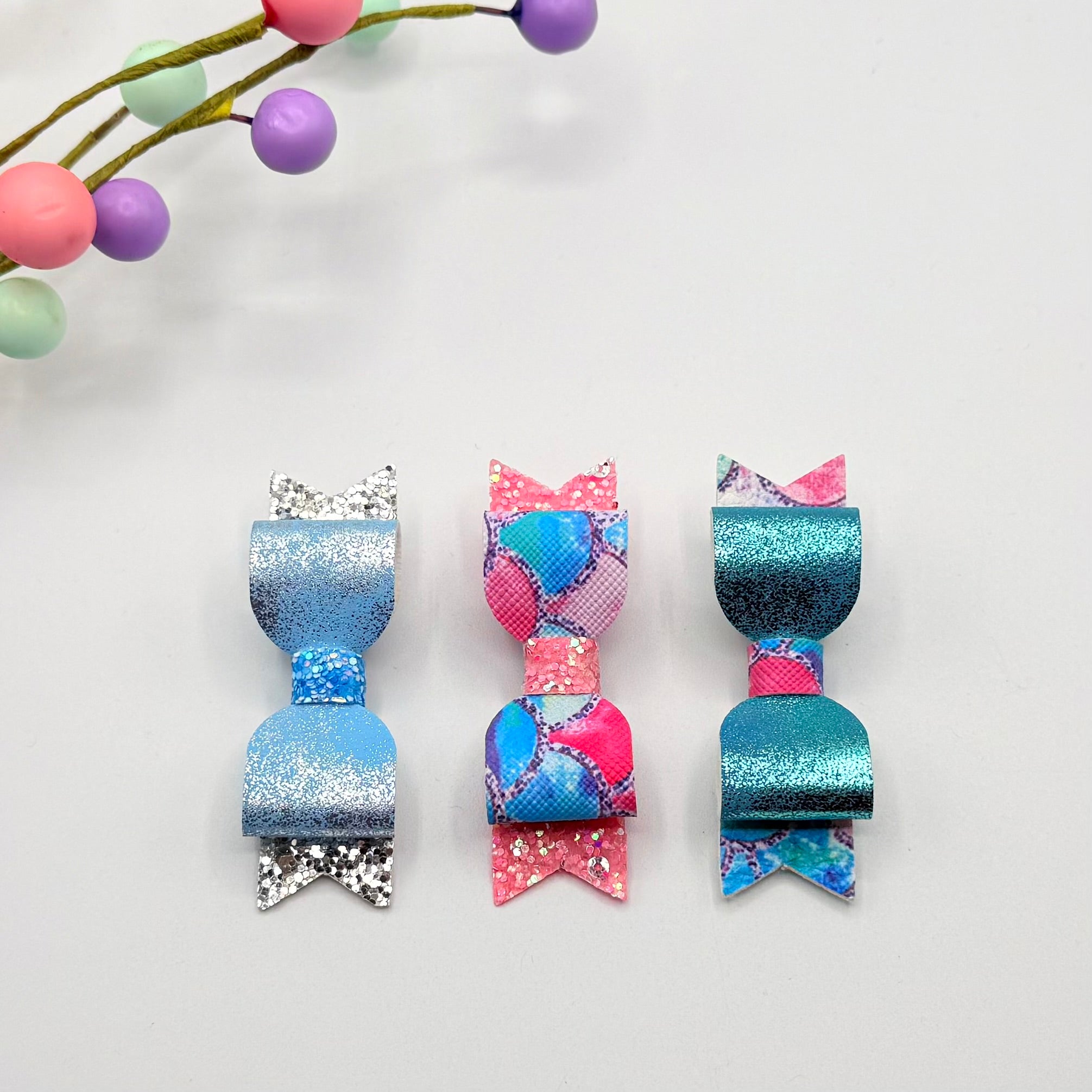 A set of 3 pretty hairs bows, all made in lovely fabrics, all fitted with crocodile clips and each approx 6.5 by 2cm.