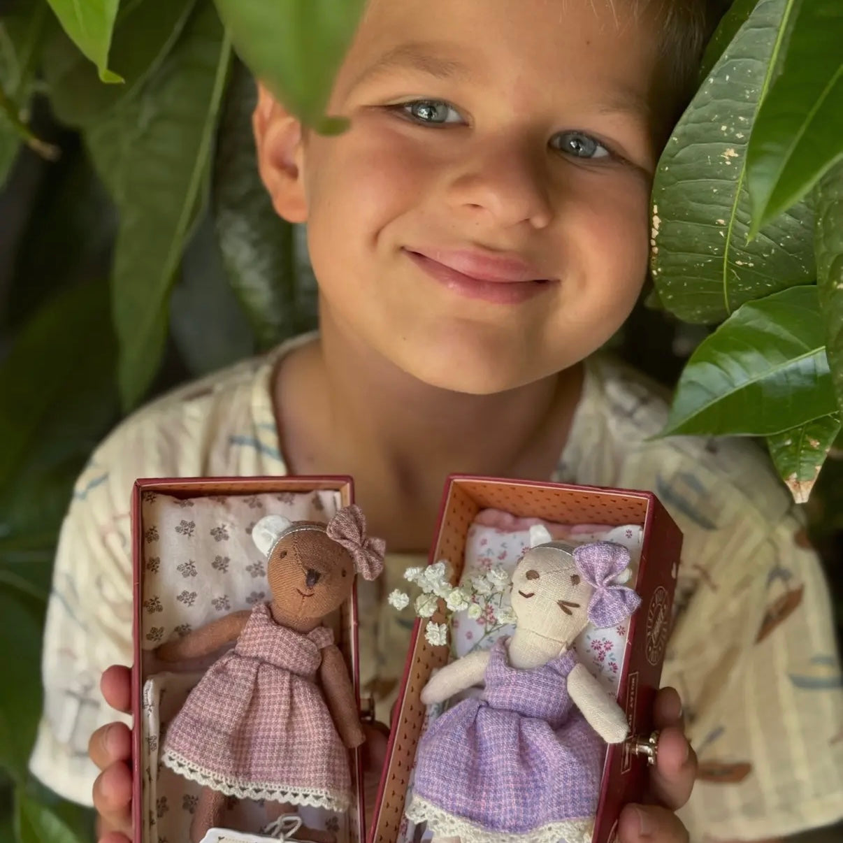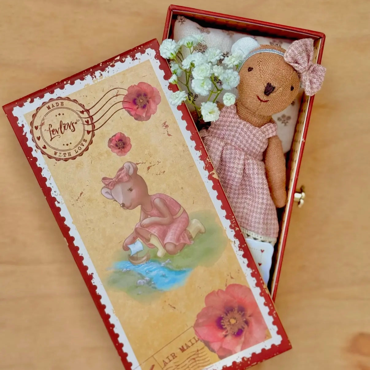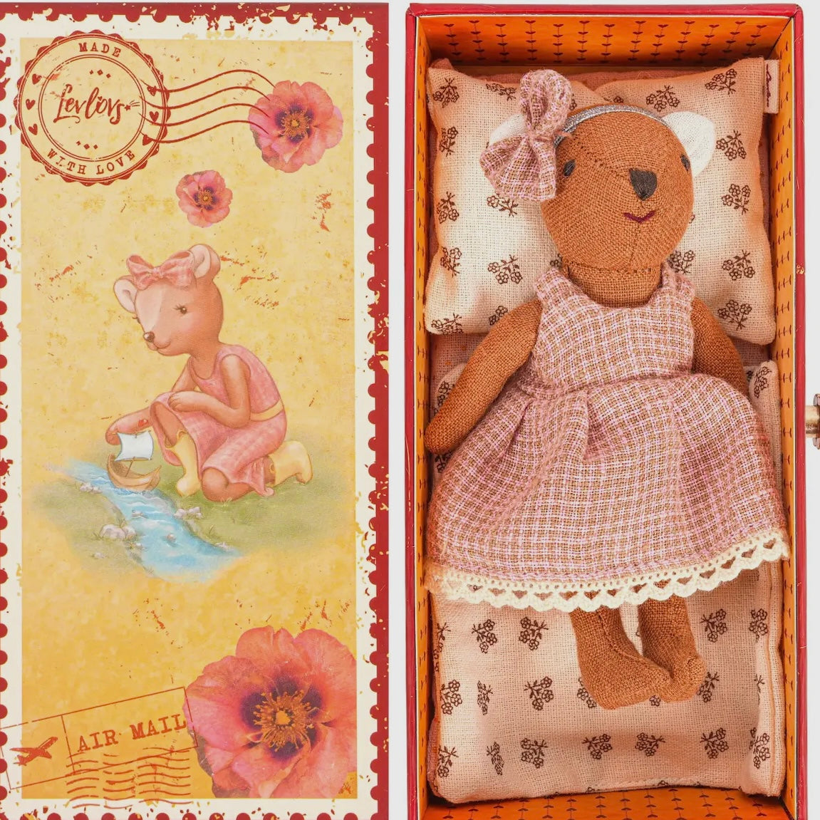 Levlovs Bear– Air Mail Dreams Edition! 🌸Whispers of water, petals, and postmarks 🌸 Tucked inside a velvet-soft bed of wildflower pillow and blanket, the Levlovs Bear waits quietly, holding the memory of a tiny paper boat and the gentle babble of a stream. She wears a rose-hued linen dress with vintage lace, a bow atop her ear like a pressed bloom in a diary. Her keepsake box is trimmed like a postage stamp, and illustrated with the sweetest watercolor moment—our bear girl sending dreams afloat on water. Includes: ✧ One gentle Levlovs Bear in a linen dress ✧ Cozy bedding with floral prints ✧ Collector’s drawer box in air mail style with golden knob Perfect for: Dreamers, nature lovers, and anyone who’s ever written a letter to the wind. 📨 Because even paper boats carry wishes.